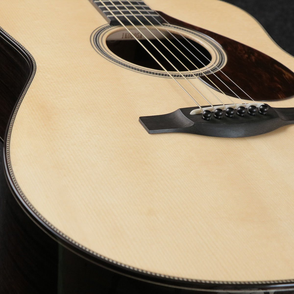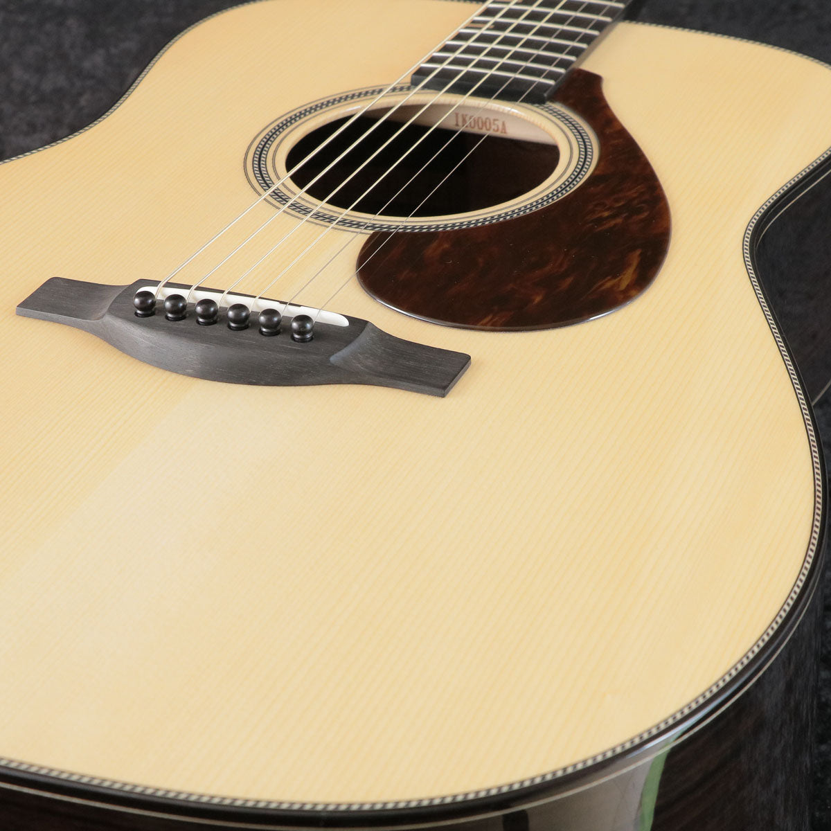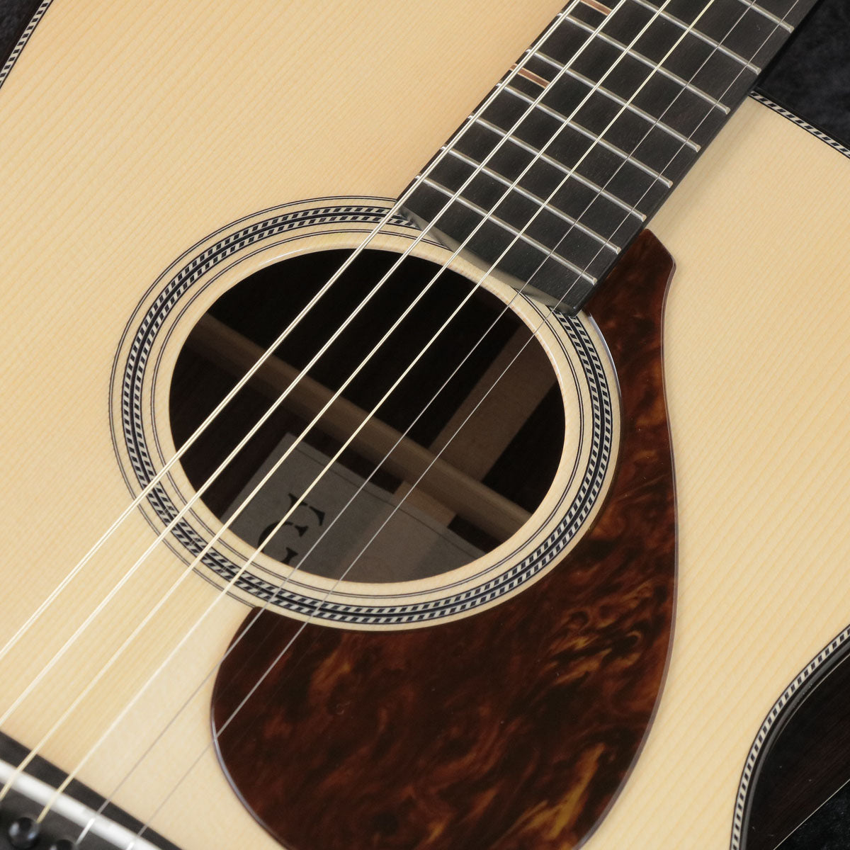 The front board is made of Adirondack spruce, a rare wood that is hard and light. The backboard is thicker to enhance its performance as a reflector, thereby strengthening the acoustic radiation originating from the frontboard. At the neck-body joint, the neck and body are bolted on in a structure that moderately separates the neck and body, and the design concentrates the vibration energy of the strings and body on the body. This design achieves both the "quick rise and powerful volume" required of the dreadnought style and the "clarity" characteristic of Yamaha's acoustic guitars. The inner label, visible through the soundhole, is made of a Japanese traditional lacquer.