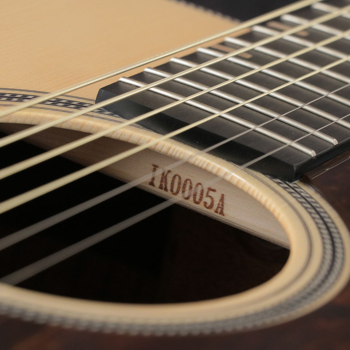 サウンドホールから見える内ラベルには和紙を使用し、ポジションマークには組木細?を感じさせるデザイン、サウンドホールとボディのラインには日本伝統のしめ縄を思わせるロープインレイとロープバインディングを施しました。