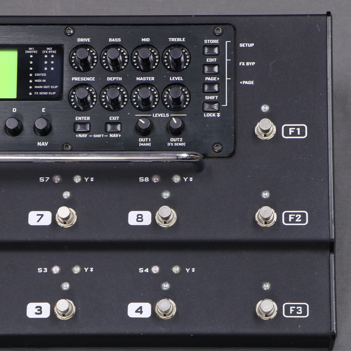 23種、31個のエフェクトブロックにAxe-Fx IIと同等のアンプ及びキャビネットモデルを搭載。 アンプのパラメーターをアナログ感覚で操作できるLEDリングノブ、ファンクションを自由に設定できる8つのフットスイッチとのコンビネーションで抜群のサウンドクオリティとポータビリティを実現しました。