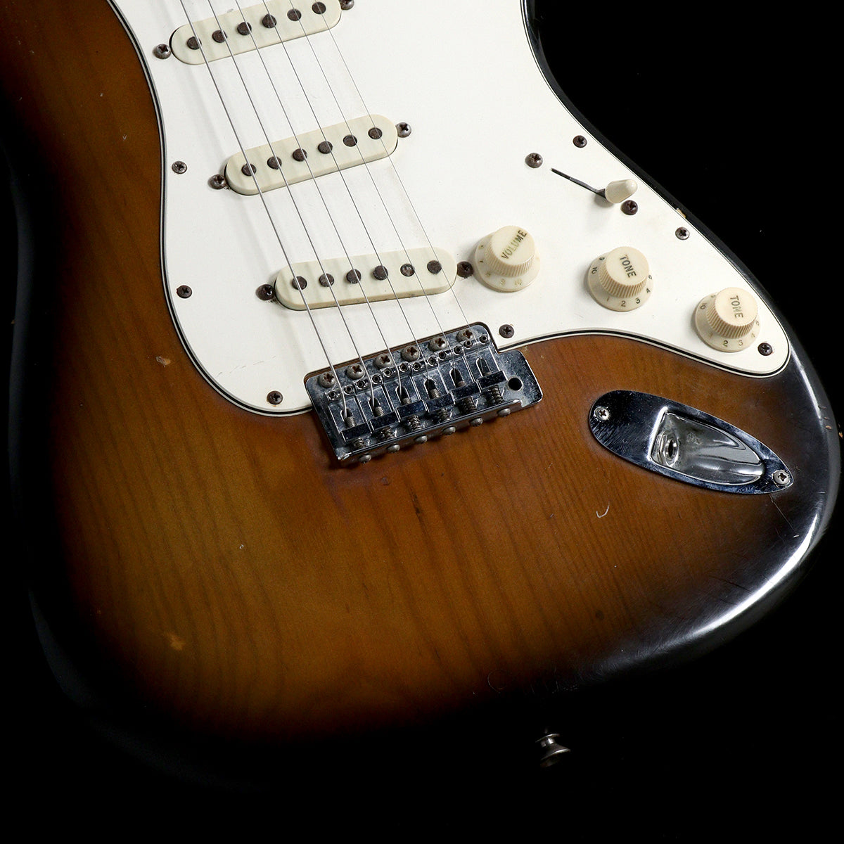 This 1975 Fender Stratocaster was made after Fender was acquired by CBS. The large head has a truss rod adjustable bullet from the head side.