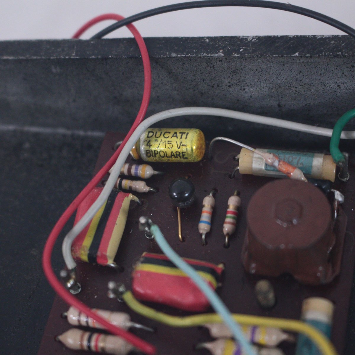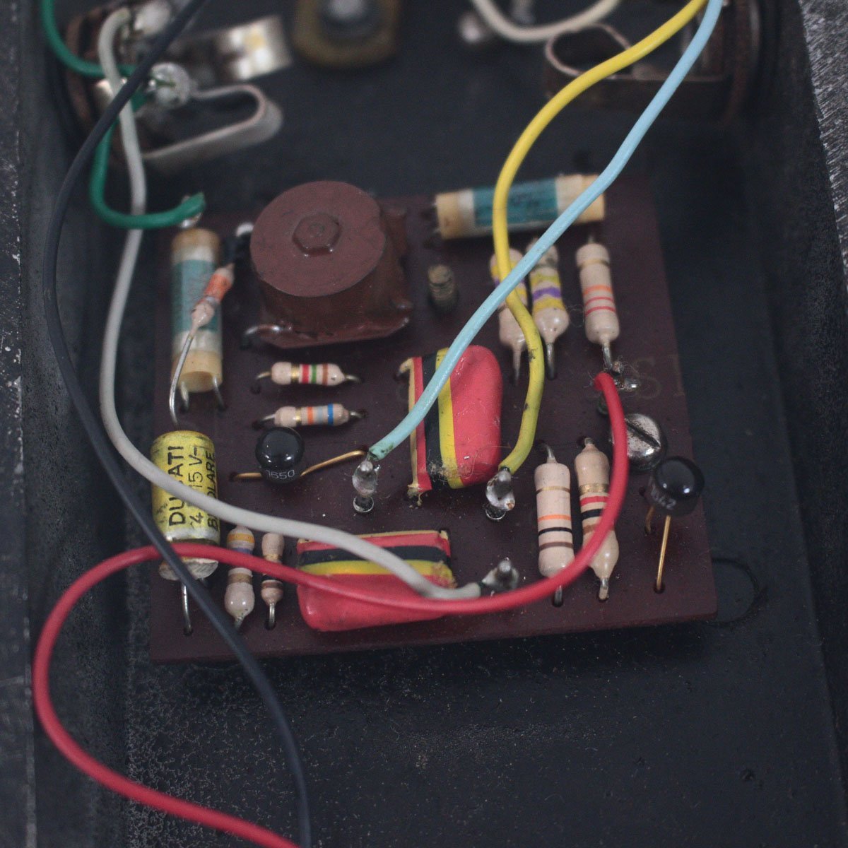 This unit uses ICAR pots, Stack Of Dime inductors, Mullard / Tropicalfish, DUCATI capacitors, and SGSIW98021650 and SGSIW98011642 transistors.