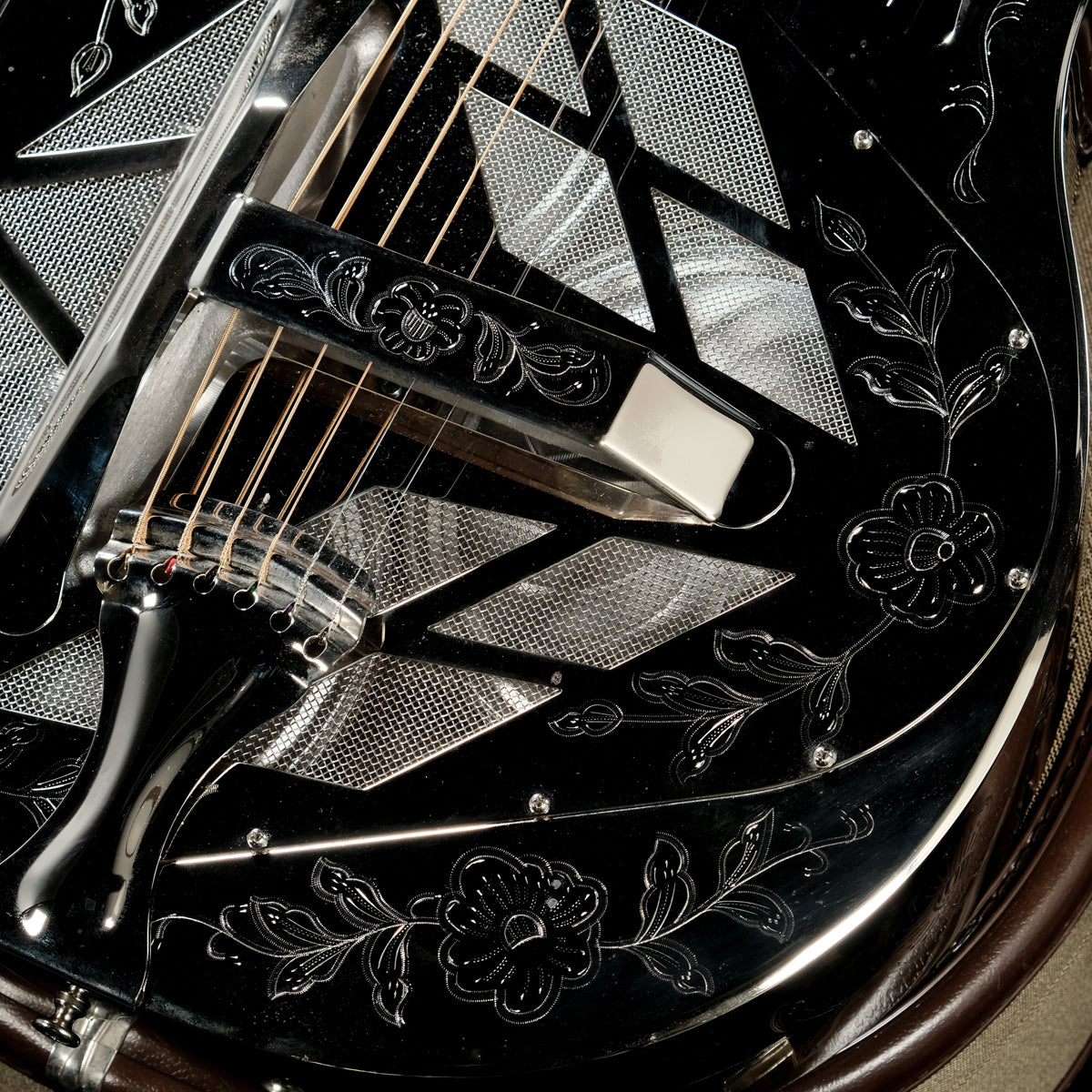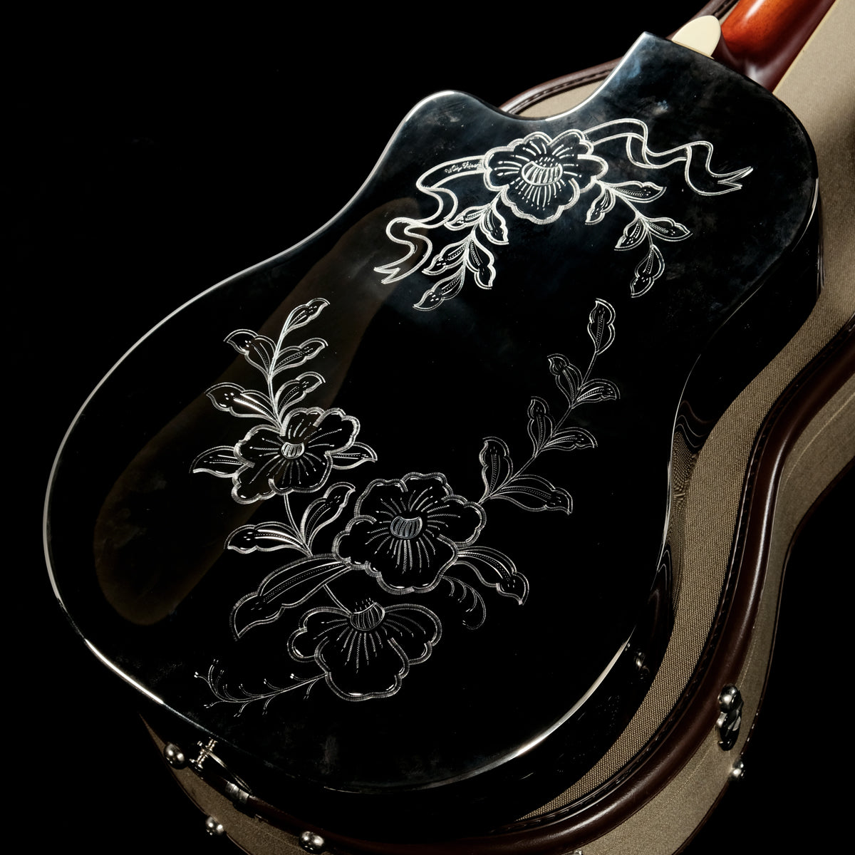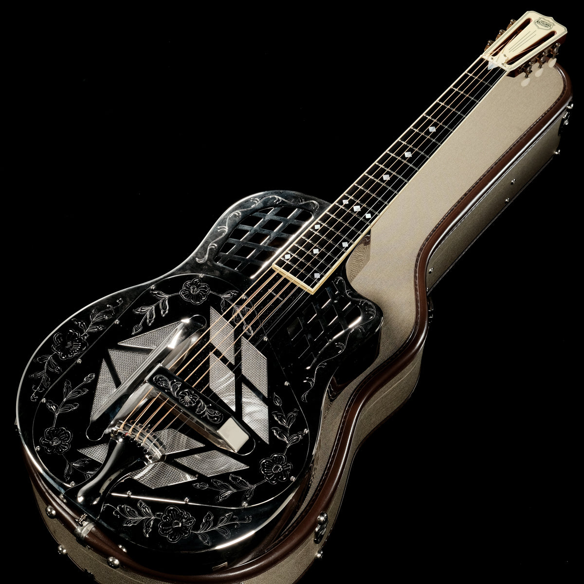 本器は国内流通も希少なカスタムオーダー品、"National Custom"の一本。一般の仕様には無い、ボディ全面に施された鮮やかな彫刻や指板のテトラゴン・インレイなど前オーナー様の拘りが詰まったStyle2です。