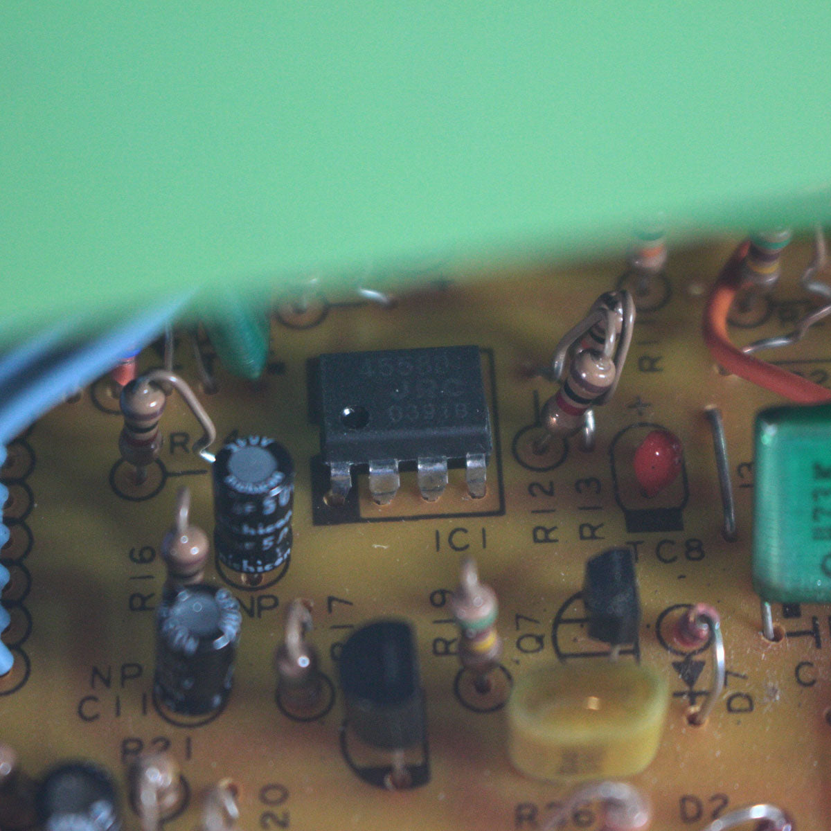 The op-amp is a glossy JRC4558D, and the switches are brown.