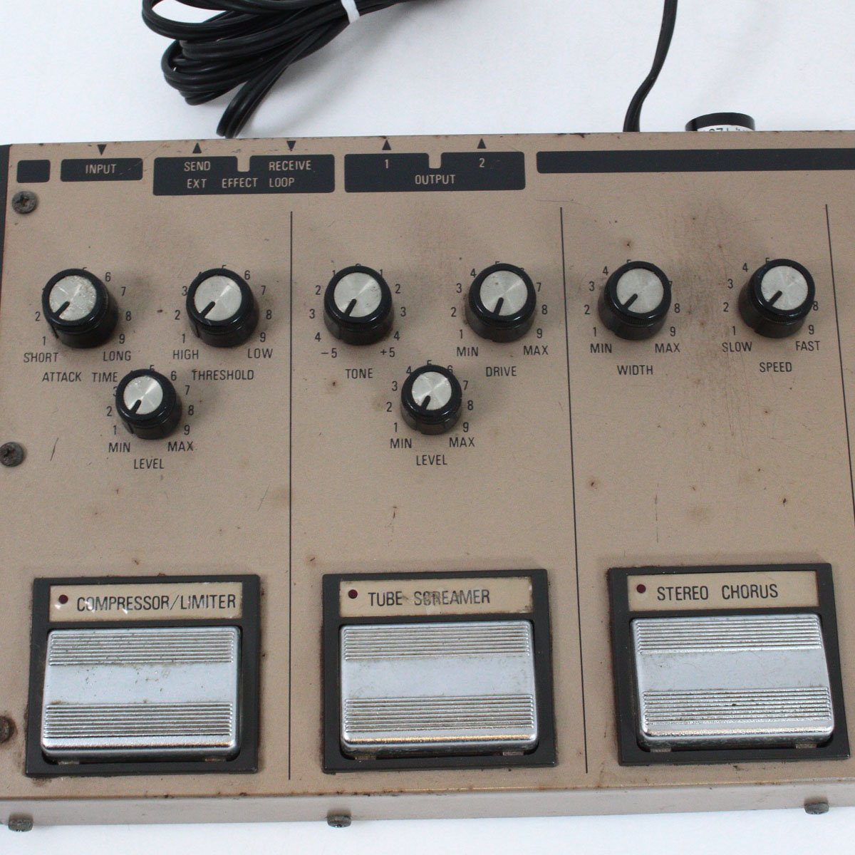 接続順はコンプレッサー、オーバードライブ、コーラスとなっており、オーバードライブとコーラスの間にSEND/RETURN(RECEIVE)に繋いだエフェクトを差し込むことが可能です。