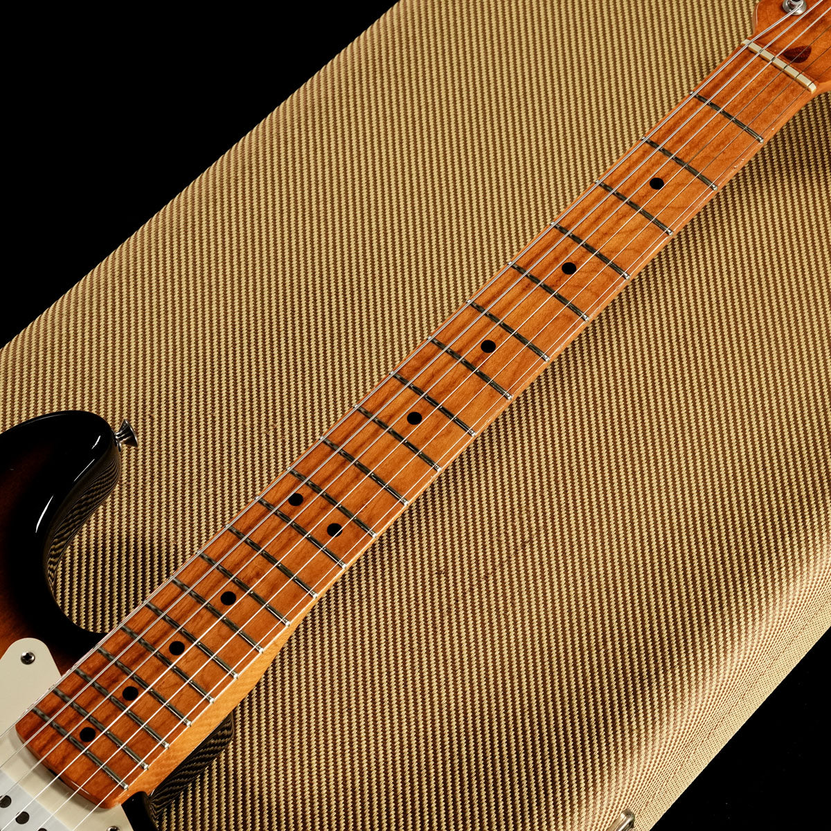 1957年仕様のストラトキャスターを再現したモデル。アルダーボディにメイプルネック・指板の仕様です。ピックアップは交換されており、現在lollar pickups specialが3機搭載しています。コンデンサー交換、セレクター交換(5Way)がございます。