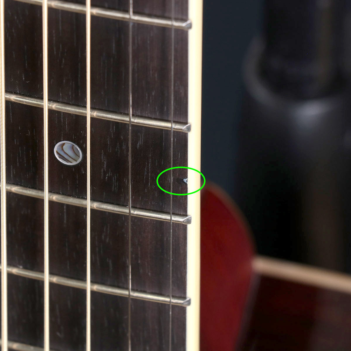9フレット付近の指板に気泡穴、ボディトップ6弦側バインディングに凹みがあるため、通常よりお安く販売しております。