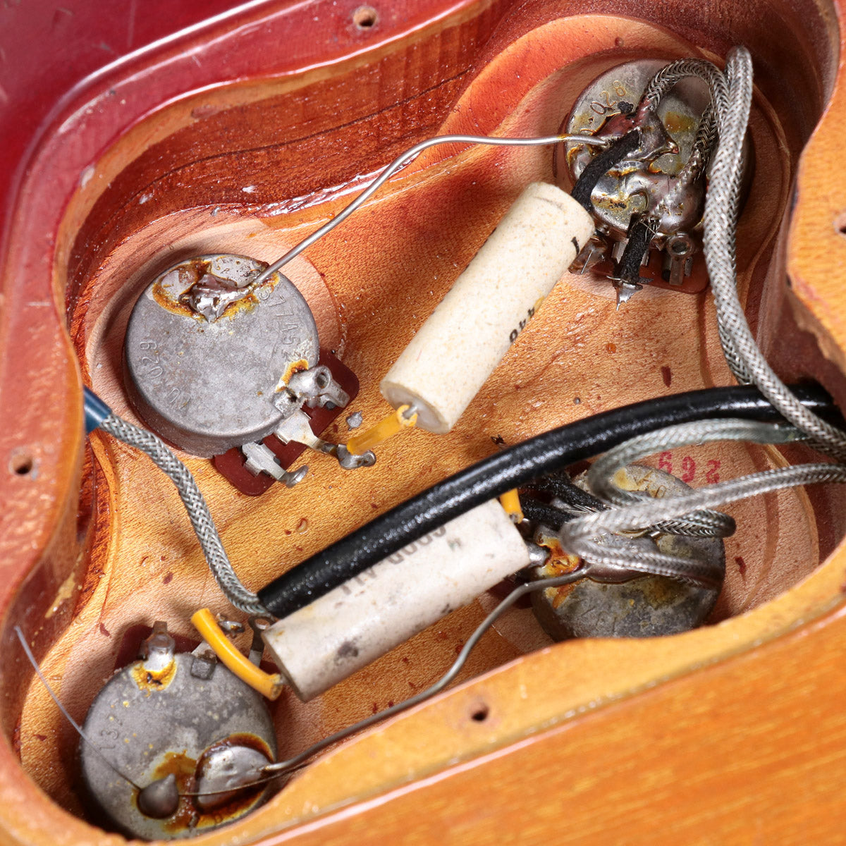 The original jack/selector/pots have been cleaned of any galling as much as possible. The purple inner hard case has had the handle replaced and has exterior peeling.