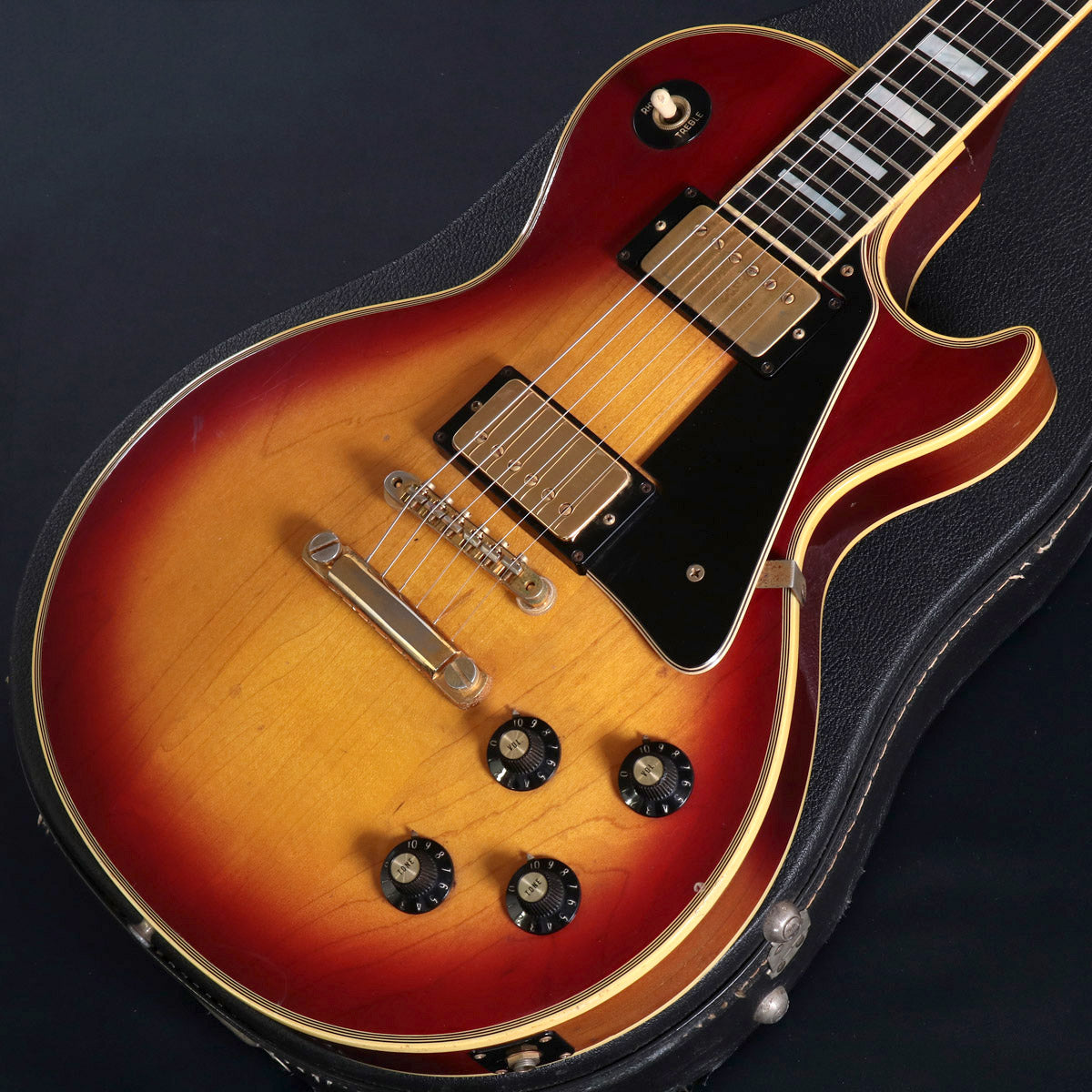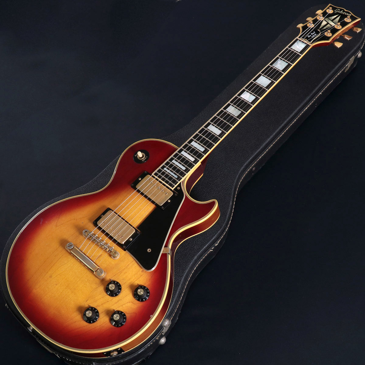 ギブソン・レスポール・カスタム、1975年製(フロントPUキャビティ内にAUG 13 1975 Cスタンプ)です。所謂「パンケーキ・ボディ」はメイプル・トップ/マホガニー・バック、ボリュート付き3ピース・マホガニーネック、エボニー指板、クルーソン・ワッフルペグ、フレットは元来細身で低めタイプになっています。