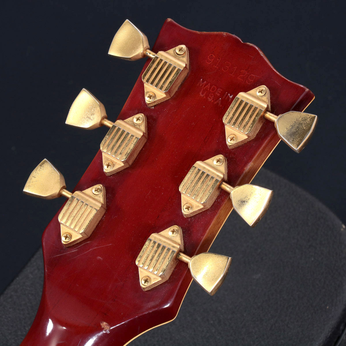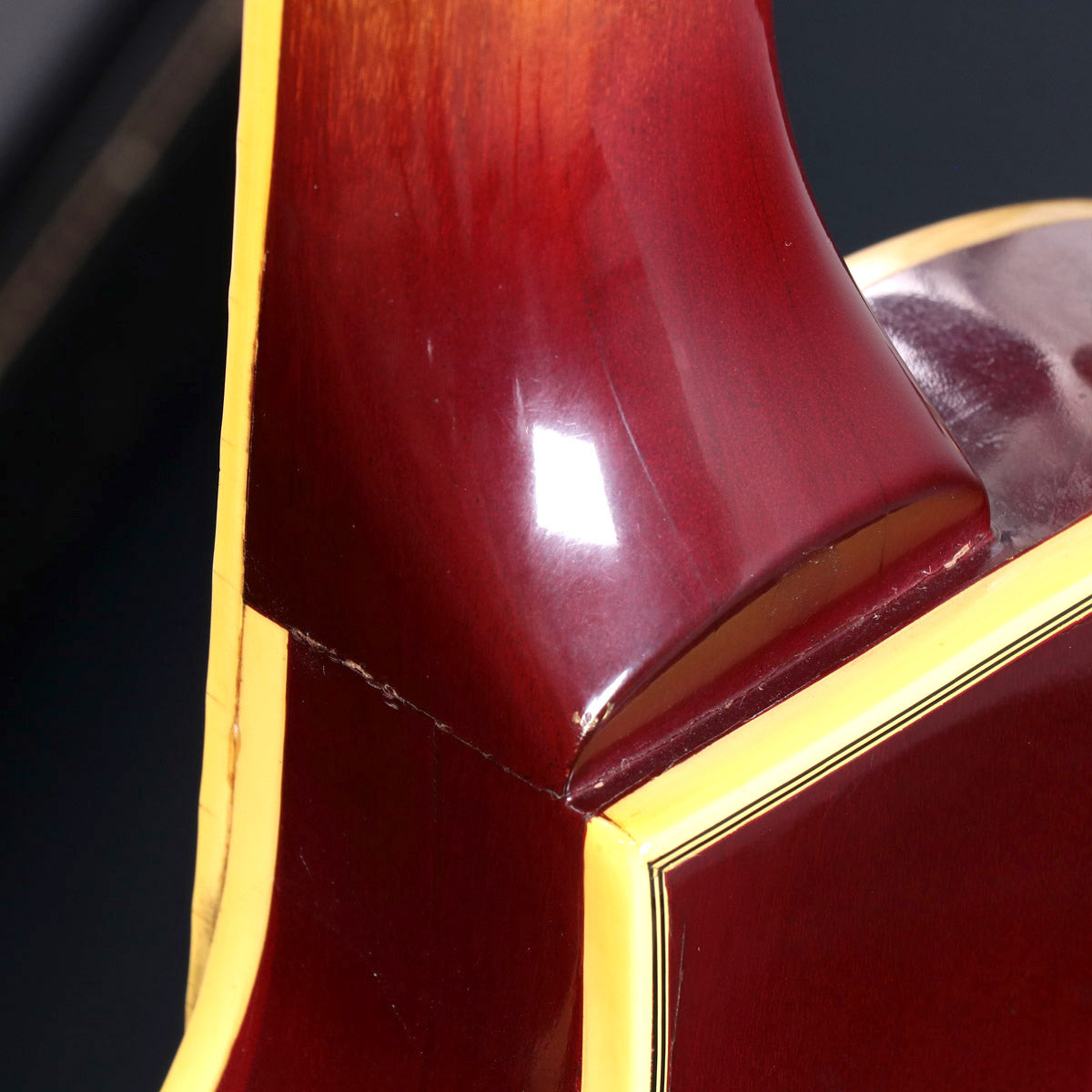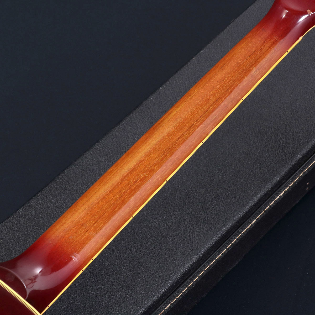 リアPUカバーは外した状態で使用されていたためフロントPUカバーとコンディションが異なっています。ズレて接着されていたナットは定位置に戻しています。ペグは各々動作トルクが異なります。年式相応に風格あるルックスの色焼けやバインディングのクラック、複数の打痕、小キズやひっかきキズなどが見られます。