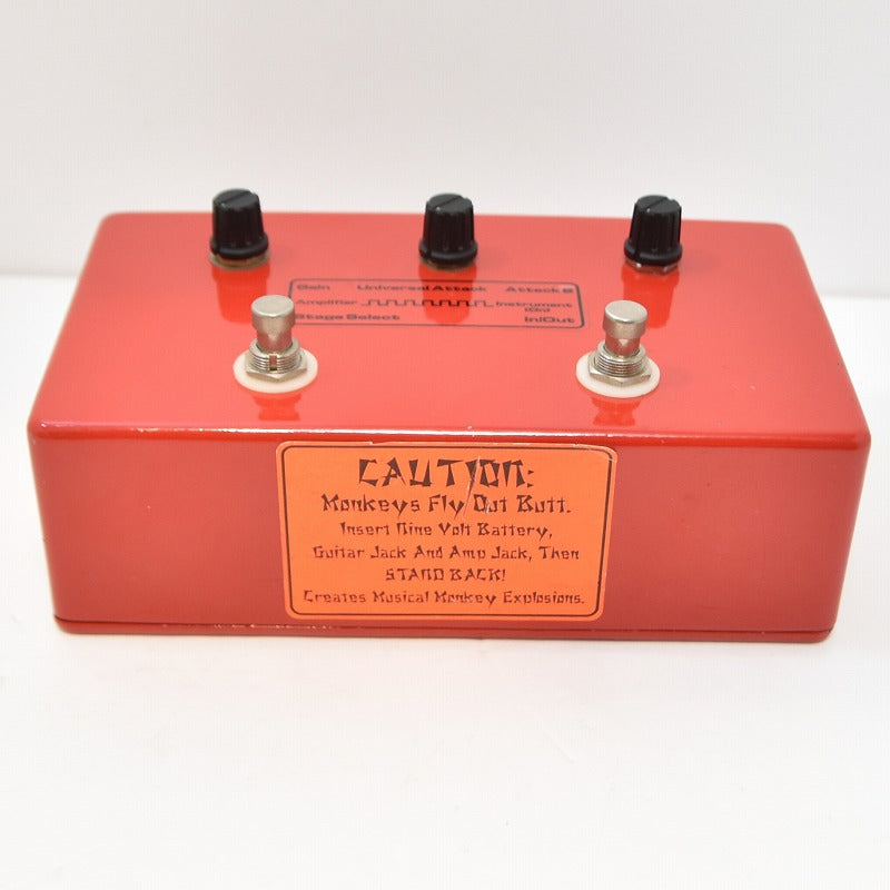 The controls are volume, gain, and universal gain, and turning the left switch on further distorts the sound.