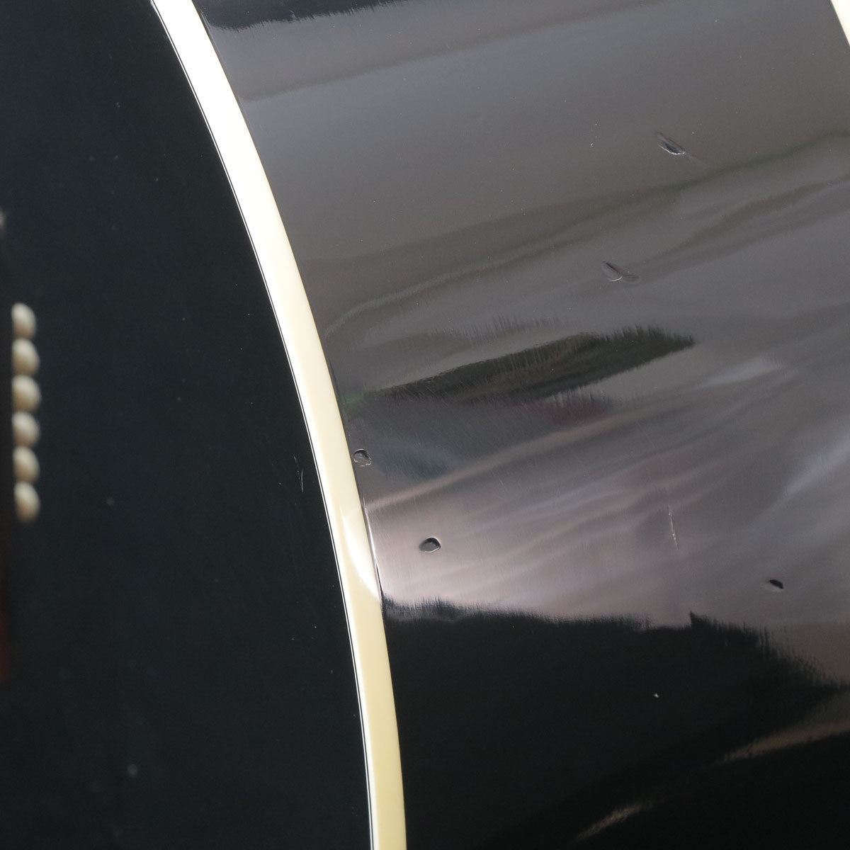 ボディ・エンド中央に、トップ面やバック面とほぼ並行して、断続的ではありますが総延長14~15cmに渡る横長の塗膜のクラックが発生しています。またバック寄りにはそこまで長くはないですが2本の塗膜のクラックが発生しています。打痕、擦り傷、ベルト・バックル傷、塗膜の曇りや劣化、金属部品のくすみも散見されます。