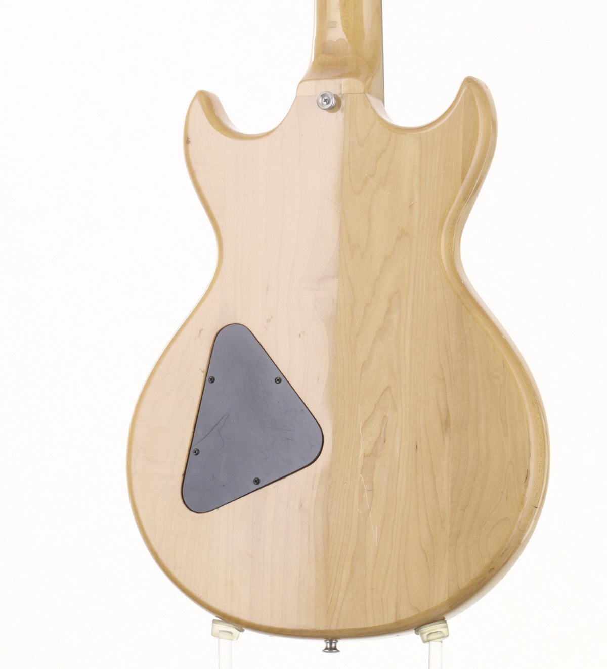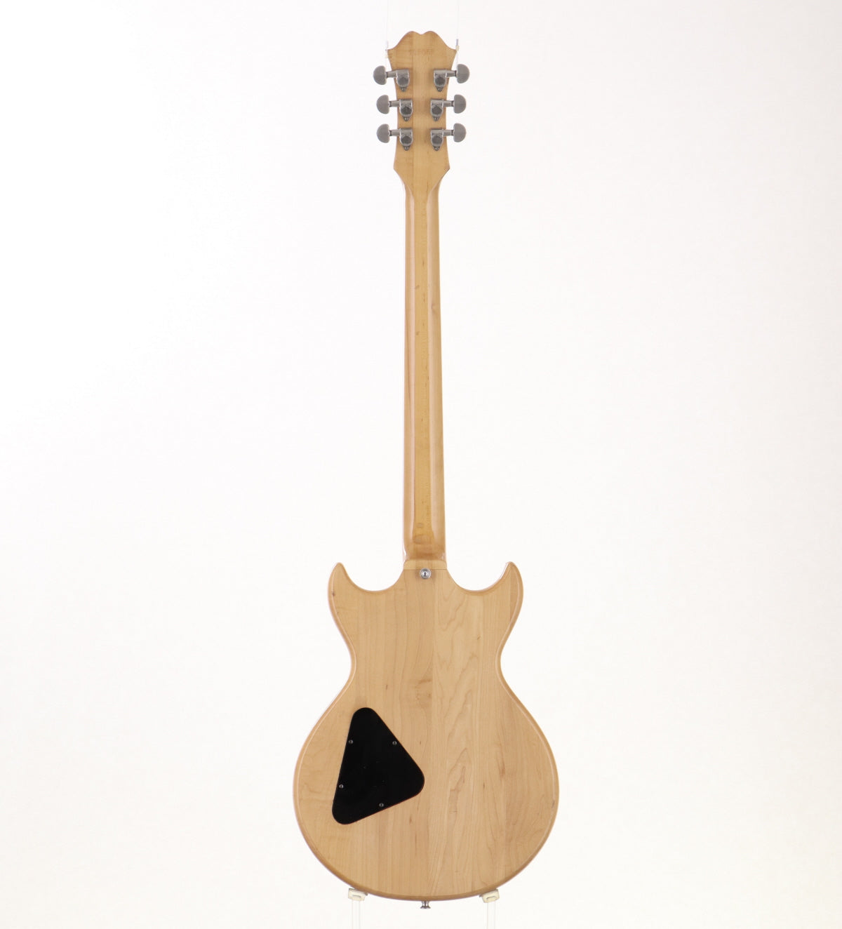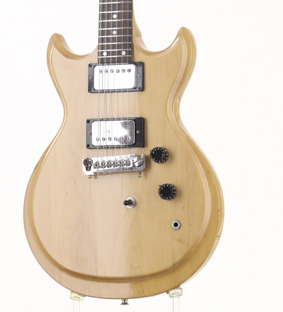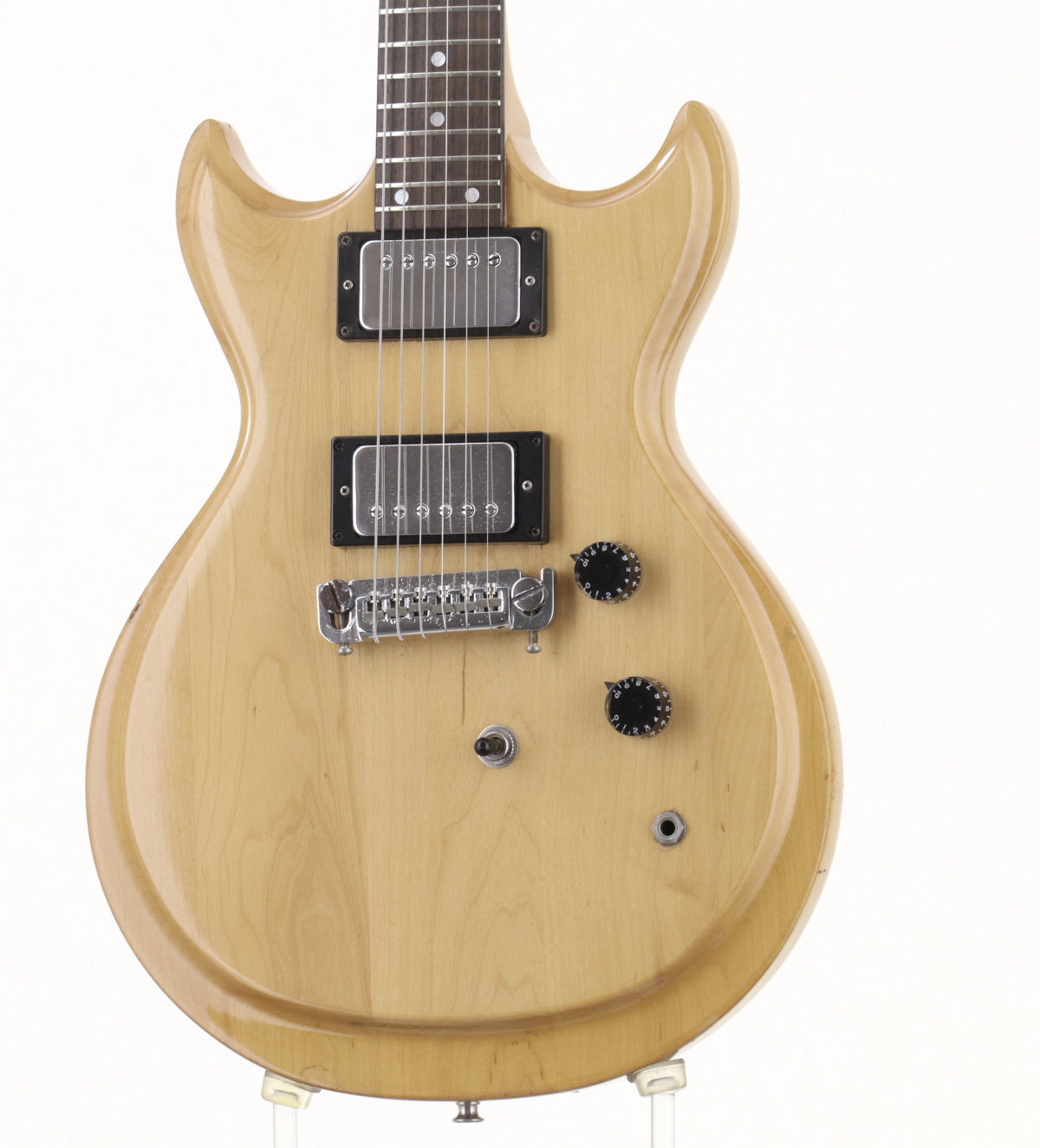 ボディ材はメイプル、メイプルネックのセットネックでローズウッドフィンガーボードを採用、オリジナルハムバッカー2基搭載、フロントエスカッションが交換されております。