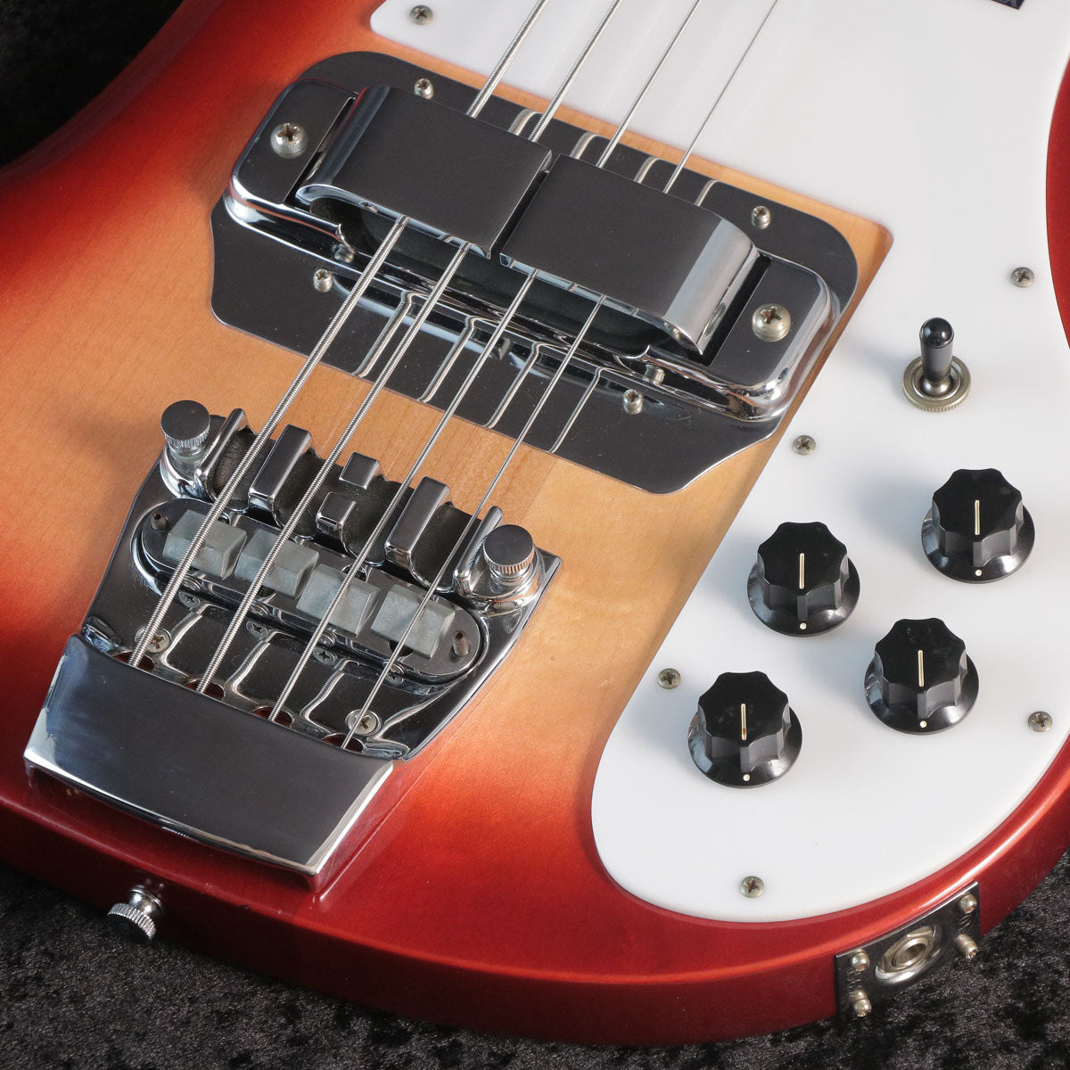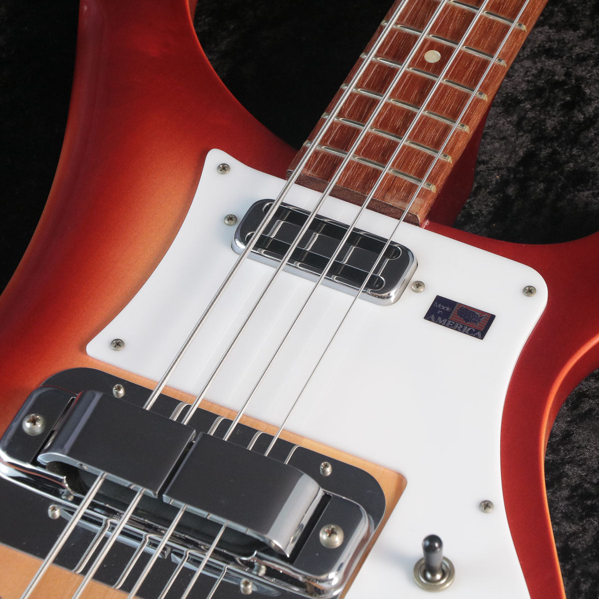 ジャックプレートに記されたシリアルは「01 05692」と2001年製であることを示しています。Rickenbackerの年表を参照する限り4001V63の製造は2000年まで、2001年以降は4001C64を製造となっていますが、国内代理店よりジャックプレートが交換されていなければ4001V63モデルで間違いないだろうとのことでお答えいただきました。交換の有無を判断する術はありませんが、見たところそういった形跡もなく、おそらく当時出荷が遅れた個体ではないかと推察しております。