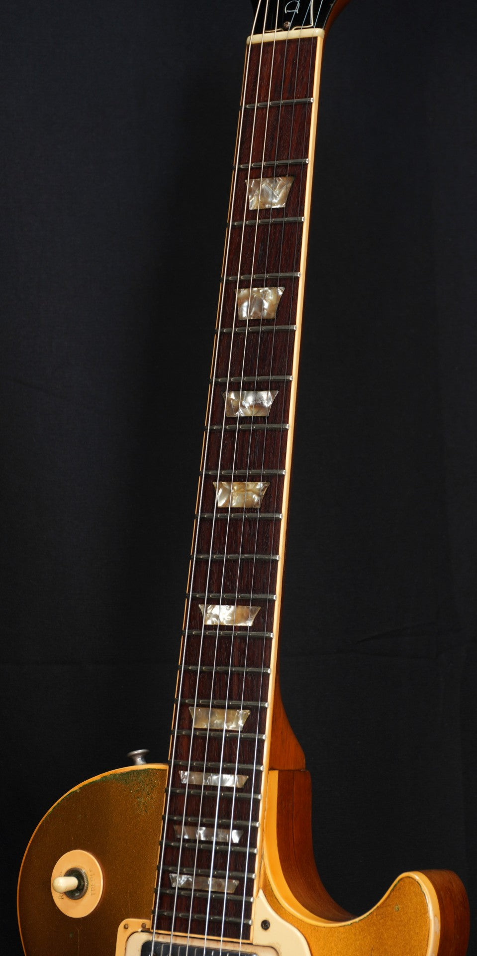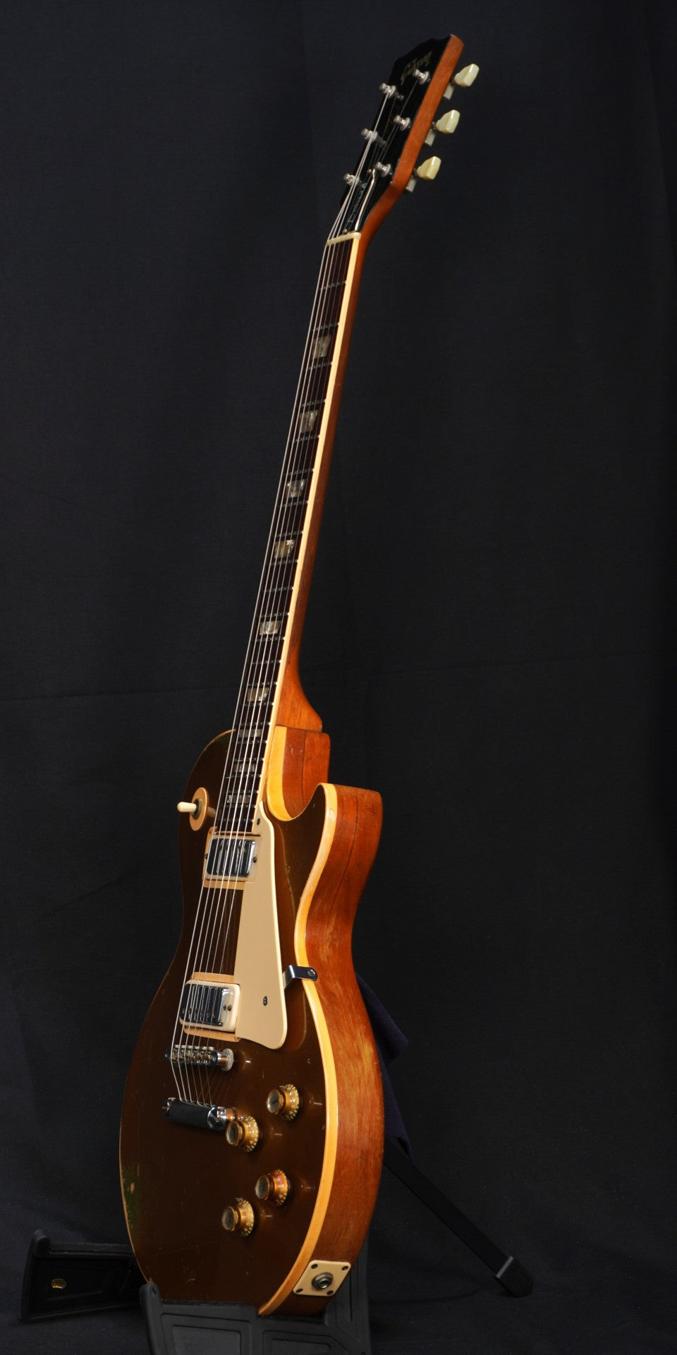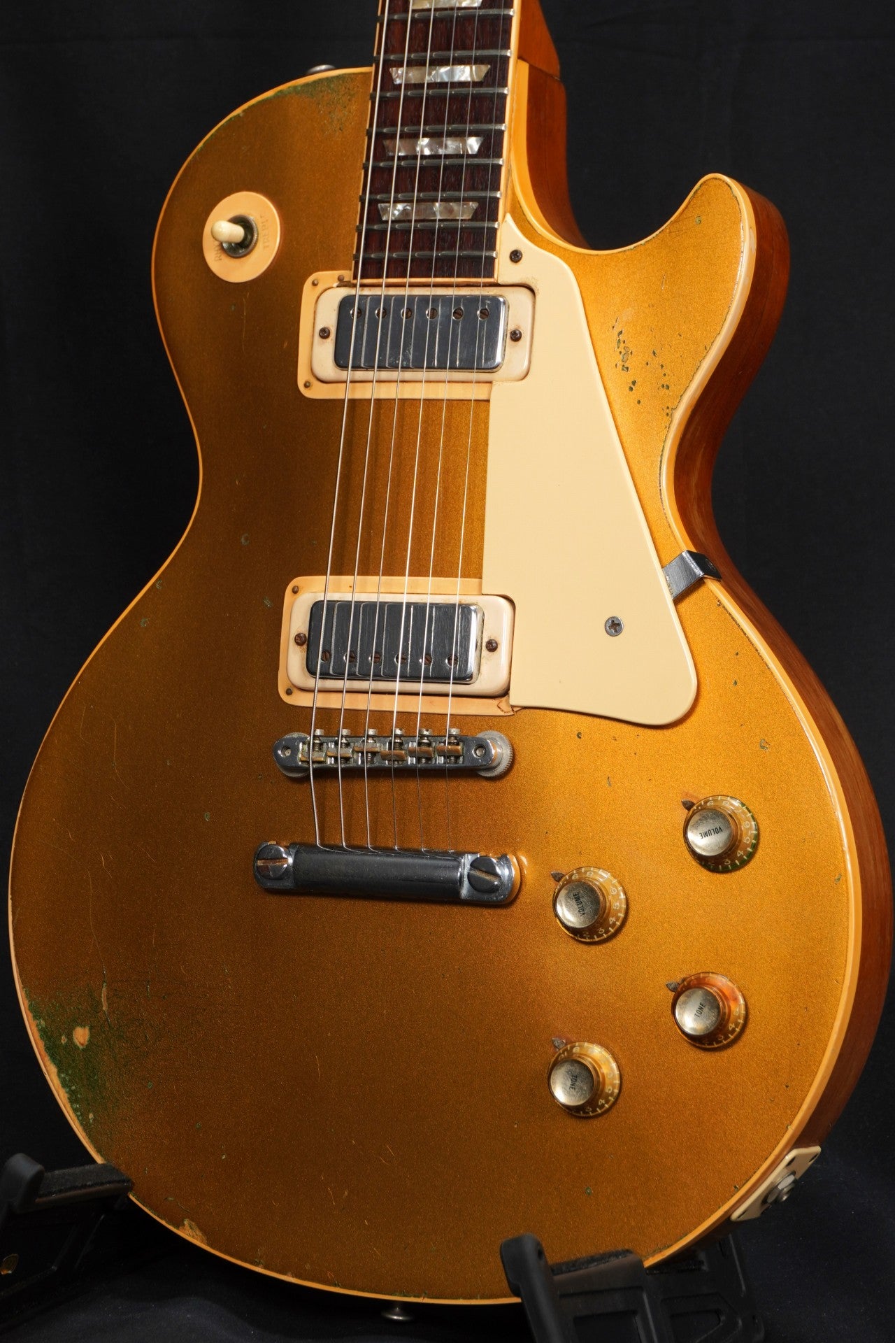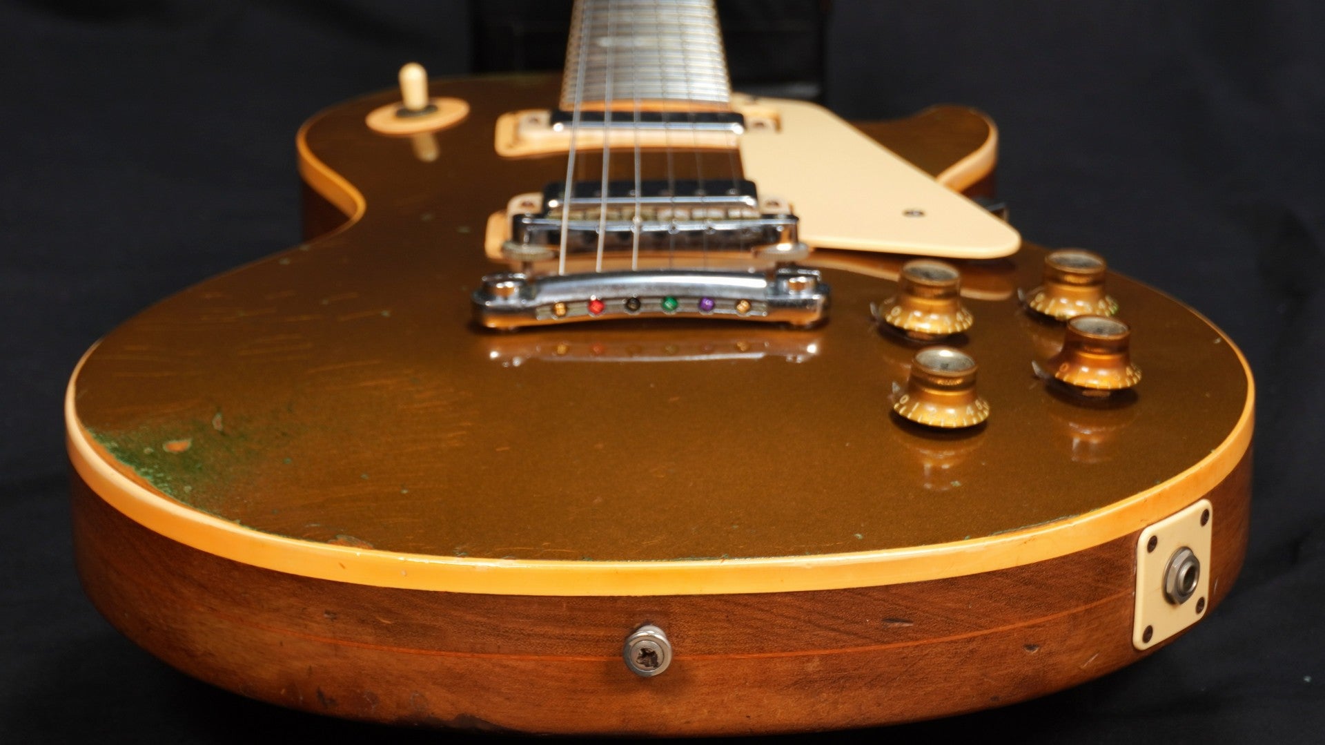 70sらしい重量感のあるパンケーキ・ボディ、ゴールドトップには緑青も出ておりヴィンテージ・ギターらしい貫禄も楽しめる一本。