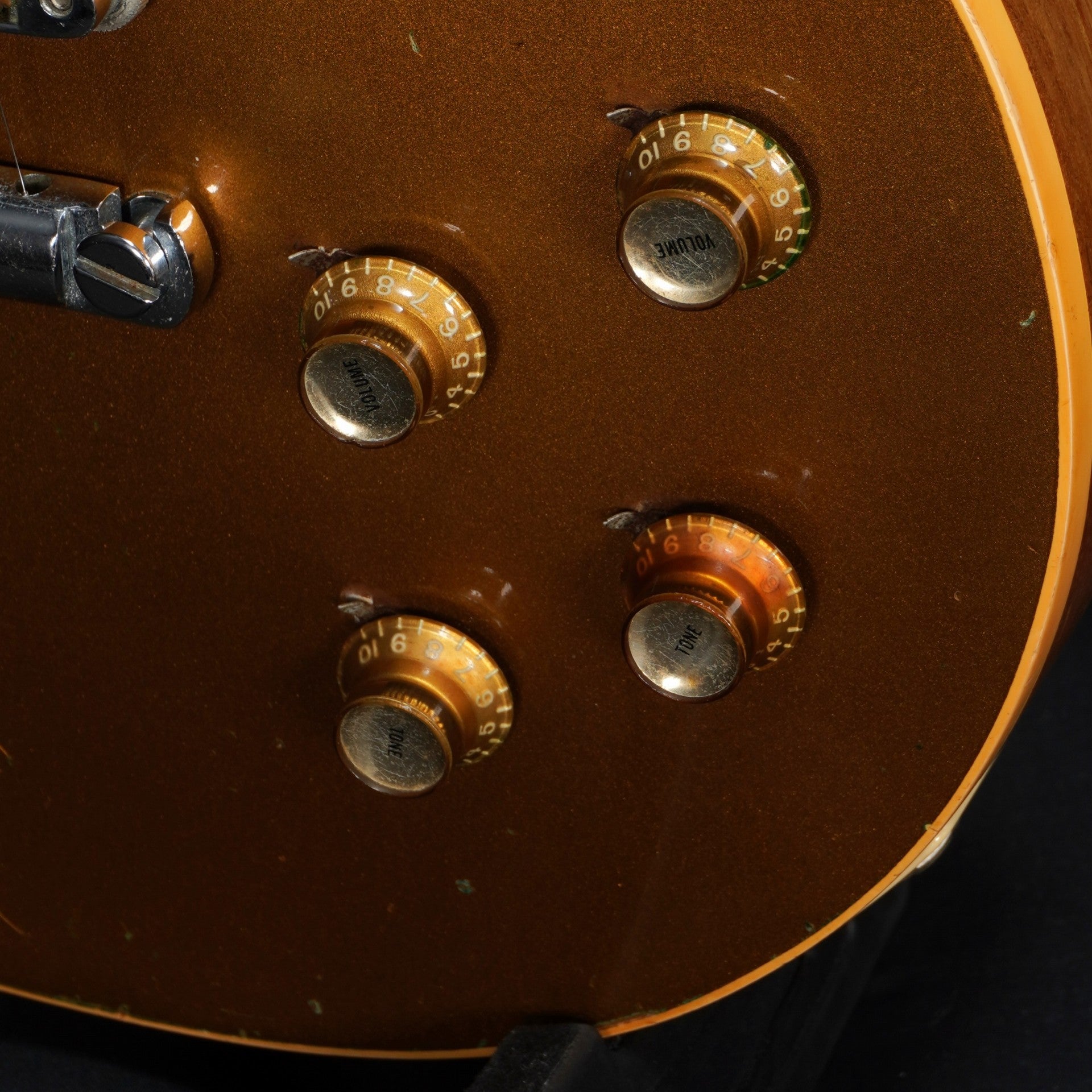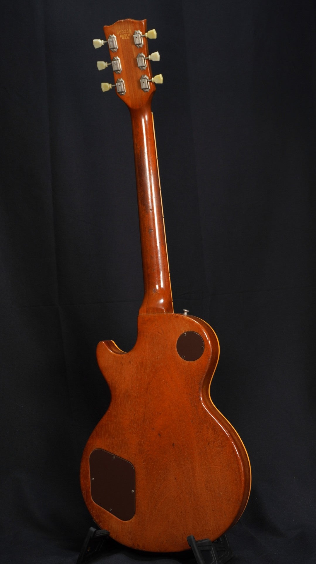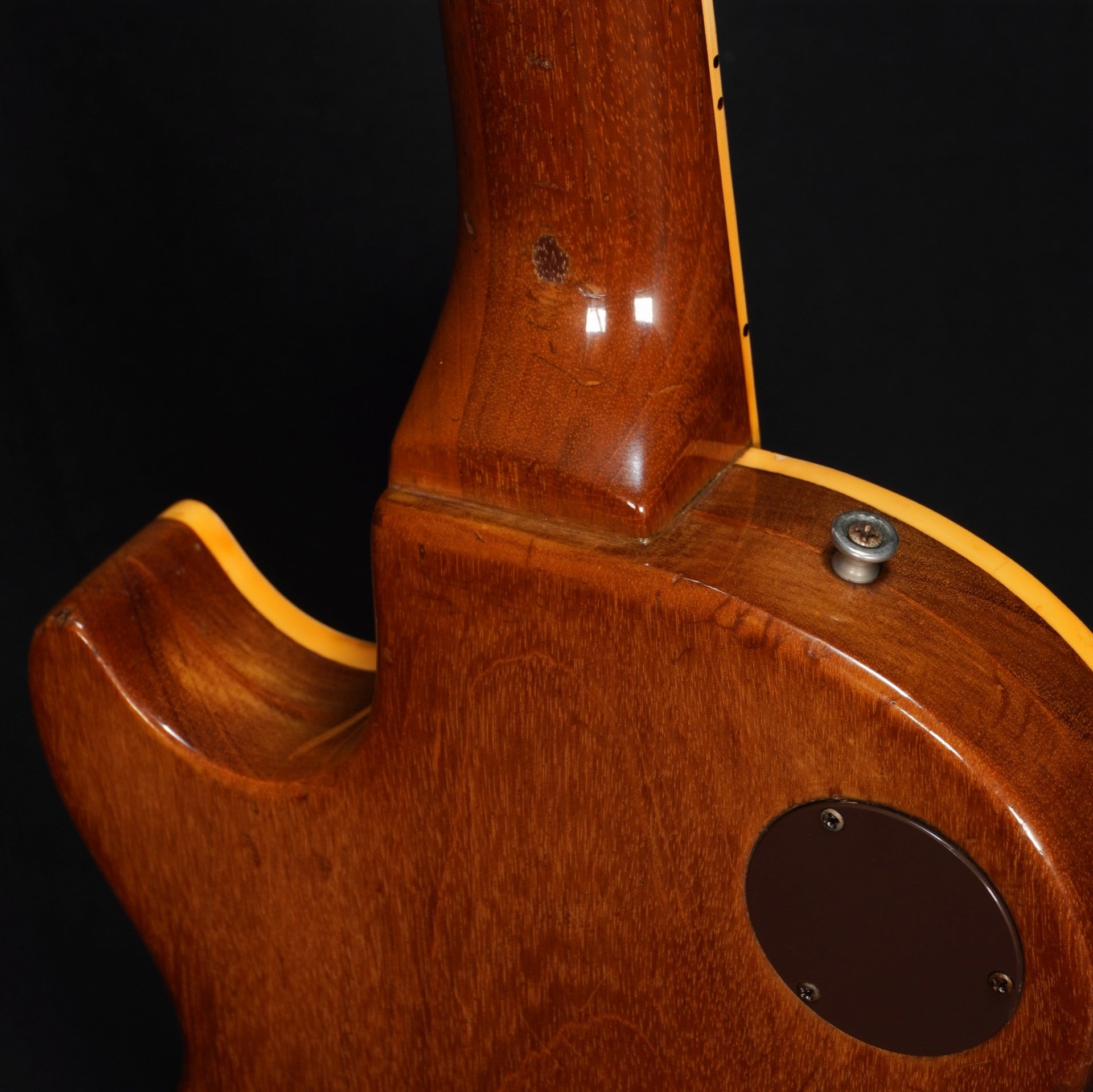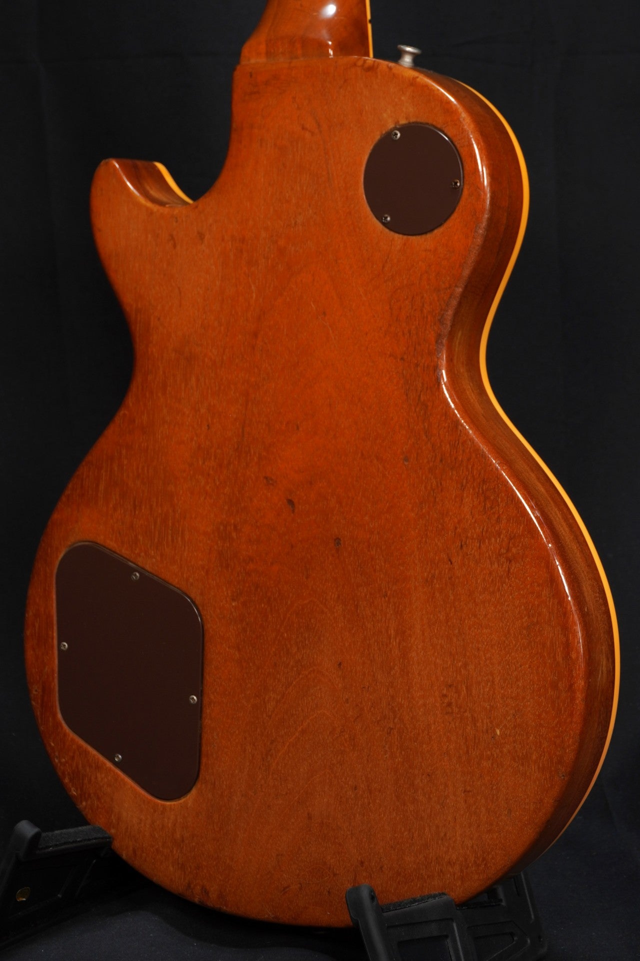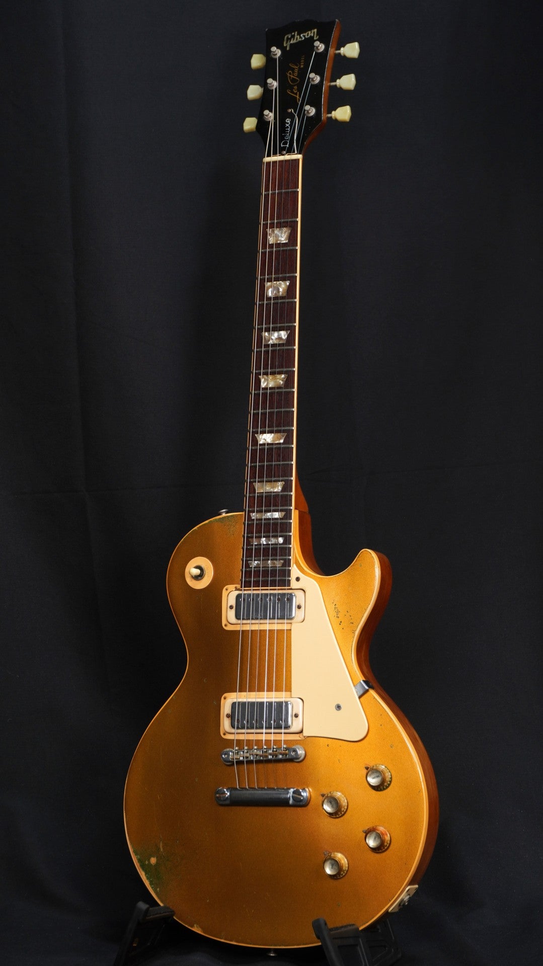 70sらしい重量感のあるパンケーキ・ボディ、ゴールドトップには緑青も出ておりヴィンテージ・ギターらしい貫禄も楽しめる一本。
