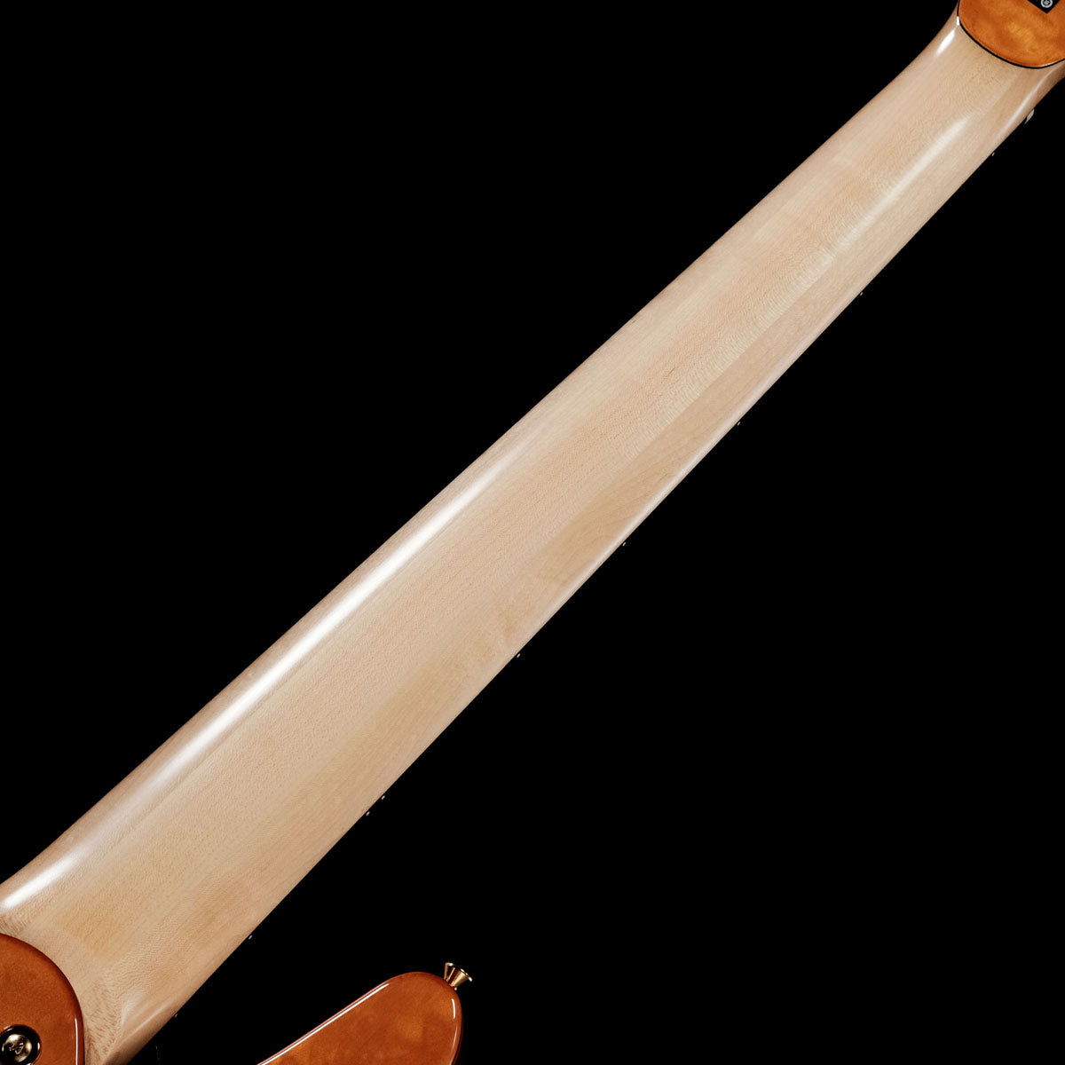 To cope with the stresses placed on the neck due to the increased tension caused by the scale increase, a volute (*) has been added to the back of the head and quilted maple has been applied to the neck to improve neck strength.