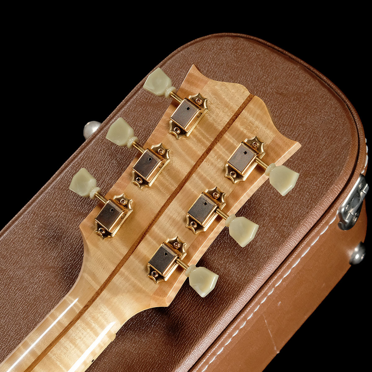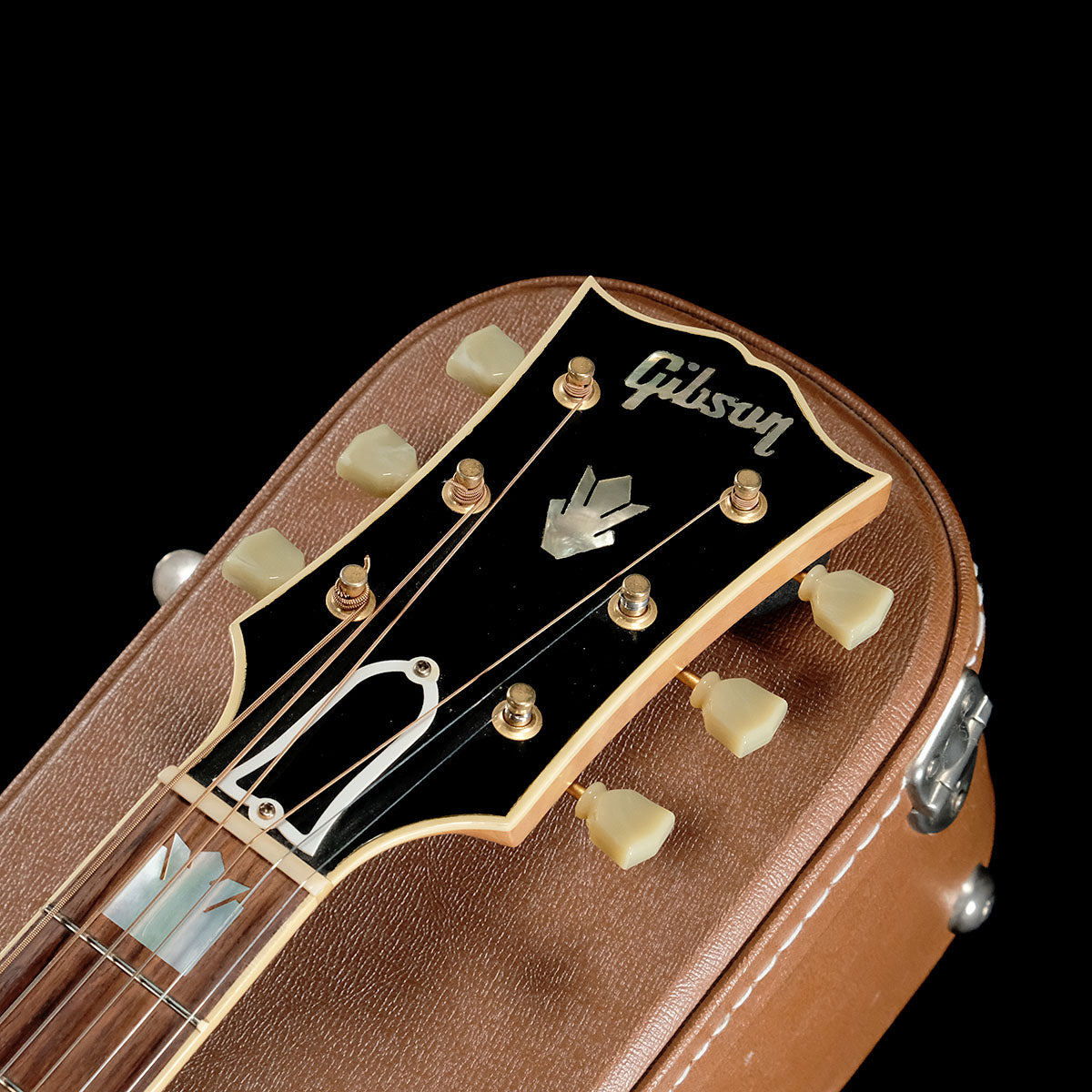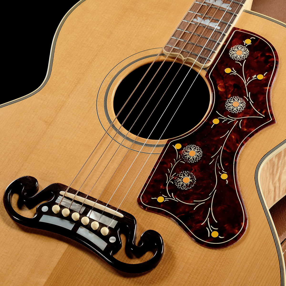 口髭のような特徴的なデザインのマスタッシュ・ブリッジ、華やかなピックガード、マザー・オブ・パールのGibsonロゴ、クラウン・ヘッド・インレイ、クラウン・ポジション・マーク・インレイなど豪華な装飾で正にキングの異名に恥じない存在感の1本です。