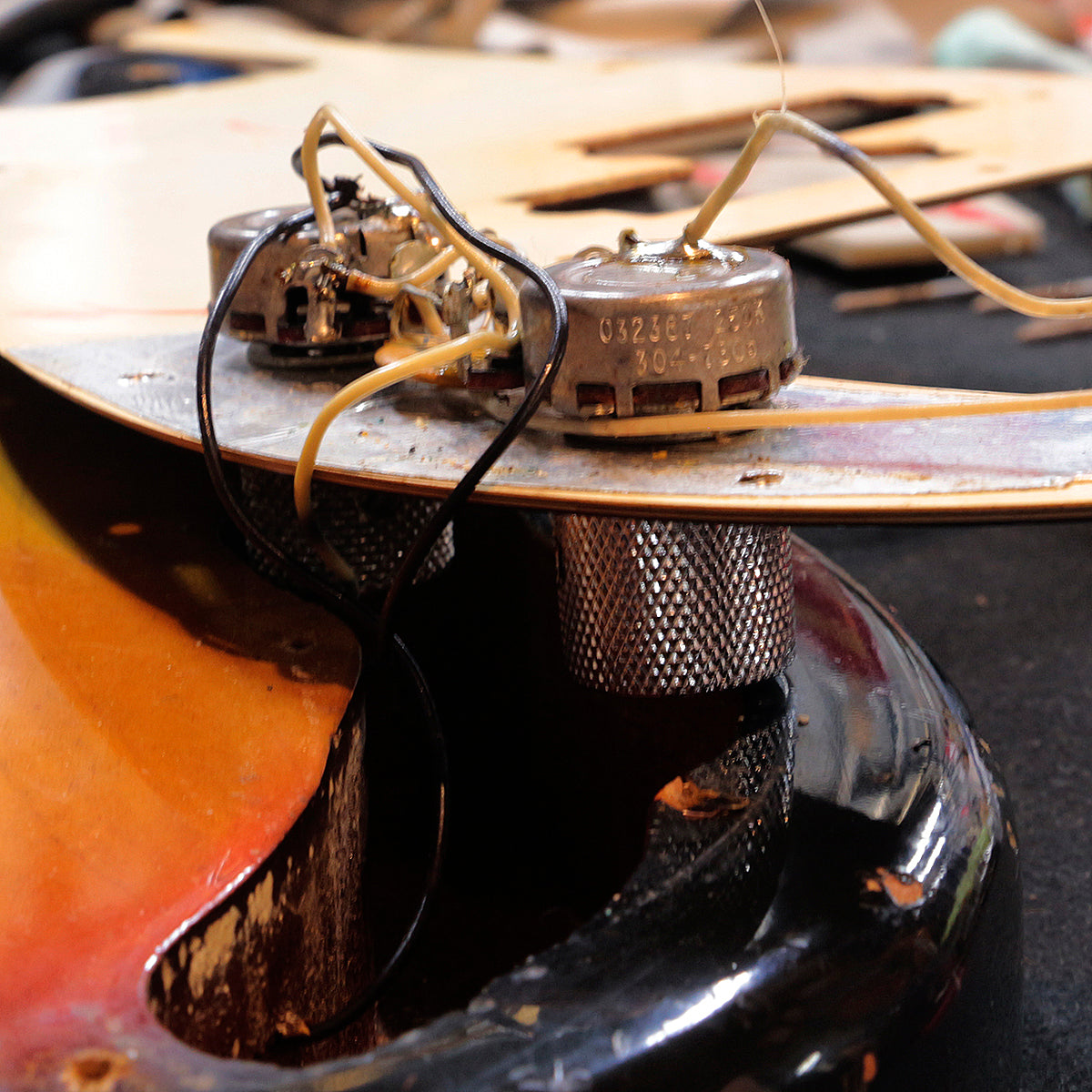 グレイボビンピックアップ及びPOTコンデンサオリジナルでファラッド.05 100 サークルDを搭載しております。トーンノブが交換されています。
