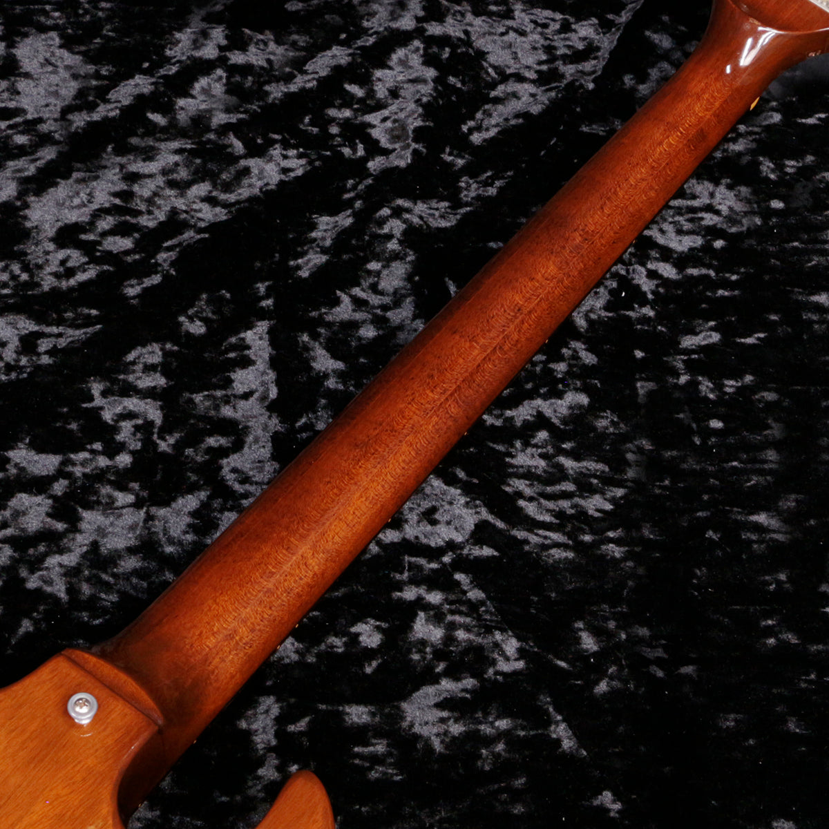 WALNUTカラーの渋い1本、マホガニーボディにボリュートありのメイプル3Pネック/ローズウッド指板の組み合わせ。