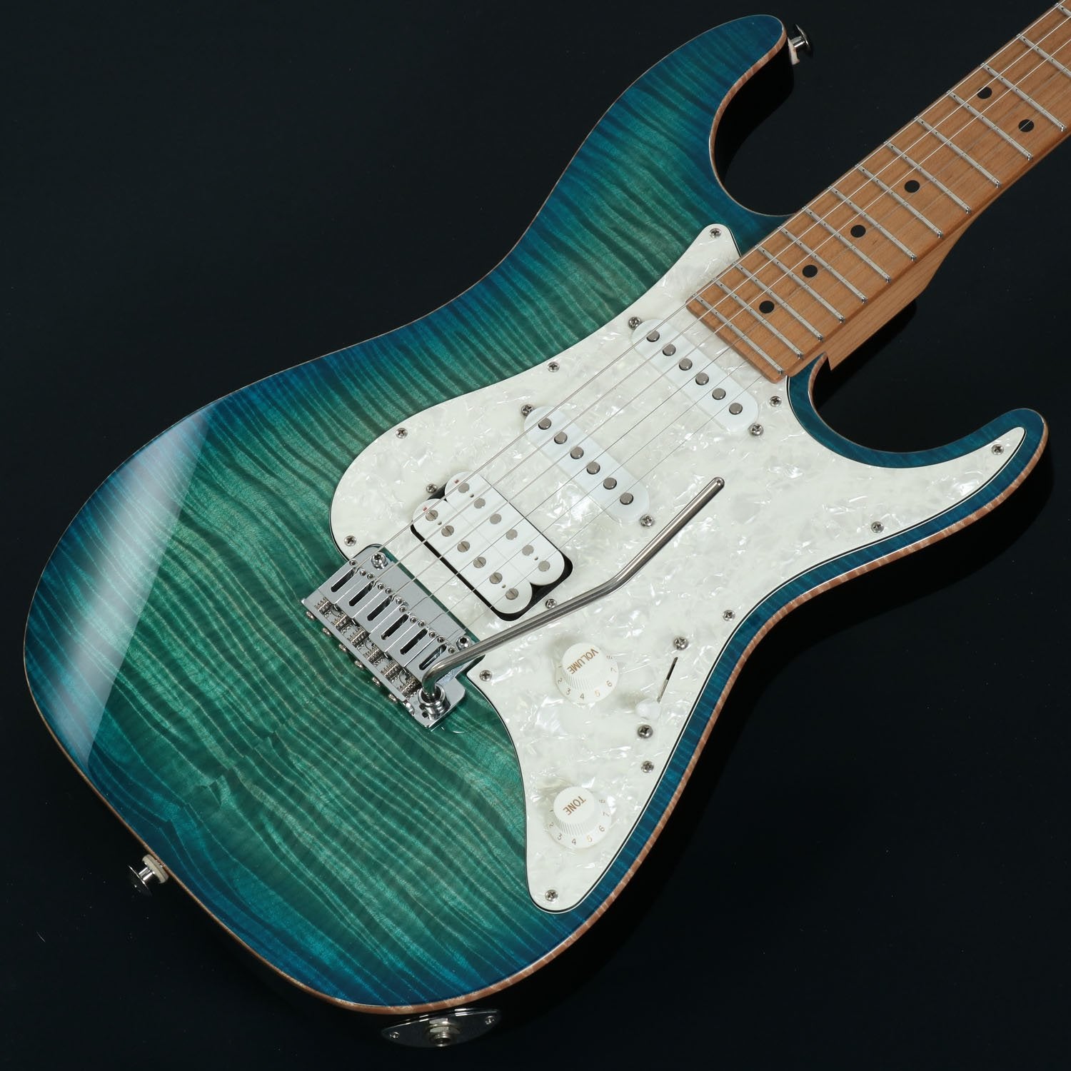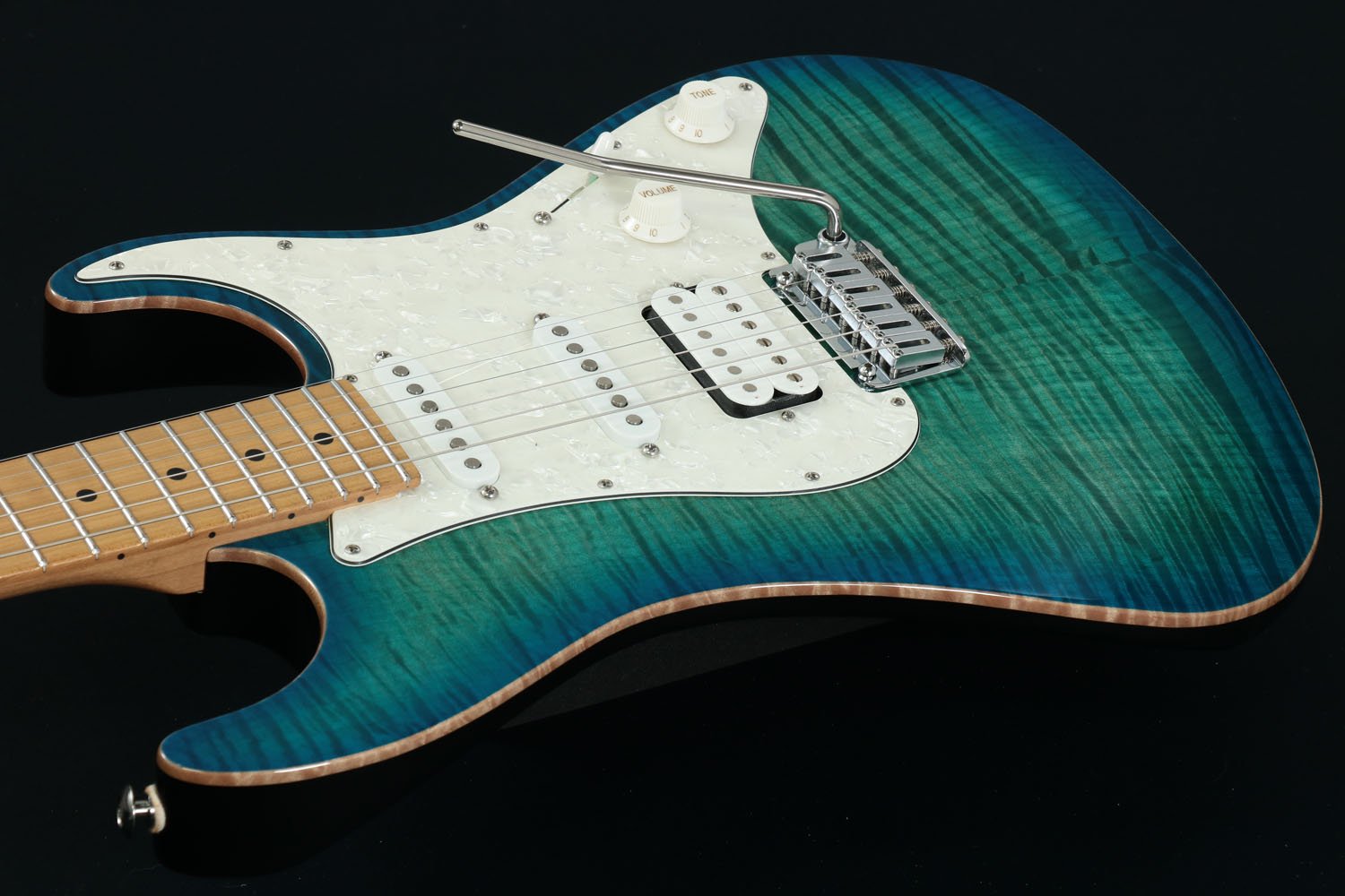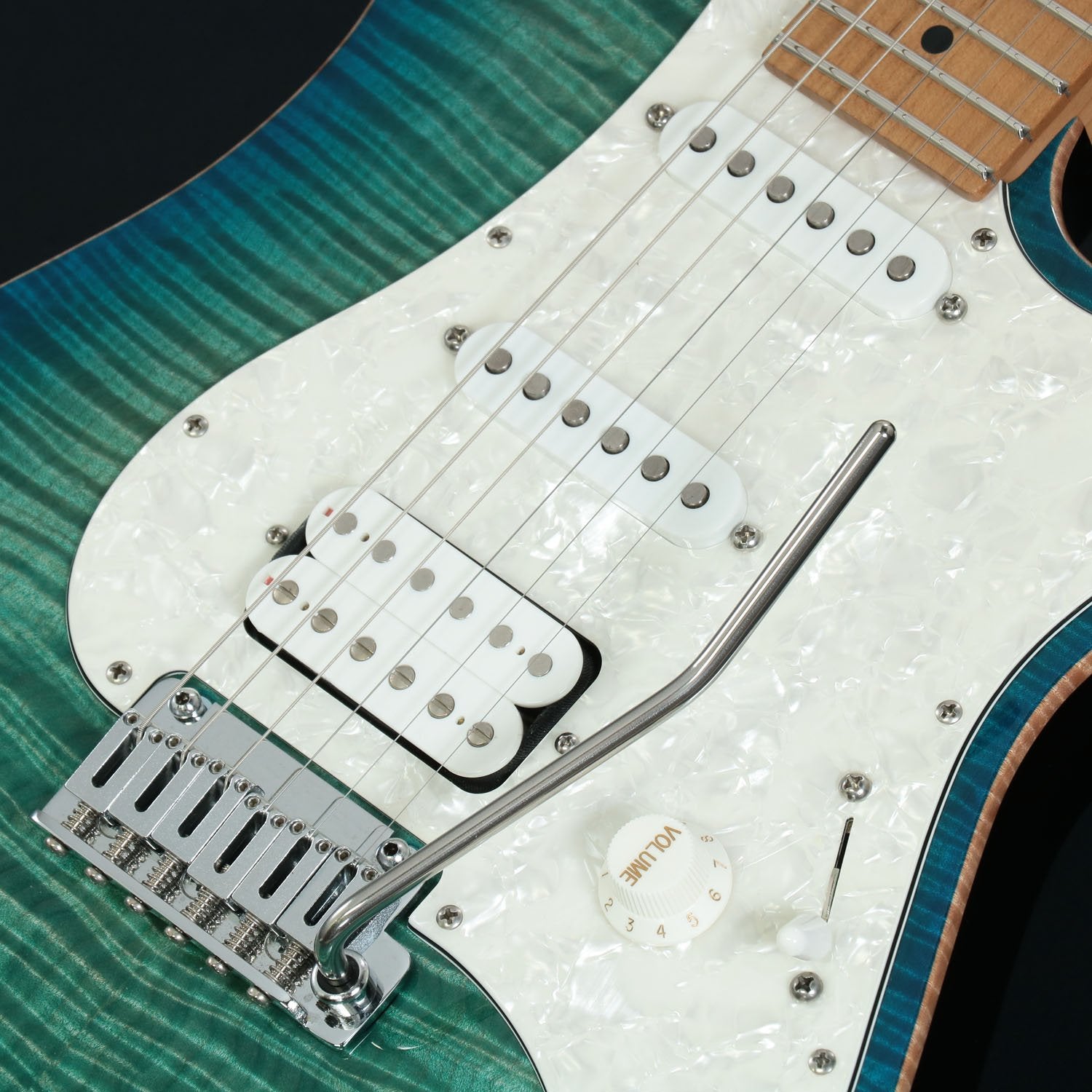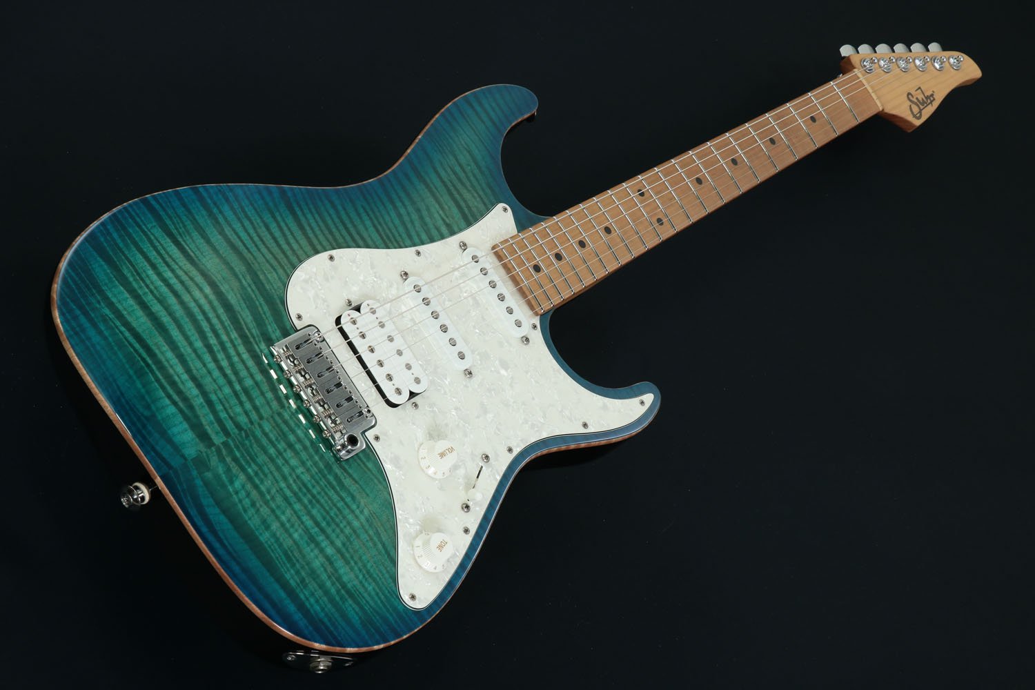 フレイムメイプル・トップ/バスウッド・ボディ、Even C Mediumシェイプのローステッド・メイプル・ネック、10”-14”Rコンパウンドラディアスのローステッド・メイプル指板、PUはV60LPx2&SSH PlusのH-S-Sレイアウト、Vol/Tone(Push-Pushコイルスプリット)/5Wayセレクター/バッテリー不要のパッシブタイプ・SSC IIノイズレスシステム、Gotoh 510, 2 Post, Solid Saddleブリッジ、Suhrロックペグ搭載しています。
