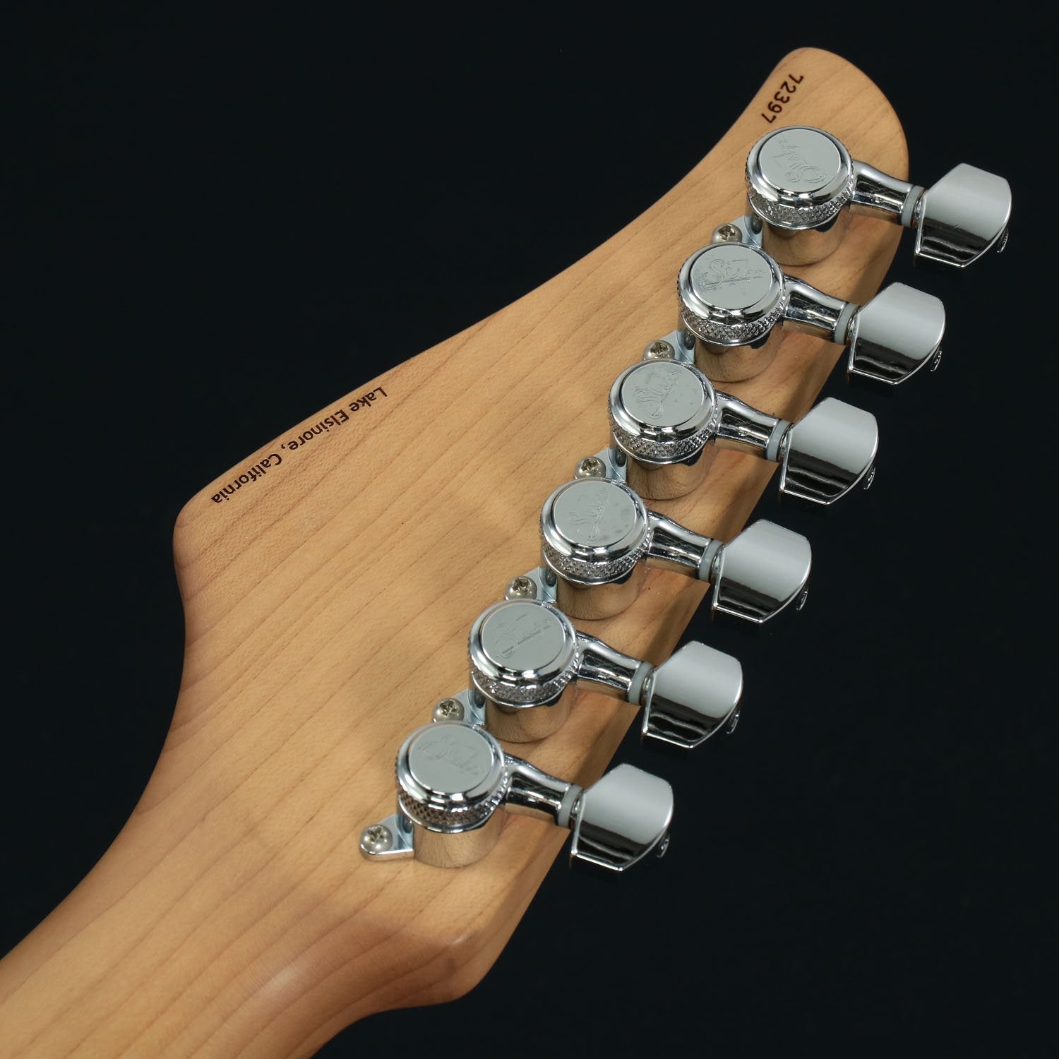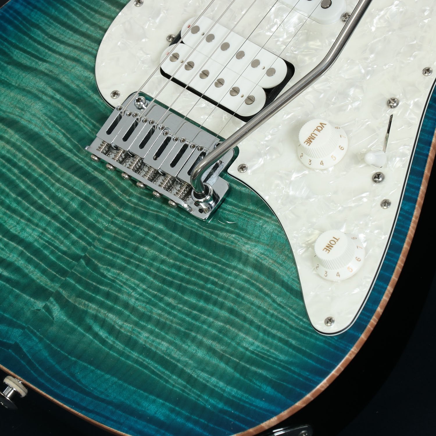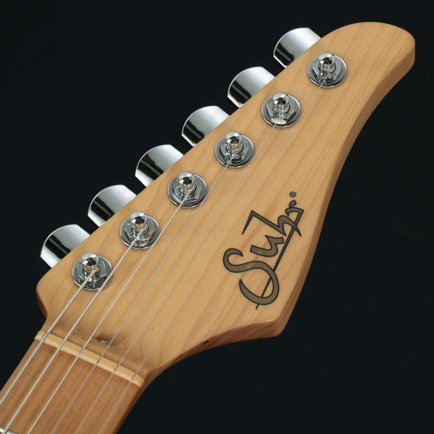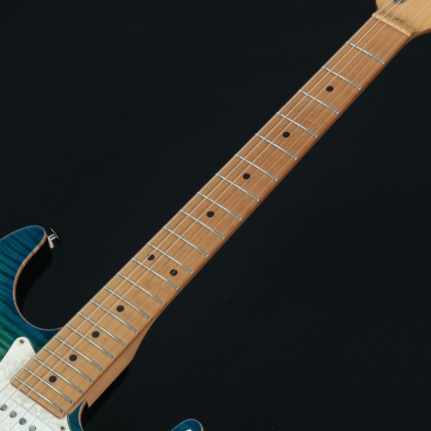 フレイムメイプル・トップ/バスウッド・ボディ、Even C Mediumシェイプのローステッド・メイプル・ネック、10”-14”Rコンパウンドラディアスのローステッド・メイプル指板、PUはV60LPx2&SSH PlusのH-S-Sレイアウト、Vol/Tone(Push-Pushコイルスプリット)/5Wayセレクター/バッテリー不要のパッシブタイプ・SSC IIノイズレスシステム、Gotoh 510, 2 Post, Solid Saddleブリッジ、Suhrロックペグ搭載しています。