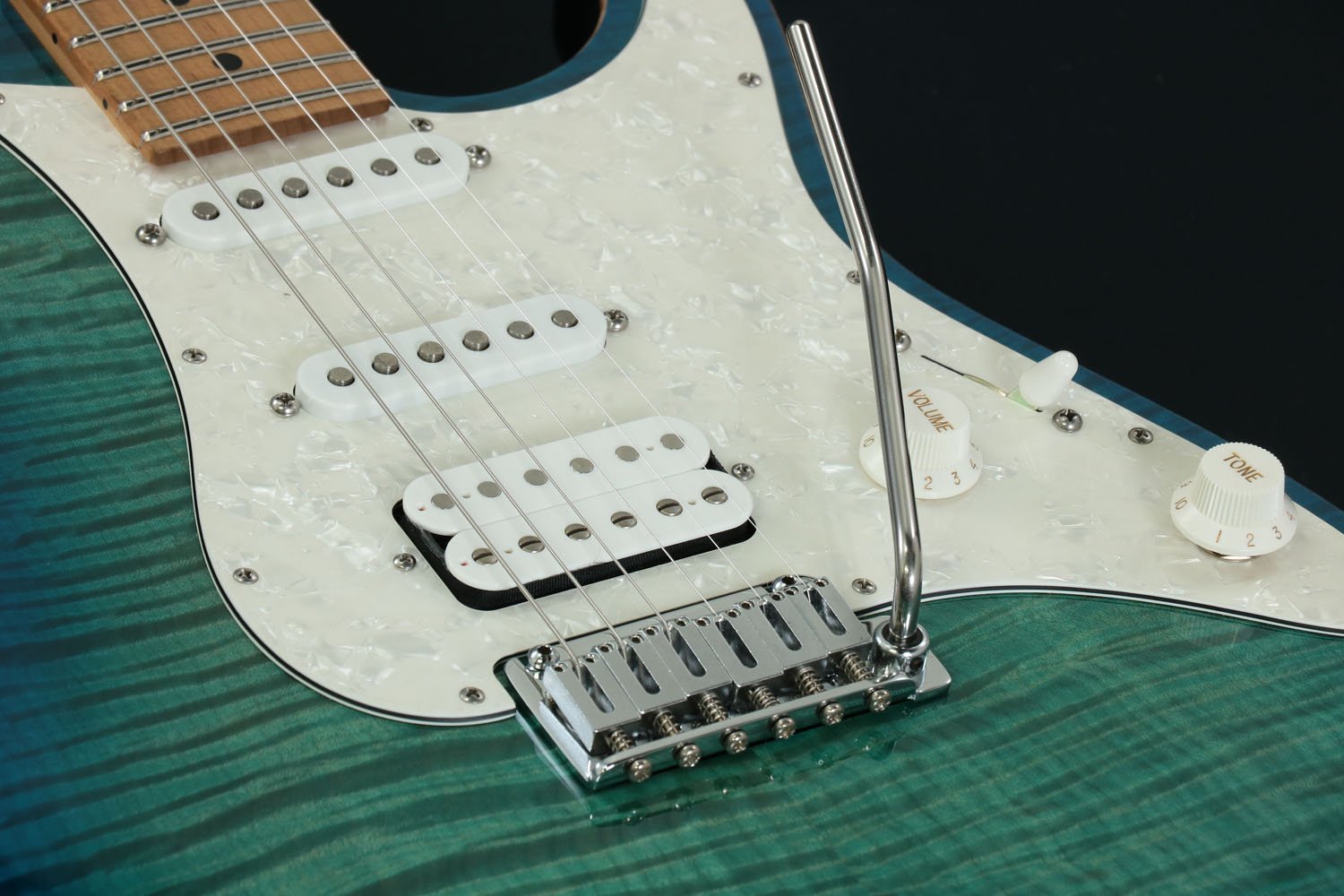 Flamed maple top/basswood body, Even C Medium shaped loated maple neck, 10"-14 "R compound radius loated maple fingerboard, 2 x V60LP & SSH PU Plus H-S-S layout, Vol/Tone (Push-Push coil split)/5-way selector, battery-free passive SSC II noiseless system, Gotoh 510, 2 Post, Solid Saddle bridge, Suhr locking pegs. The instrument is equipped with Gotoh 510, 2 Post, Solid Saddle bridge and Suhr locking pegs.