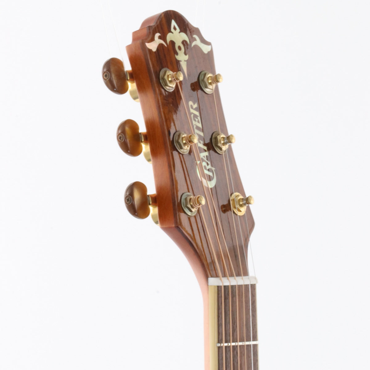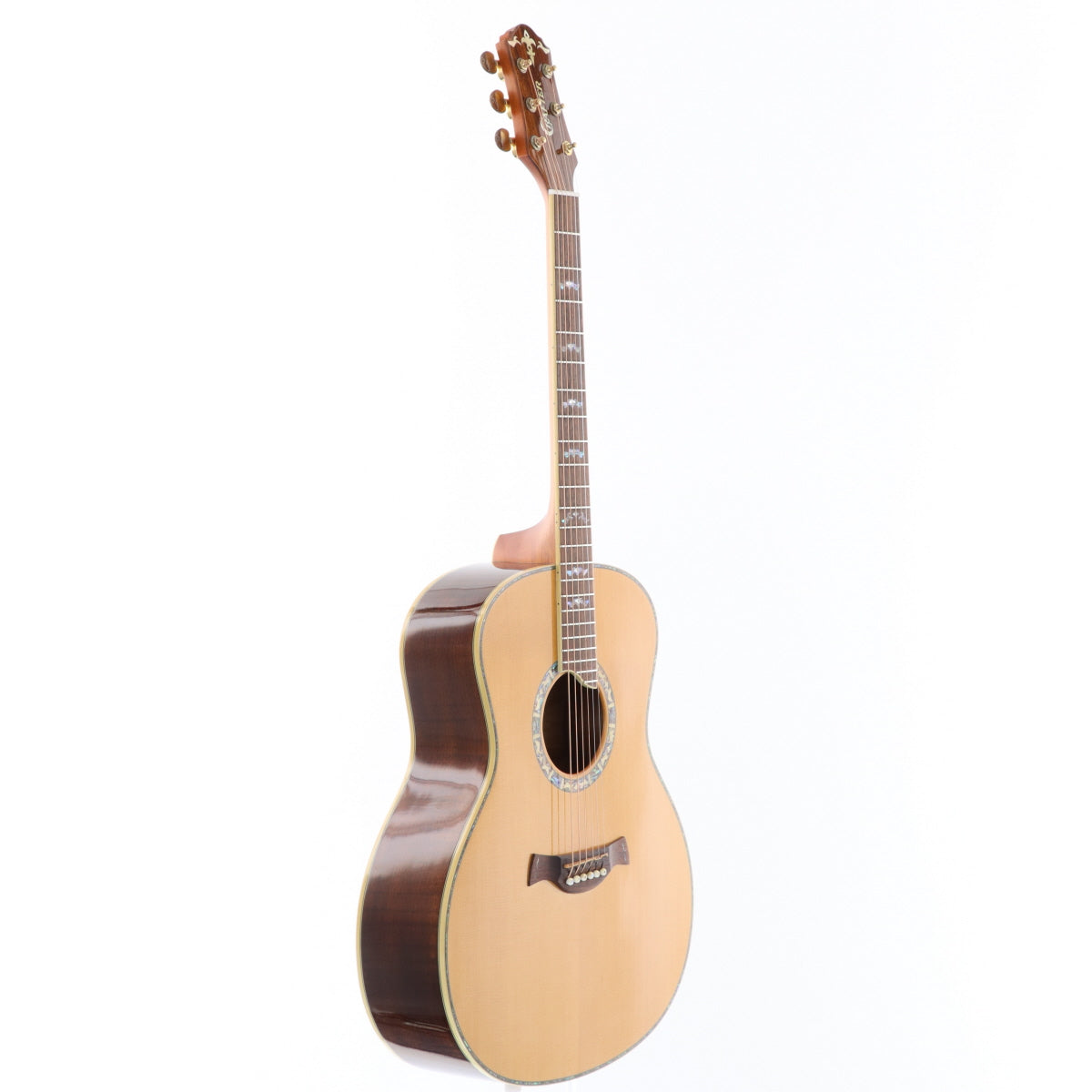 トップにはスプルース、サイド&バックにはキルトメイプルが使用されたモデル。ボディトリムや指板、パフリングには貝を用いた装飾が施されています。サウンドは、アタック感が心地よく弦高もかなり低めのセッティングなので、リードプレイをされる方や、とにかく弾きやすいギターをお探しの方にオススメです。