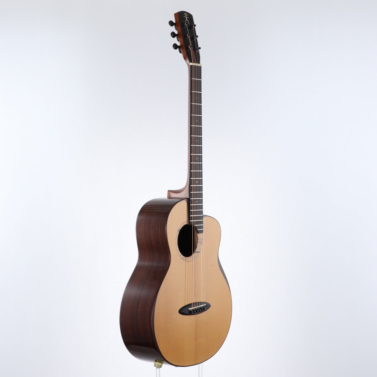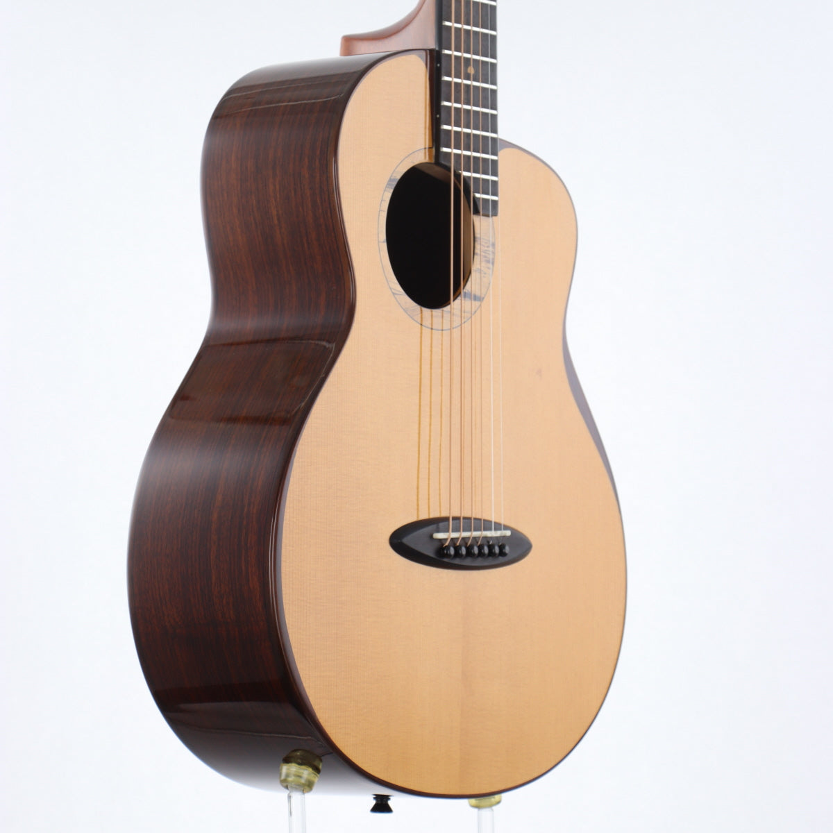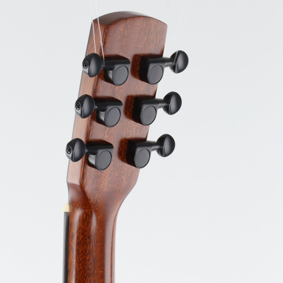 スプルーストップにサイド&バックはローズウッド、総ソリッドのトラベルギターです。ボディサイズは控えめですが、610mmのスケールが非常に良い塩梅で、サウンドもチープでは無くしっかりと芯があります。家でスッと手に取れるギターです。