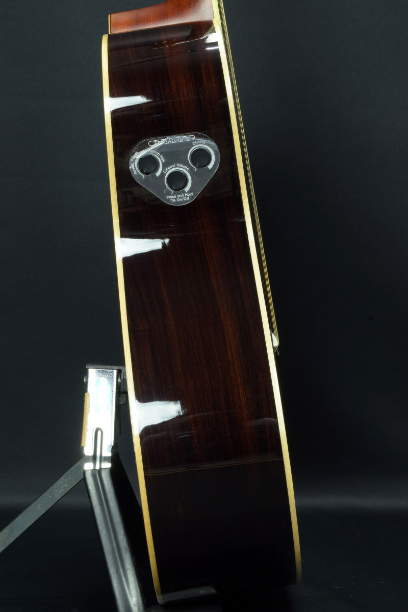 新しくデザインされた電池ボックスは、シンプルな形状を施し側板部では無くエンドピンジャック横に搭載。これにより、ギターボディホール内への干渉を最小限に抑え、ギターの生音に与える影響を極限までおさえました。アンプやPA機器に繋ぎエレクトリックアコースティックギターとして演奏ができる仕様となっています。