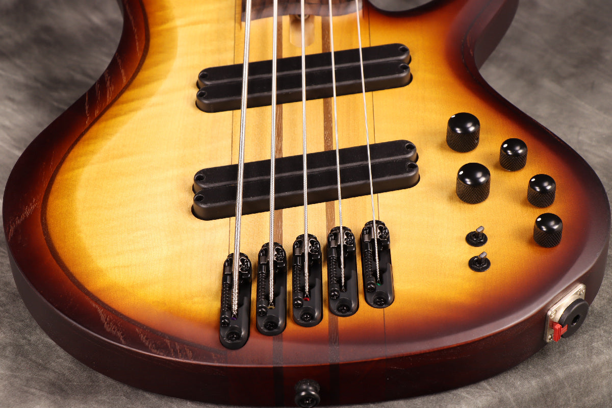 The 5pc neck is made of a combination of maple wood and hard walnut wood for a clear sound image and rich attack. The rigidity of the neck is reinforced by graphite rods installed inside the neck.