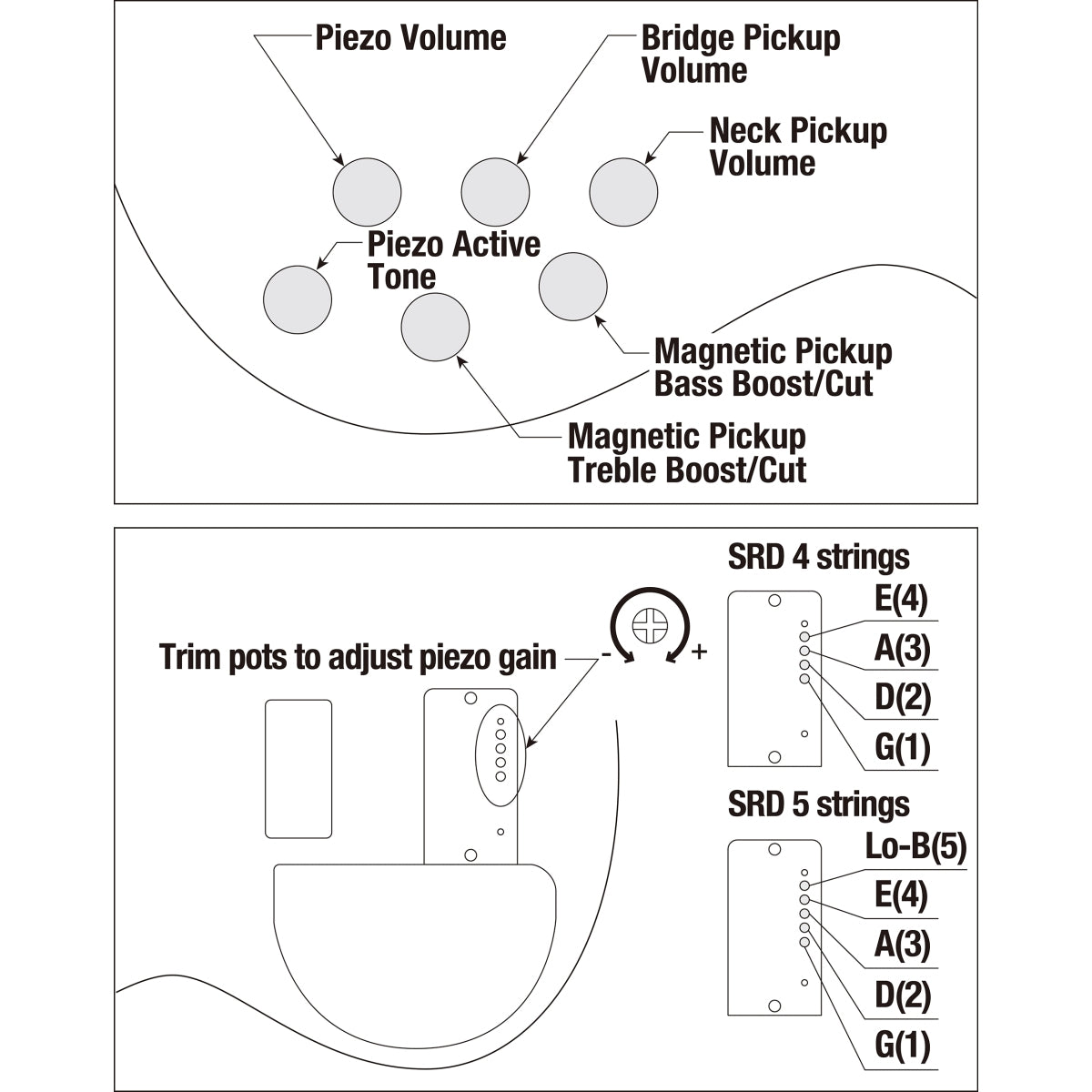 A trim accessible from the back of the body allows the volume of the piezo pickups to be controlled for each string. (Powered by 1 x 006P alkaline battery)