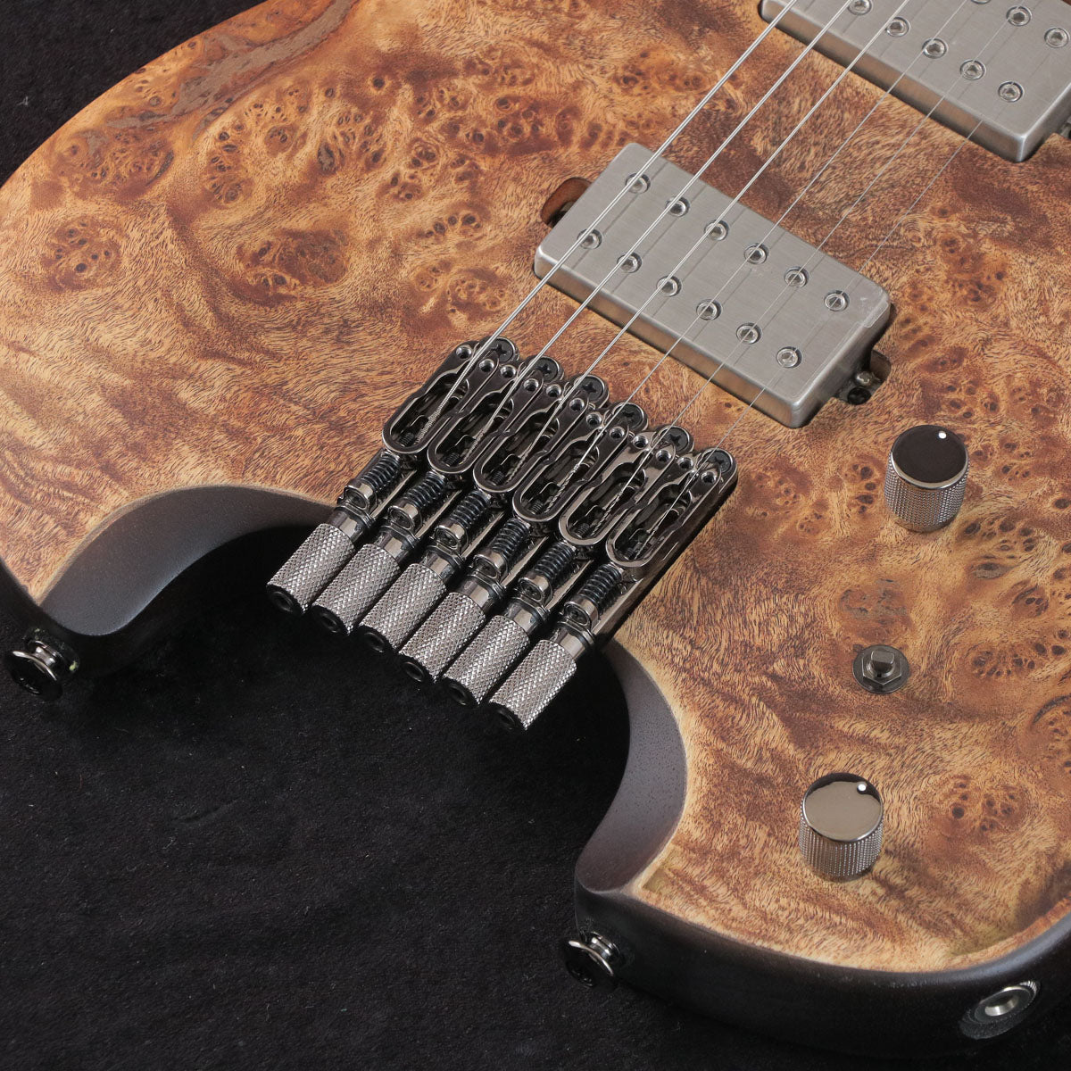 The body top is made of beautifully grained poplar burl.