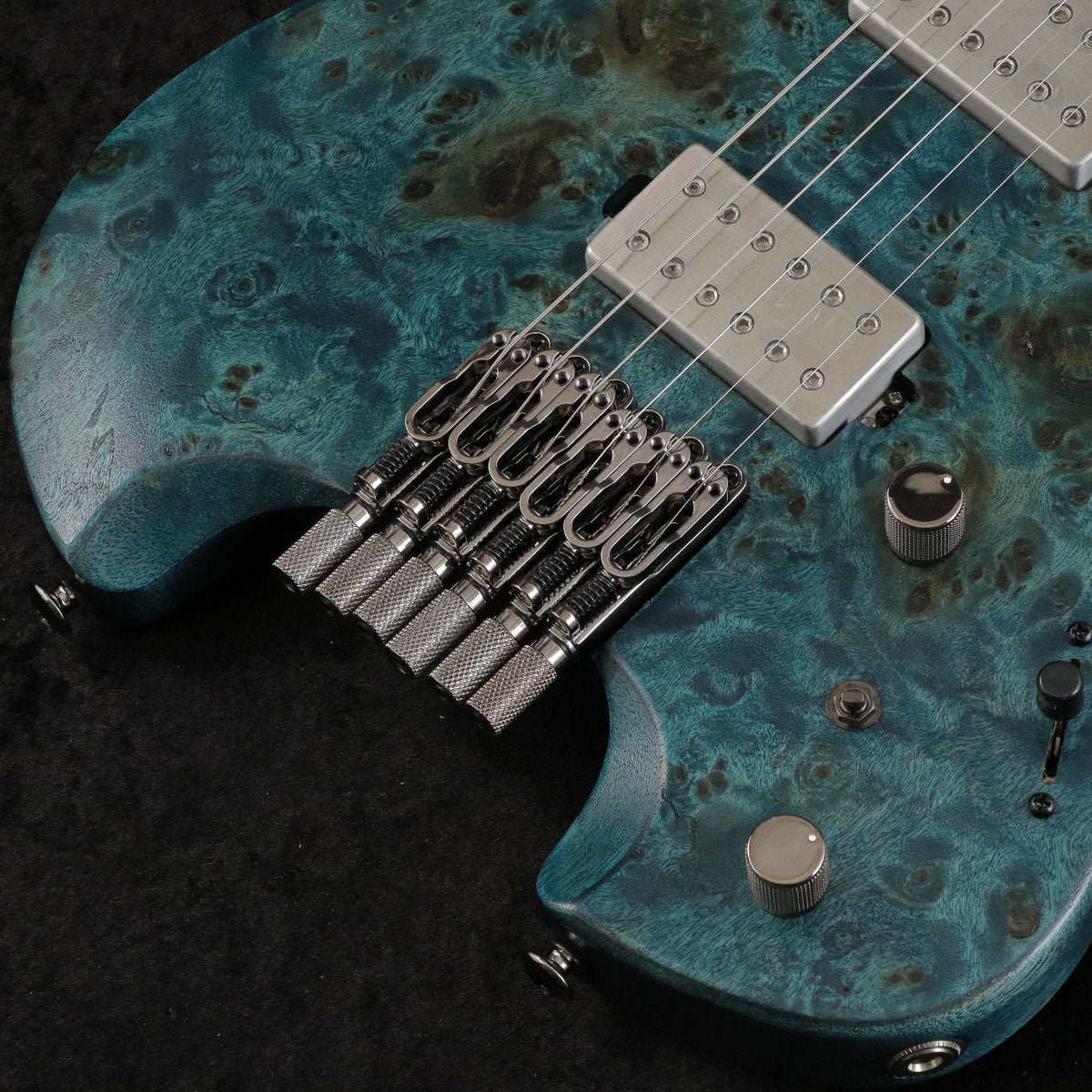 The top is made of poplar burl, which is characterized by its undulating grain, and a low gloss finish is applied to give it a luxurious impression while preserving the wood's texture. The body is made of Nyato wood, which has a rich mid-low range.