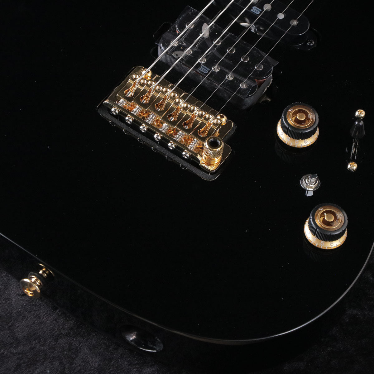 ブラック・グロス・フィニッシュ・ボディにゴールド・ハードウェアが映え、モダンな印象を与える、SSHピックアップ・ダイレクトマウント・レイアウトの新モデル