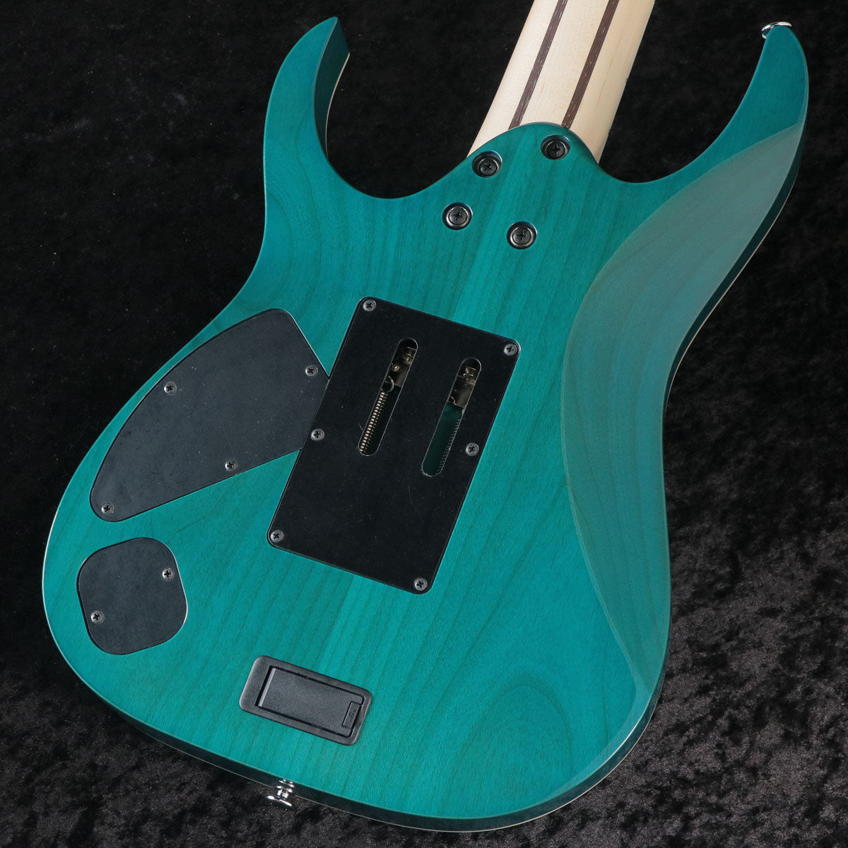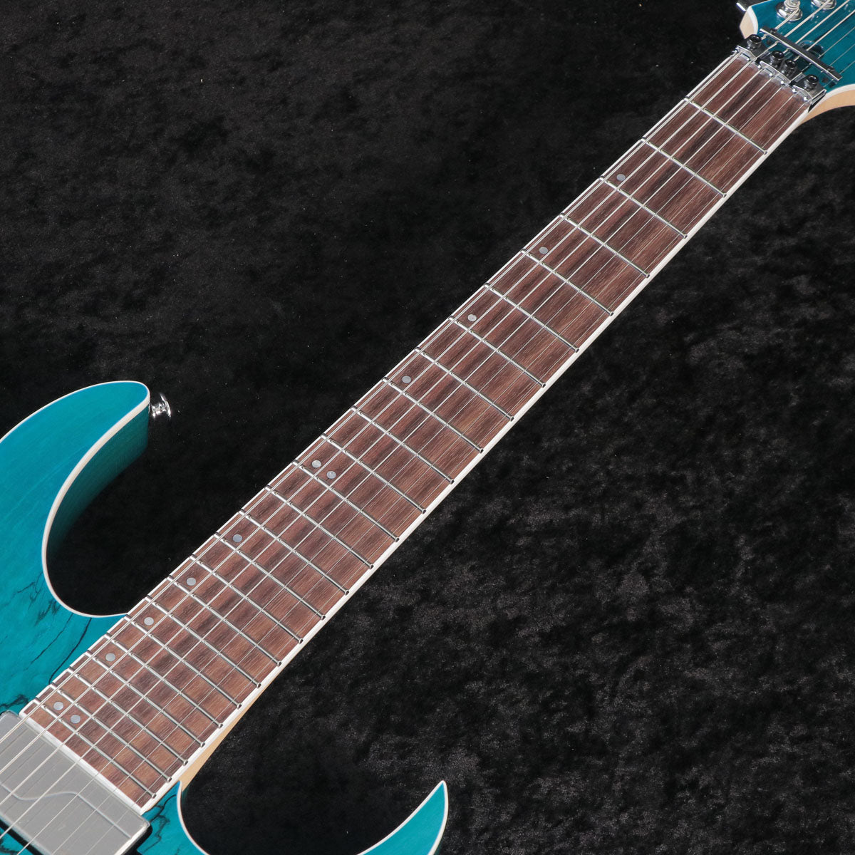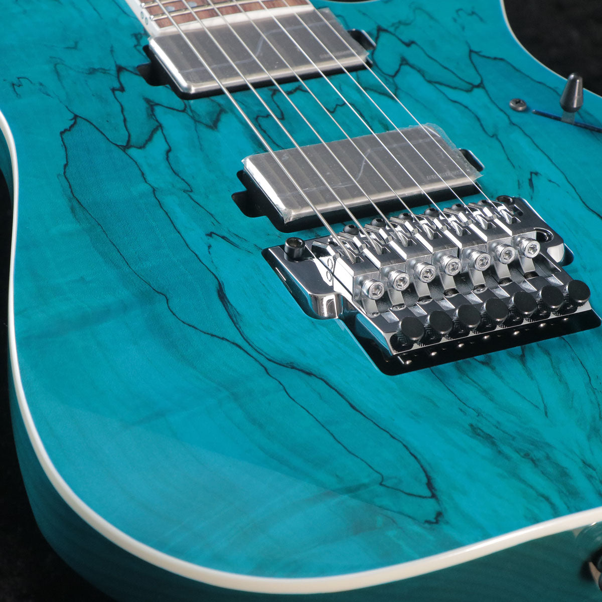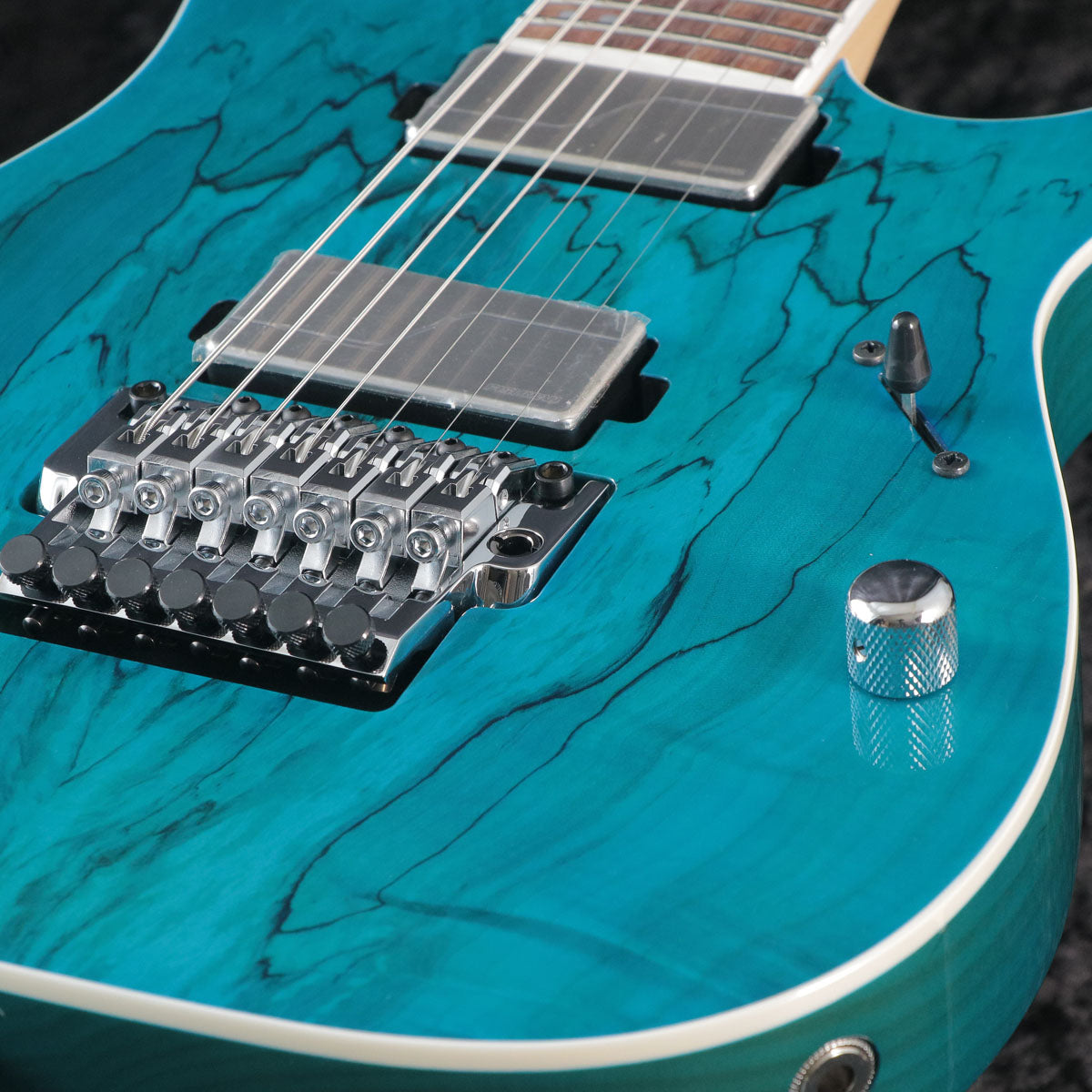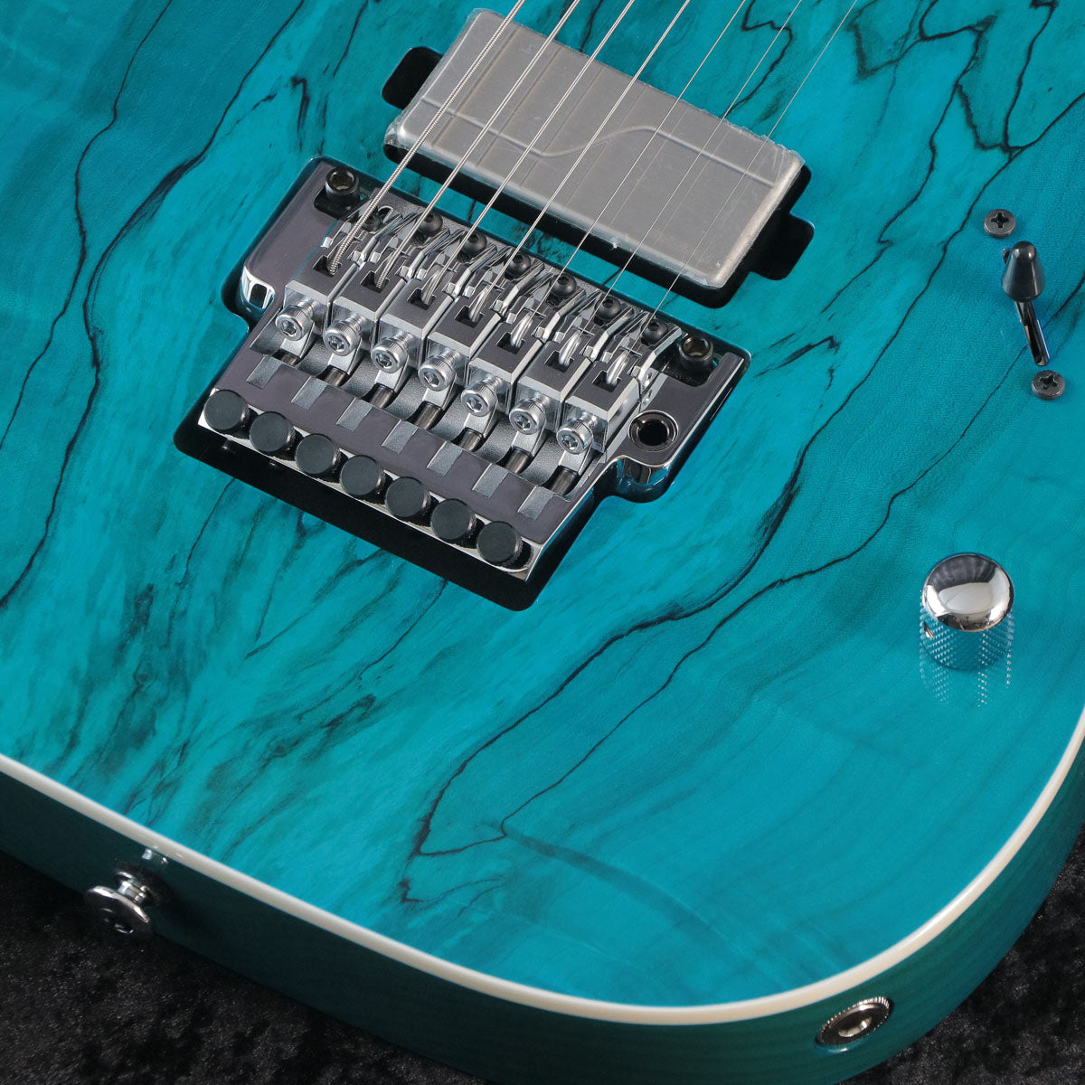 スポルテッド・メイプル材の縞模様と特別なシースルー・ブルー・カラーが織りなす、HAZUKI本人が好きなパワーストーン”ターコイズ”を表現した、本人こだわりのボディー・カラー。