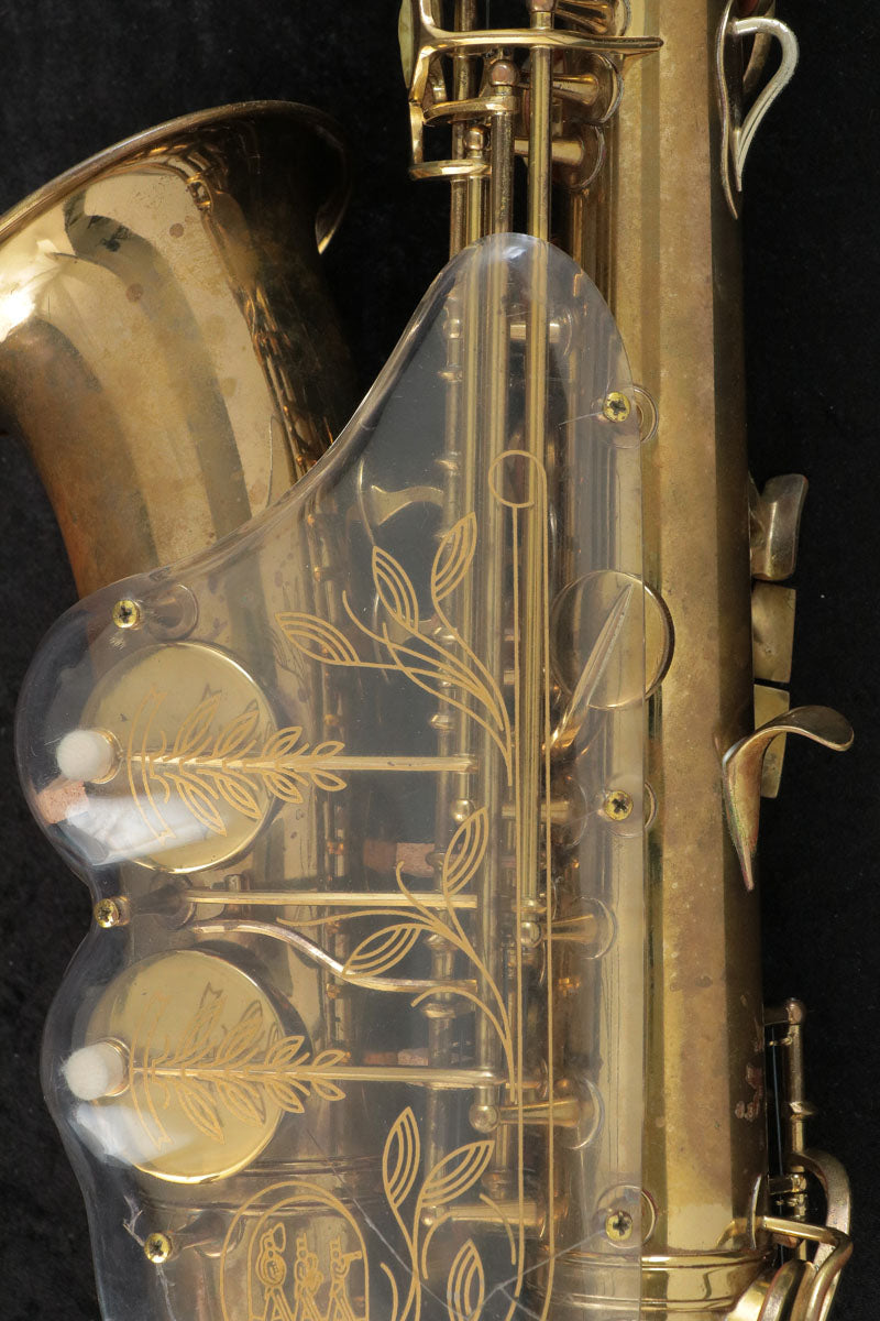 ラッカー仕上げ、ロールドトーンホール、プラスチック製キイガード付きの1950年頃製造されたモデル。