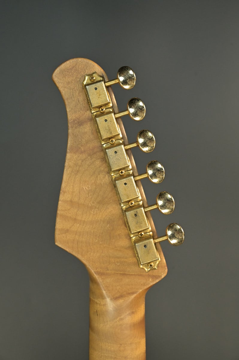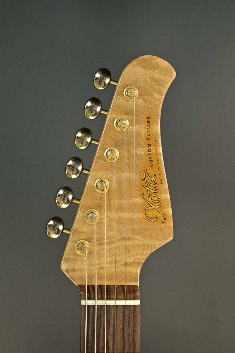 ボディはフルサイズのセンター2pcsのアルダーで、フィニッシュはラッカーのヘヴィーエイジド仕様です。ネックはRoasted Mapleでこれでもかとフィギュアドが入った高級感がありながらも洗練されたサウンドと抜群の安定感を誇ります。指板はローズウッドで、指板面は9.5インチ、フレットはヴィンテージを踏襲しながらも高いプレイアビリティを実現するJescarのニッケルタイプ6105系。FCS系では人気定番の仕様です。ネックシェイプは『Xotic C-Shape .830”-.920”』としておりローポジションは比較的スッキリとしたクセは少ないシェイプ。多くのプレイヤーに受け入れられるはずです。