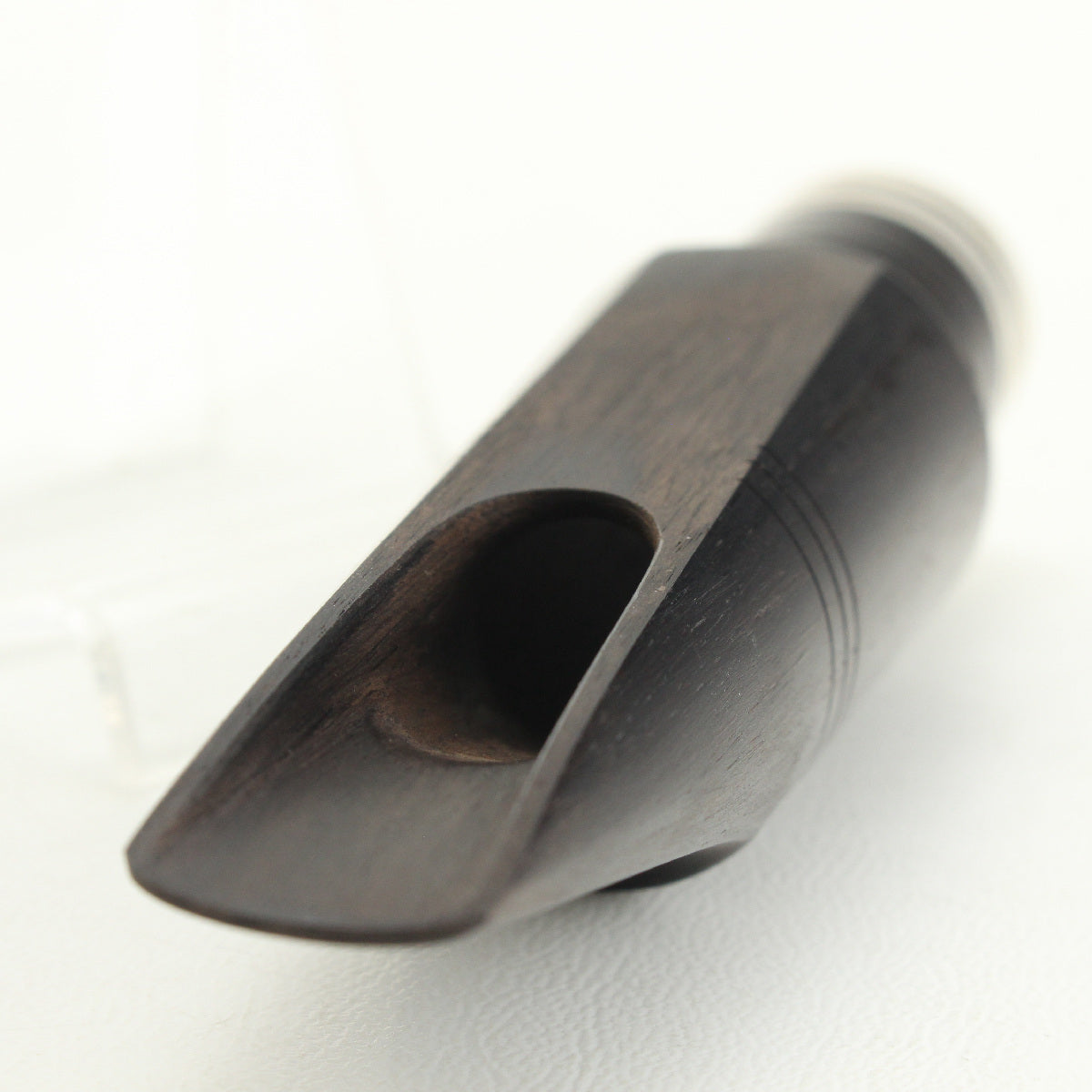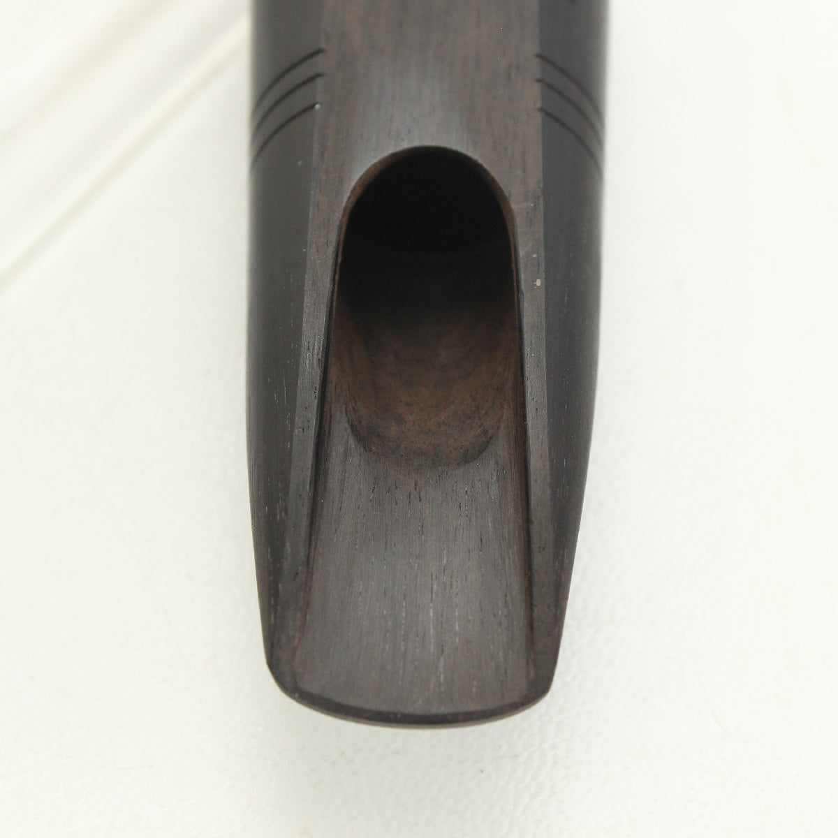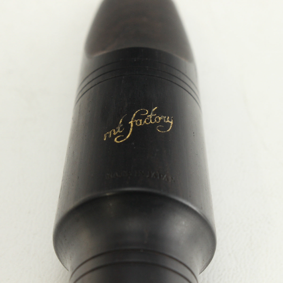 This is a tenor saxophone mouthpiece from MT Factory. This one may have been refaced. It appears to be made of African blackwood, and the shank ring has a metal ring for balance. It is a combination of high baffle and bullet chamber.