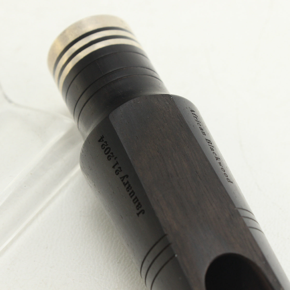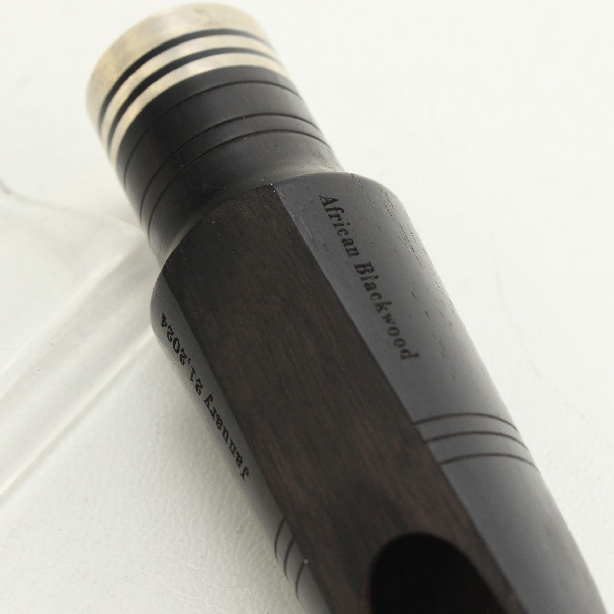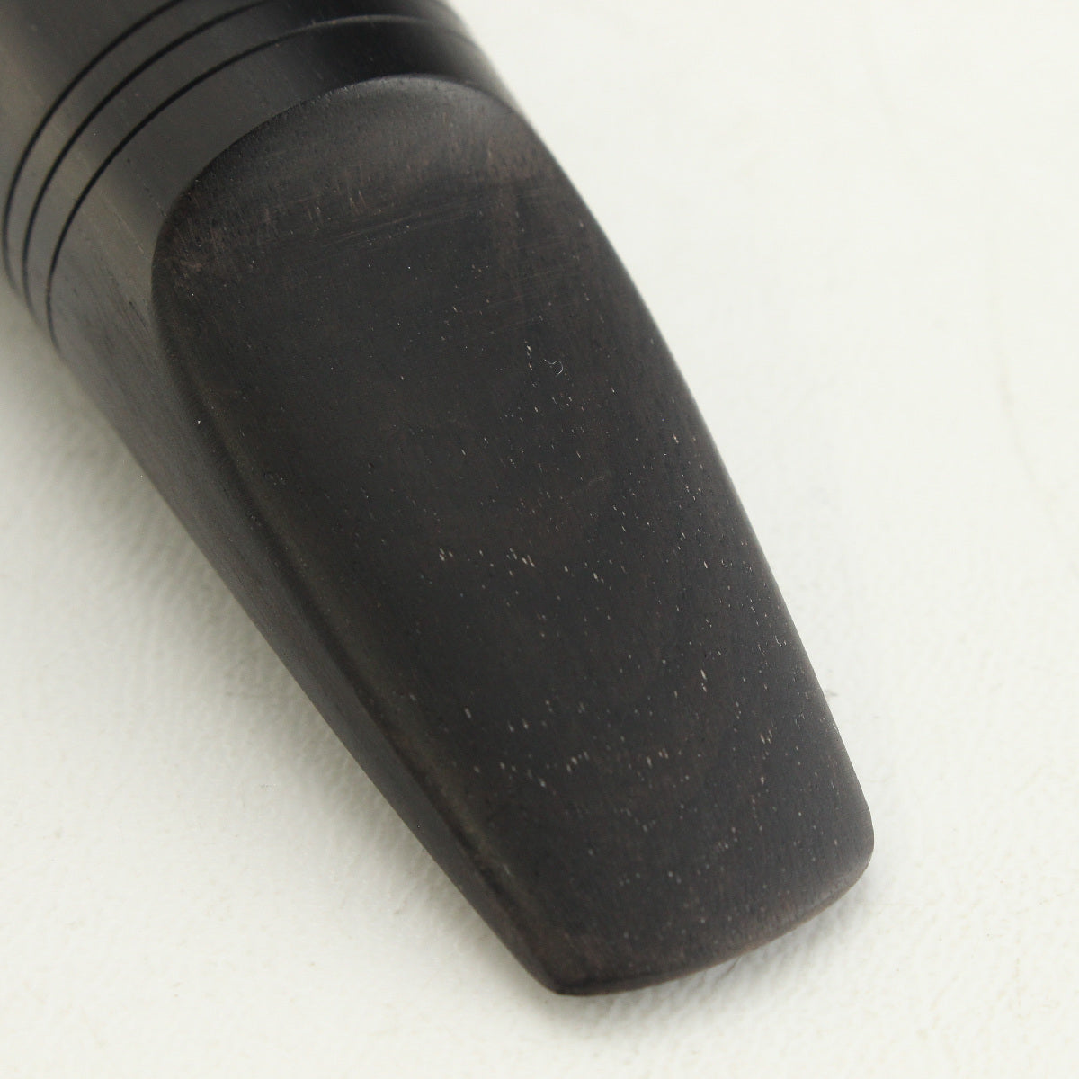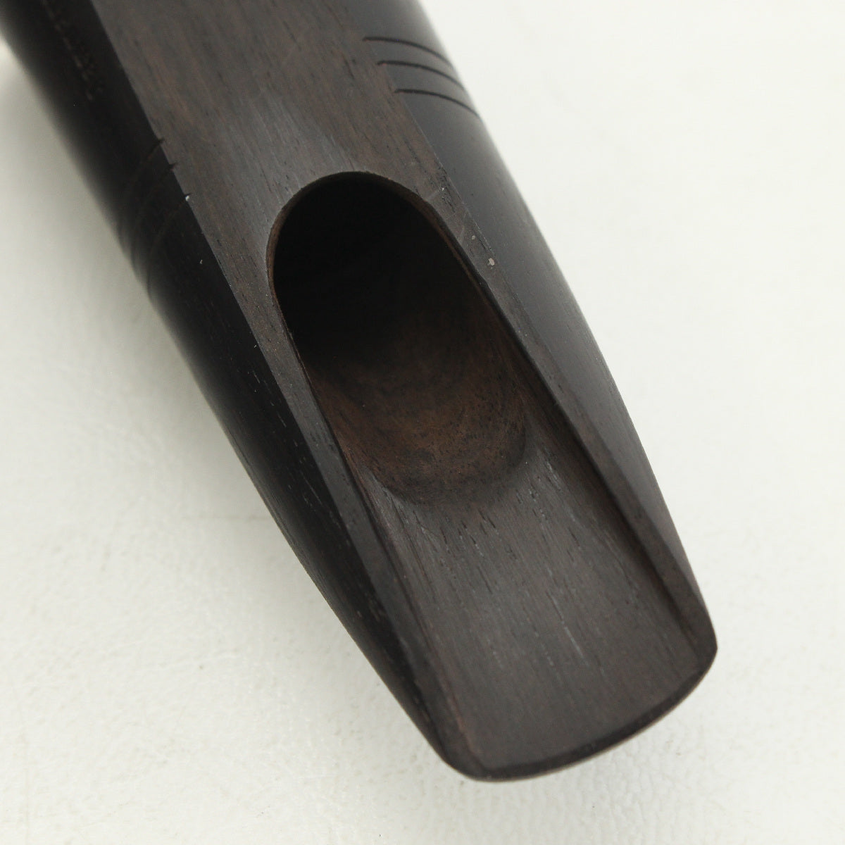 This is a tenor saxophone mouthpiece from MT Factory. This one may have been refaced. It appears to be made of African blackwood, and the shank ring has a metal ring for balance. It is a combination of high baffle and bullet chamber.