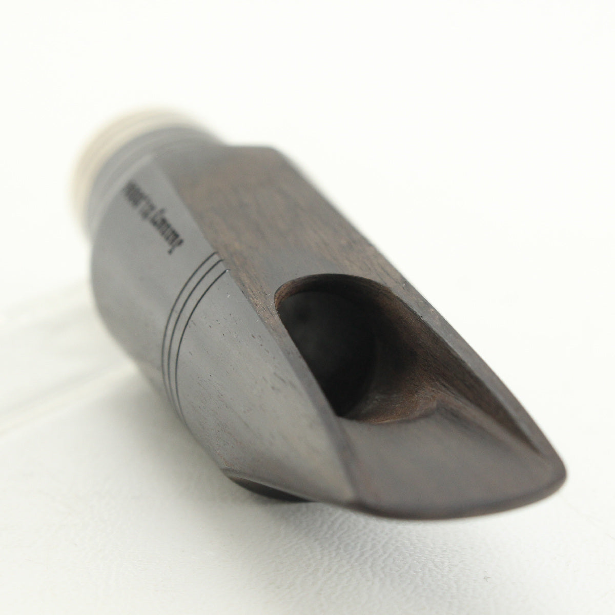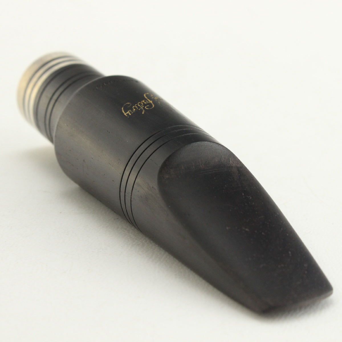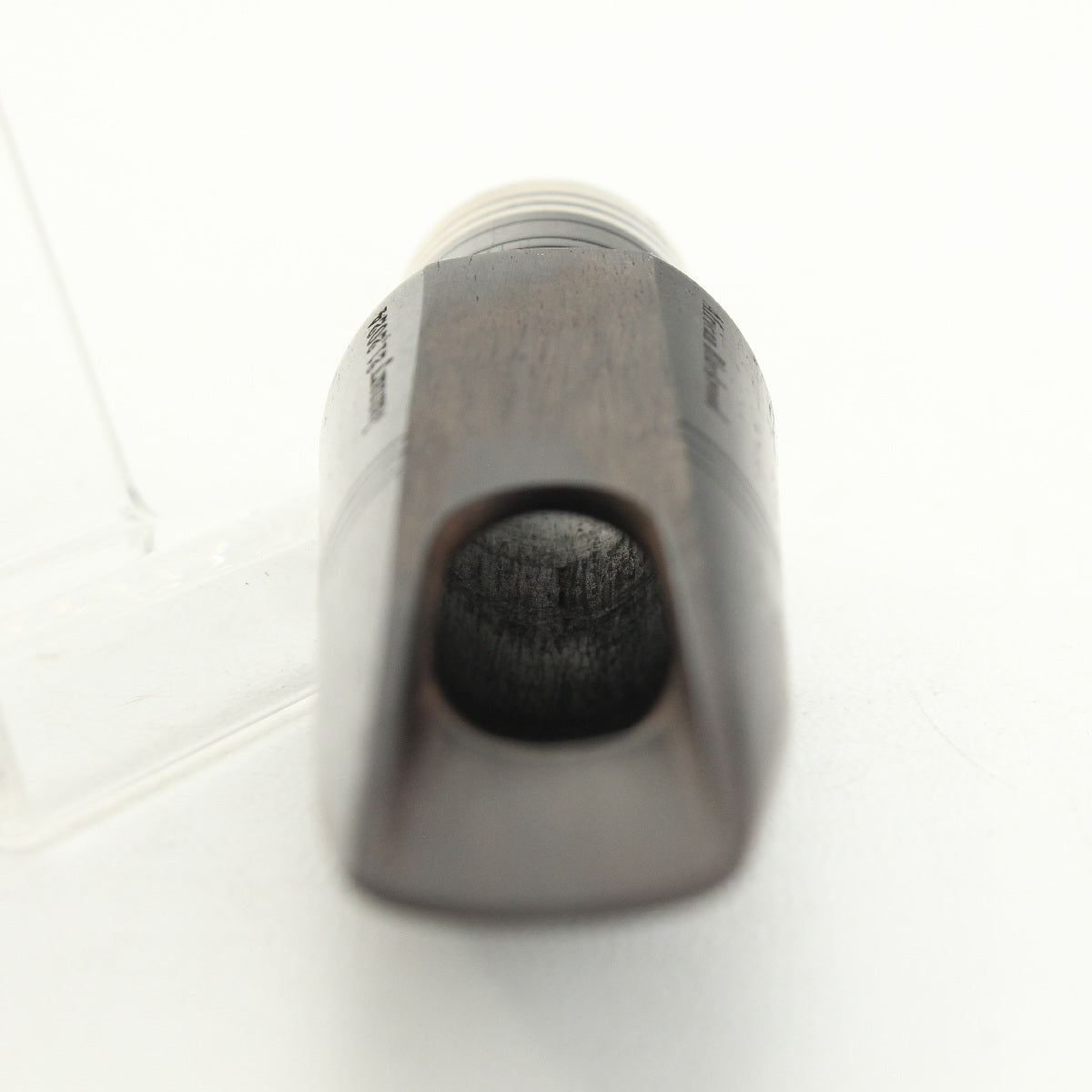 MTファクトリーのテナーサックス用マウスピースです。こちらはリフェイスされている可能性がございます。アフリカン・ブラックウッド材を使用しているようで、シャンクリングは金属製のリングが付いており、バランスを取っているのだと思います。ハイバフル、ブレットチェンバーの組み合わせです。