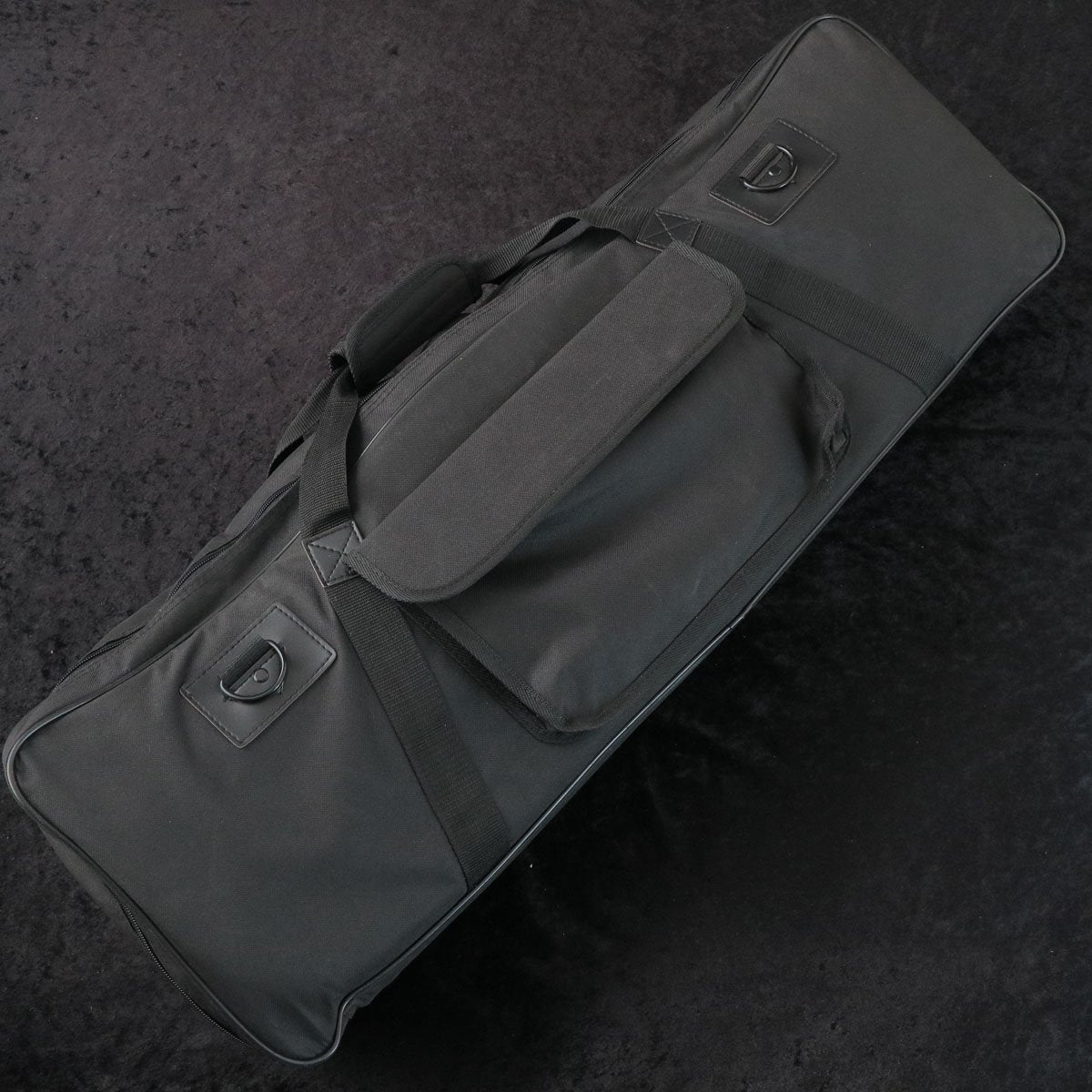 デッキには打痕、引っ掻き傷、擦り傷、塗膜の欠けが散見されますが、大きく目立つダメージはありません。本体には僅かに擦り傷、打痕が確認できますが、手にとって凝視しないと見逃してしまうレベルです。デッキと本体を固定する際、デッキ裏側の軸をボディ側の穴に挿す構造ですが、本体表面1弦側の軸を受けるプレート脇の塗膜に僅かな剥げが見られます。ペグのメッキにくすみが、デッキ中央の金属プレートにはくすみと傷が確認できます。フレットラインは印刷かペイントによって描かれているものと思われますが、一部薄くなっている箇所があります。キーボード用のソフト・ケースが付属します。