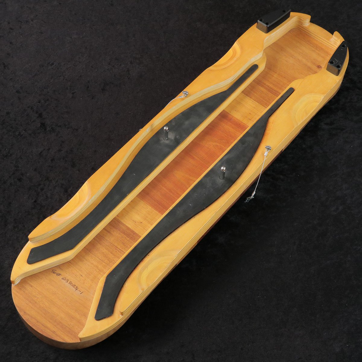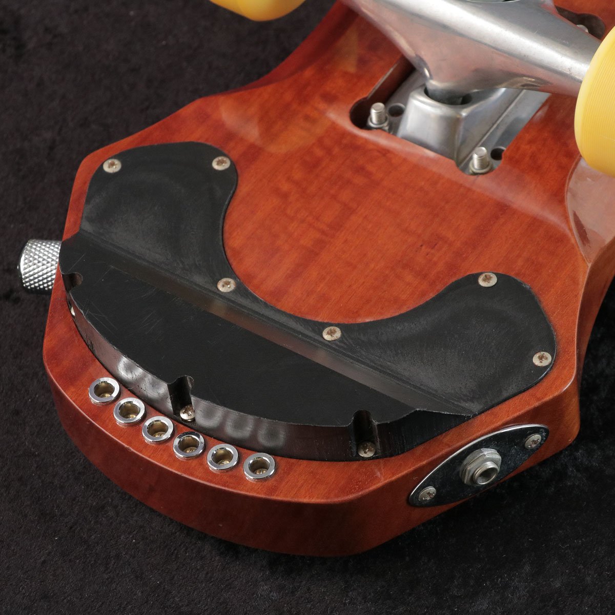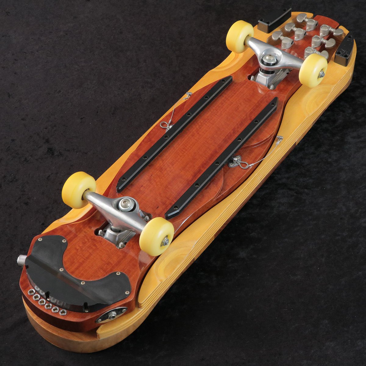 The deck is a cover that can be removed and converted into a lap steel. The wheel is attached to the steel guitar body, so it remains chunky even after the deck is removed, but it has a core sound and plenty of sustain. Ben Harper is said to have appeared on stage on this guitar and started playing at the drop of a hat. The scale is 25 inches. The only control is the volume.
