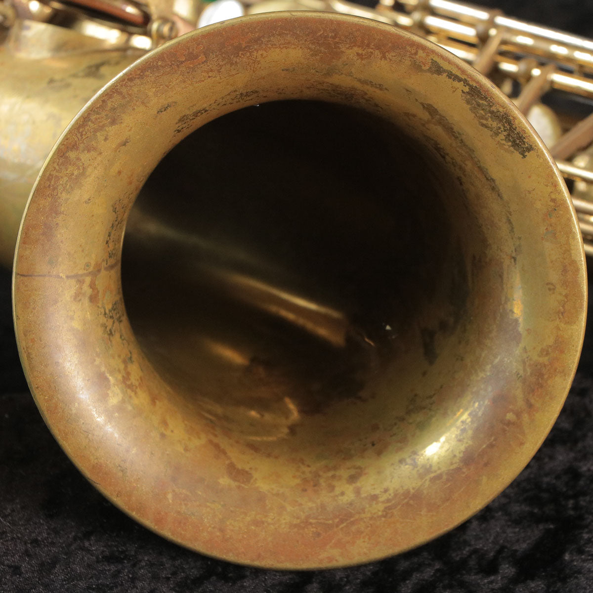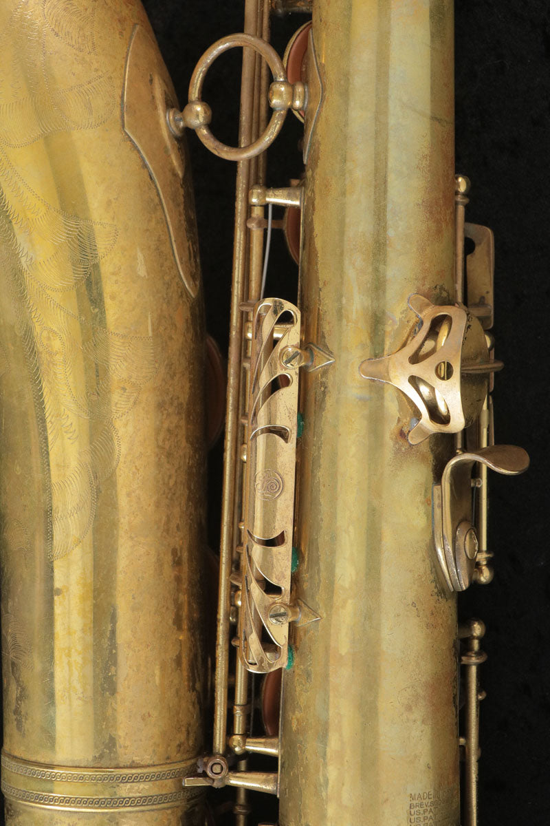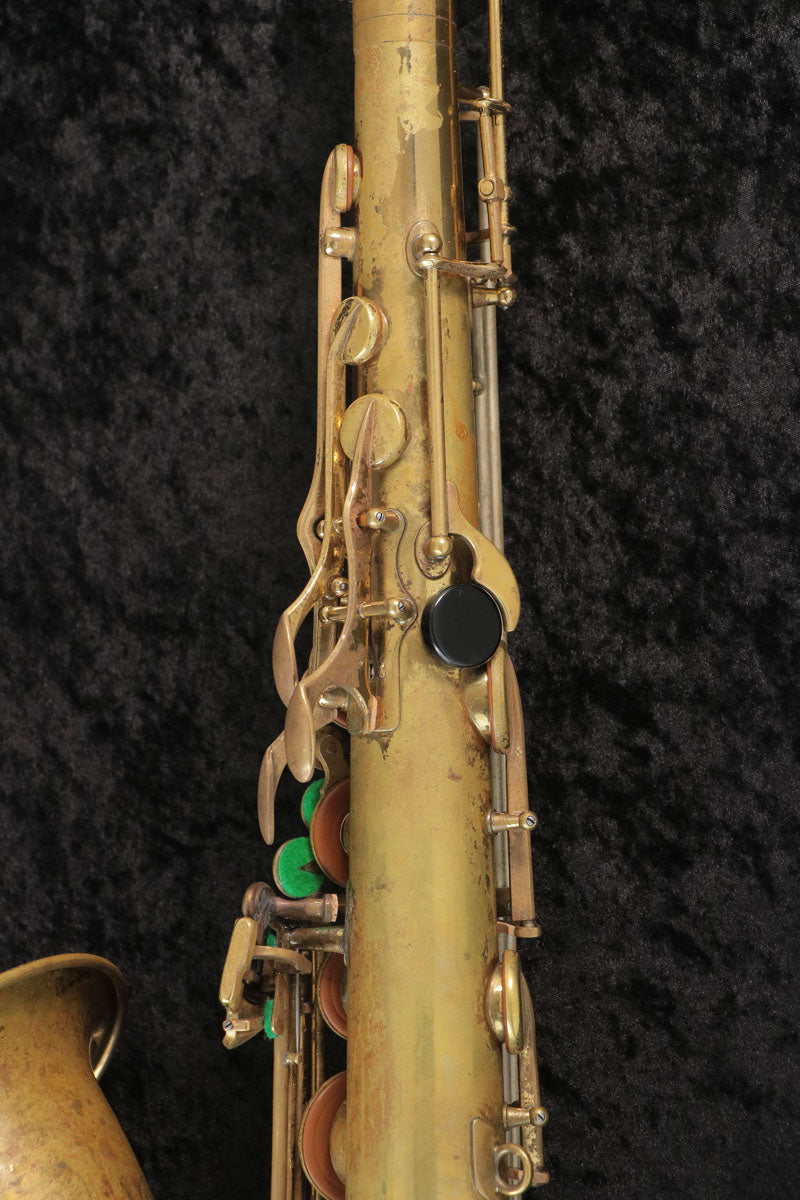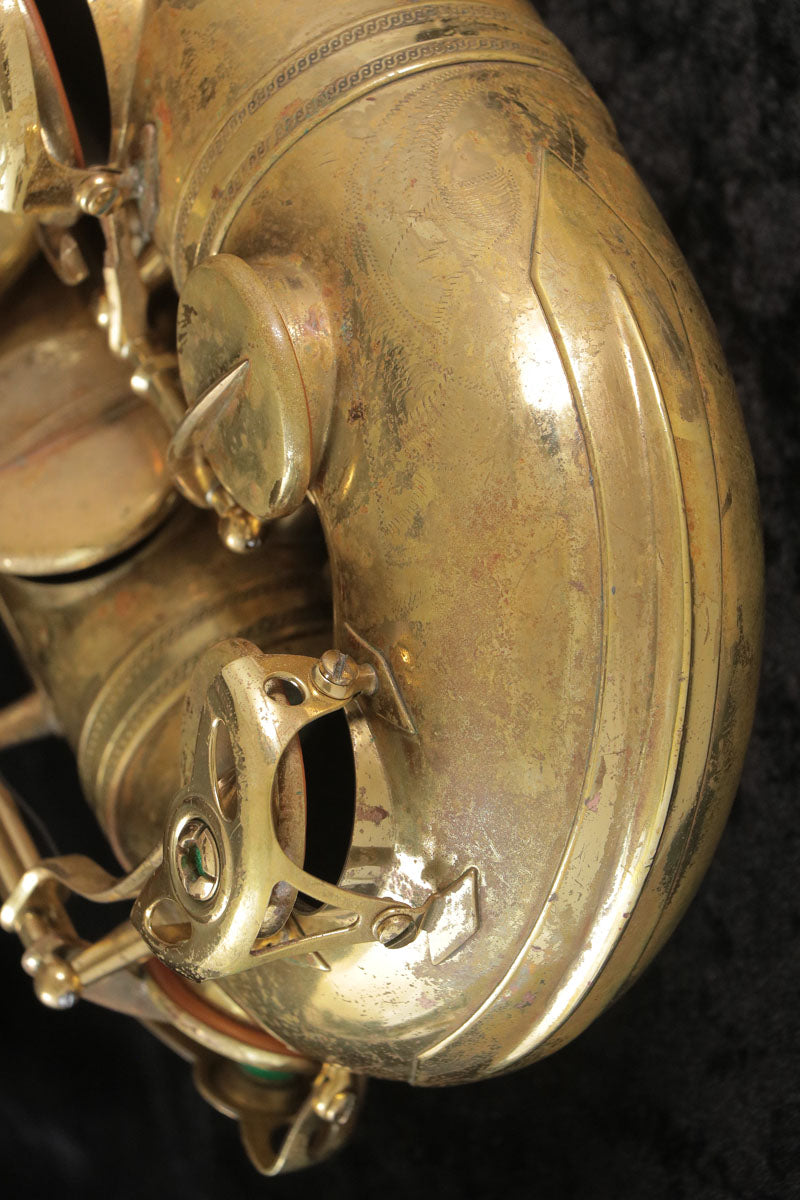 セルマーテナーサックスマークVIです。こちらはほぼラッカーが剥がれているコンディションで風格があります。一部キィガードのパーツ交換、ハンダ修正痕、ネックも含め全体的に凹み修正痕が見受かられますが演奏に問題ございません。乾いたジャジーなサウンドでジャズプレイヤーとの相性も良さそうです。よく吹き込まれた個体で即戦力になると思います。こちらは全タンポ交換調整済みです。