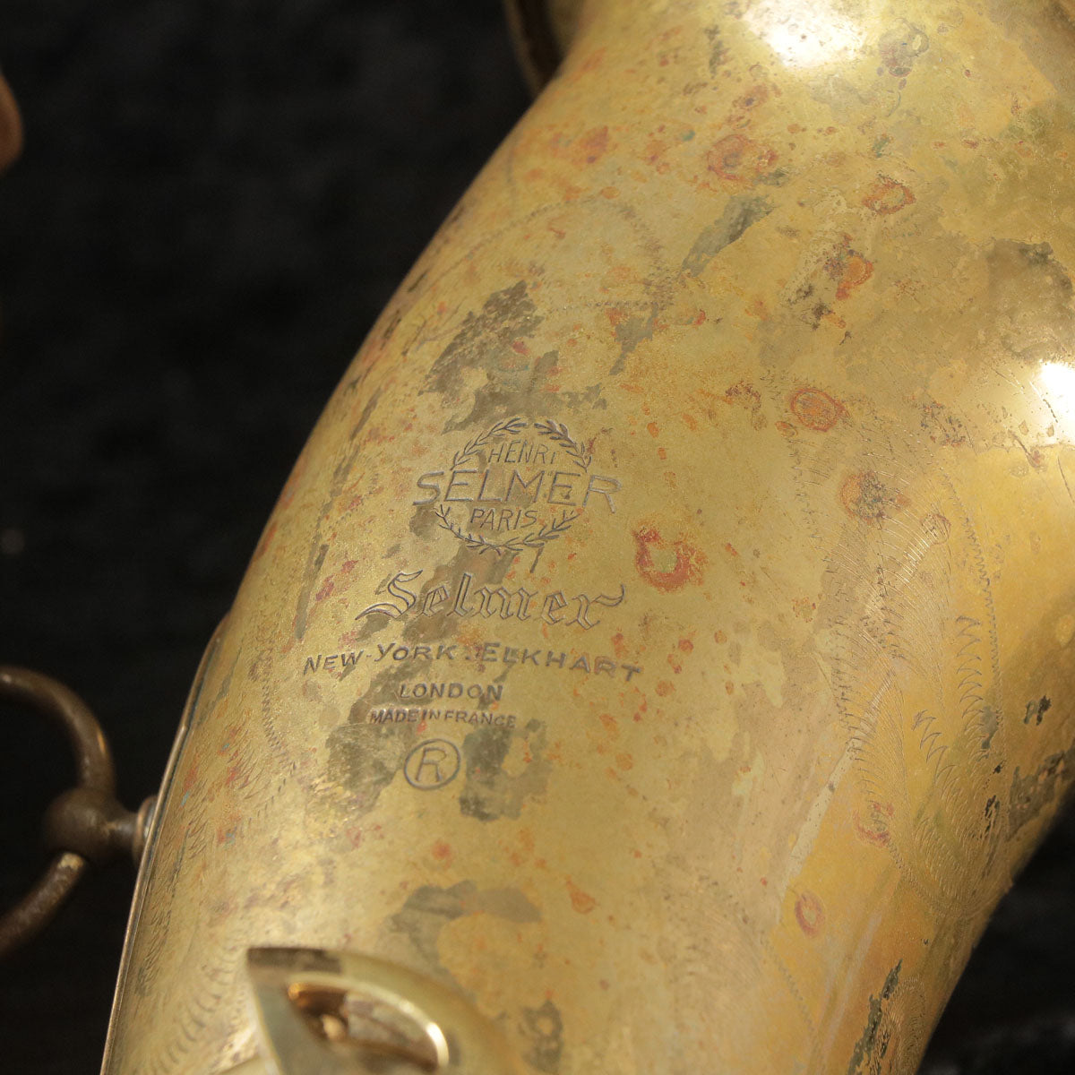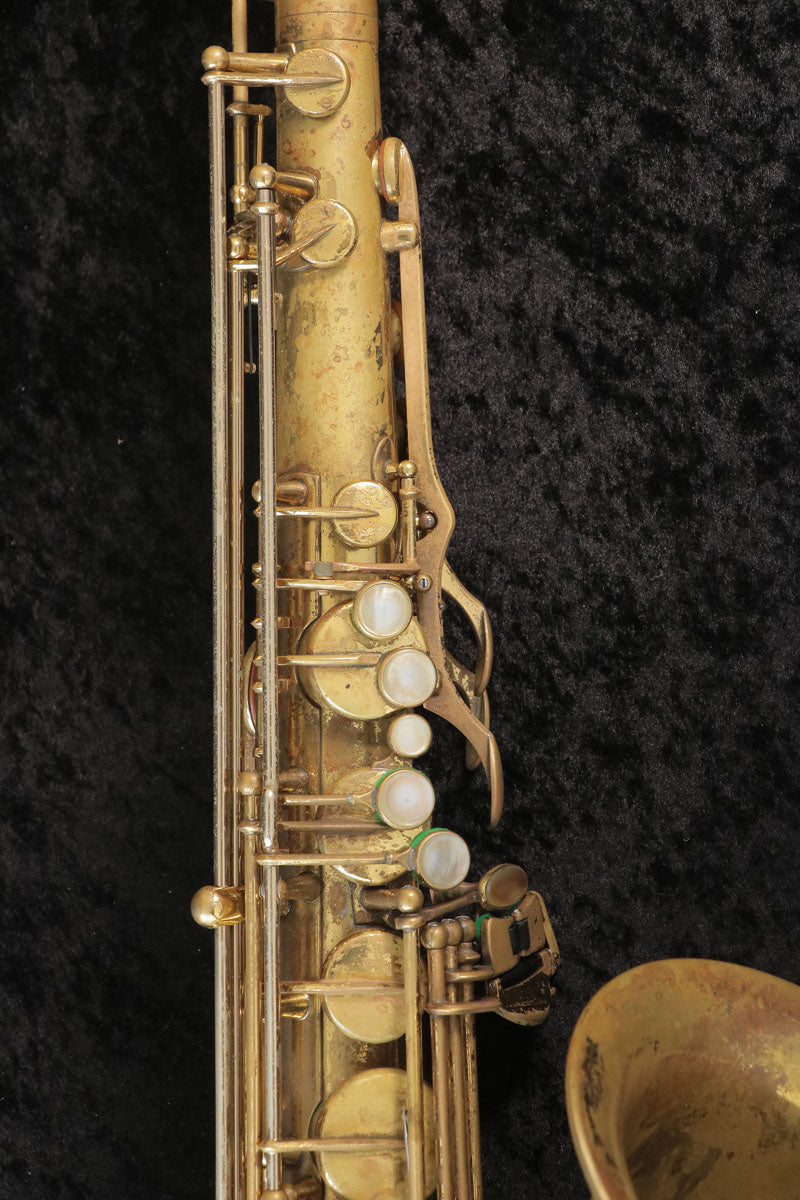 This is a Selmer Tenor Sax Mark VI. The lacquer is almost completely peeled off, and it has a stately appearance. Some parts of the keyguard have been replaced, and there are some solder repair marks and dents on the neck and all other parts. It has a dry and jazzy sound that is perfect for jazz players. This is a well-blown instrument and will be ready to play immediately. All tampos have been replaced and adjusted.