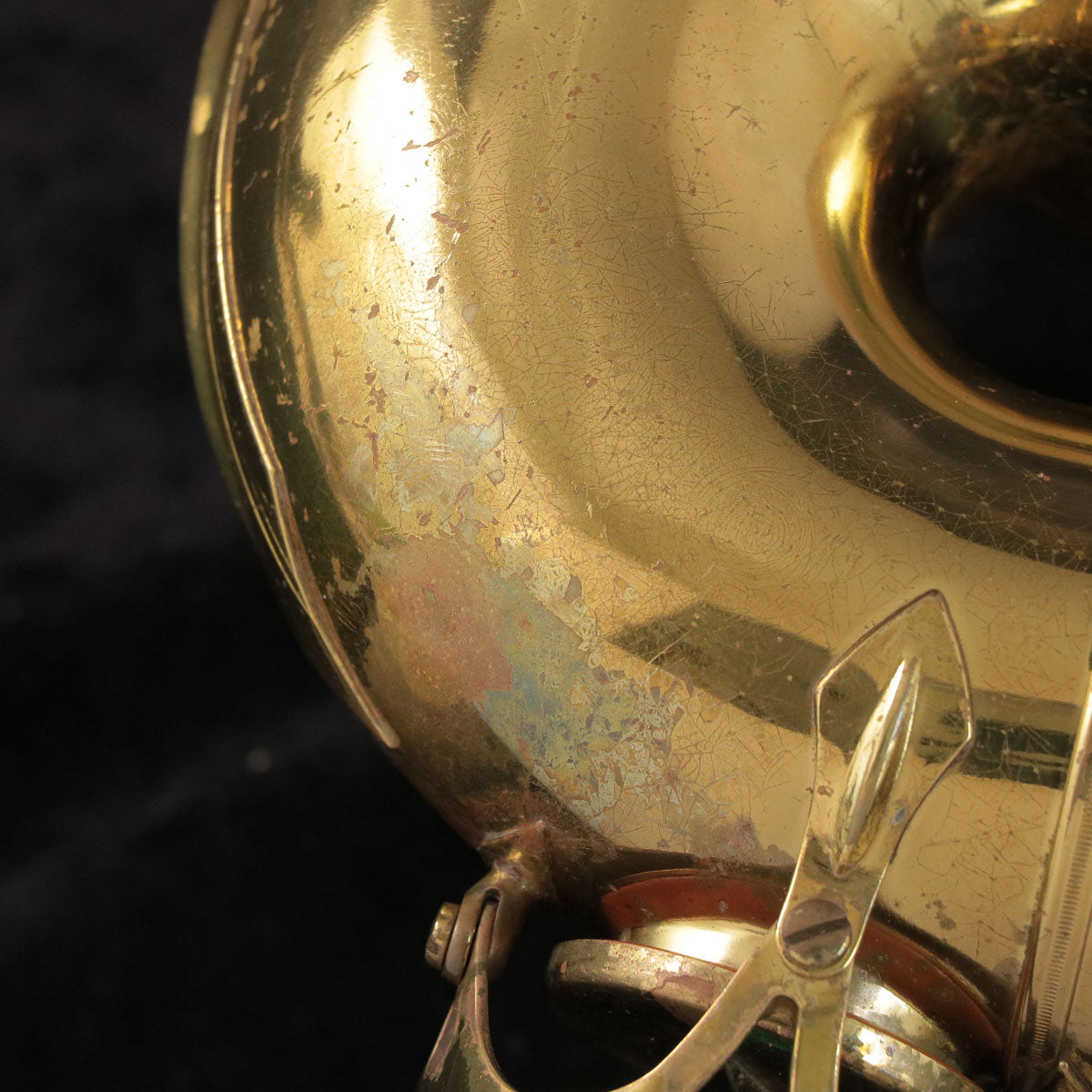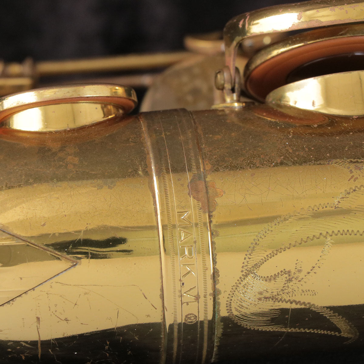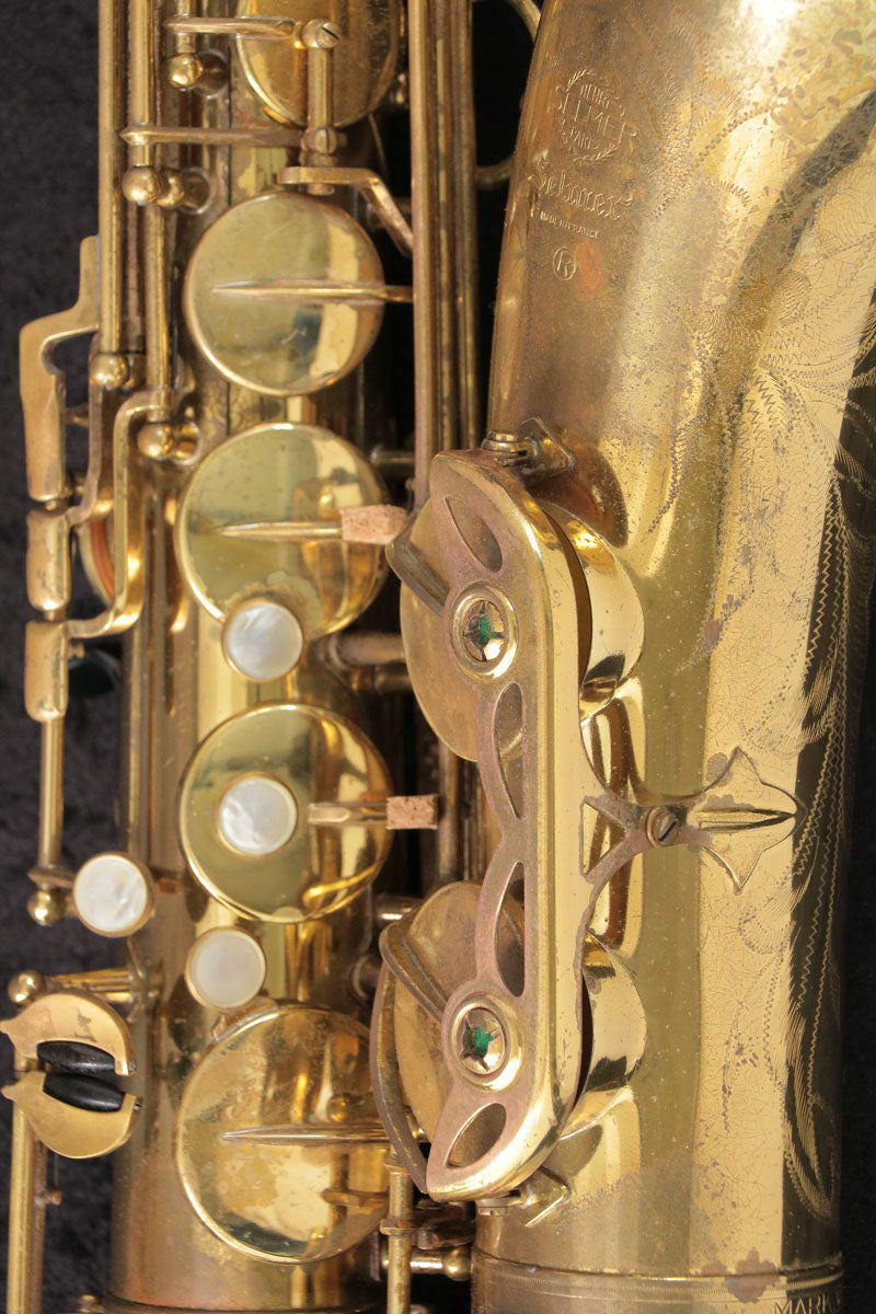 This is a Selmer Mark 6 tenor saxophone, manufactured around 1974. There are some repair marks on the U-tube and the whole body, but there are no problems with the player's condition. All tampos have been replaced and adjusted, so this is a ready-to-play instrument.