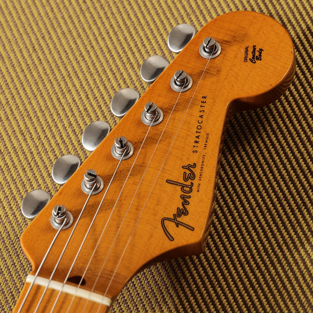 他にも50年代ストラトを意識した8点留めの1Pホワイトピックガード、ブラックドットポジションマーク、スパゲッティロゴを貼ったスモールヘッド、フェンダー刻印サドルのトレモロブリッジ、クルーソンペグを採用しております。