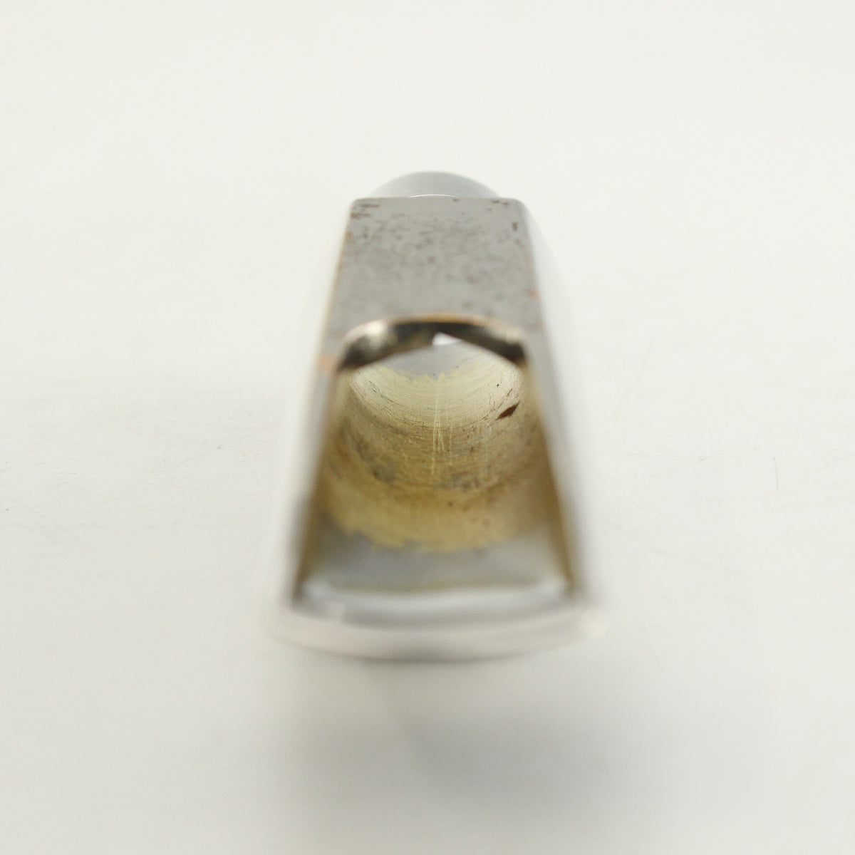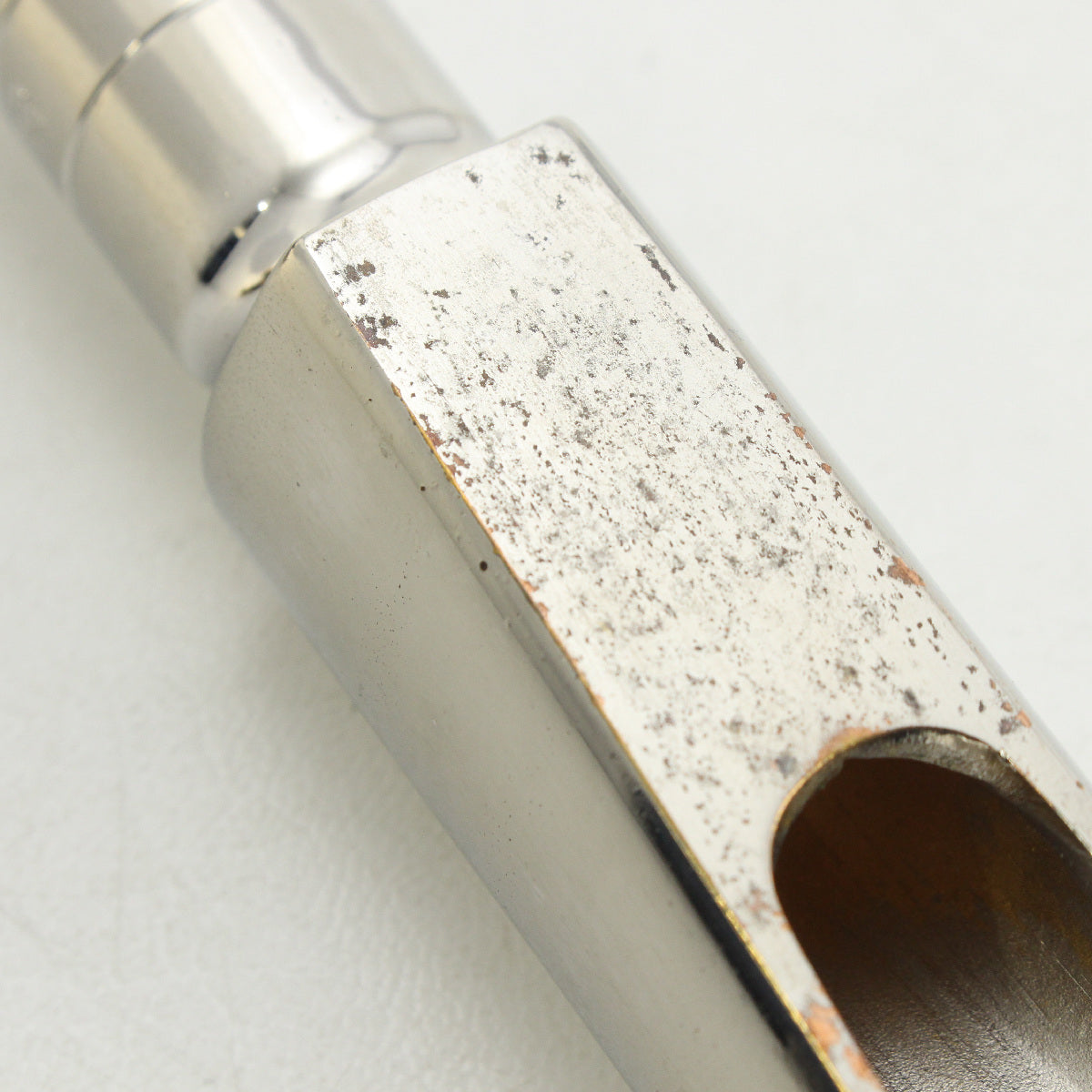 This is a baritone saxophone mouthpiece by Otto Link. This is a rare nickel finish. We are not sure if it was in the regular lineup, but the previous owner seems to have purchased it new. It is a popular and standard mouthpiece for baritone. It has a dark presence and moderate overtones that give it a sense of spaciousness. There is some deterioration of the plating on the table surface, but the overall condition is maintained.
