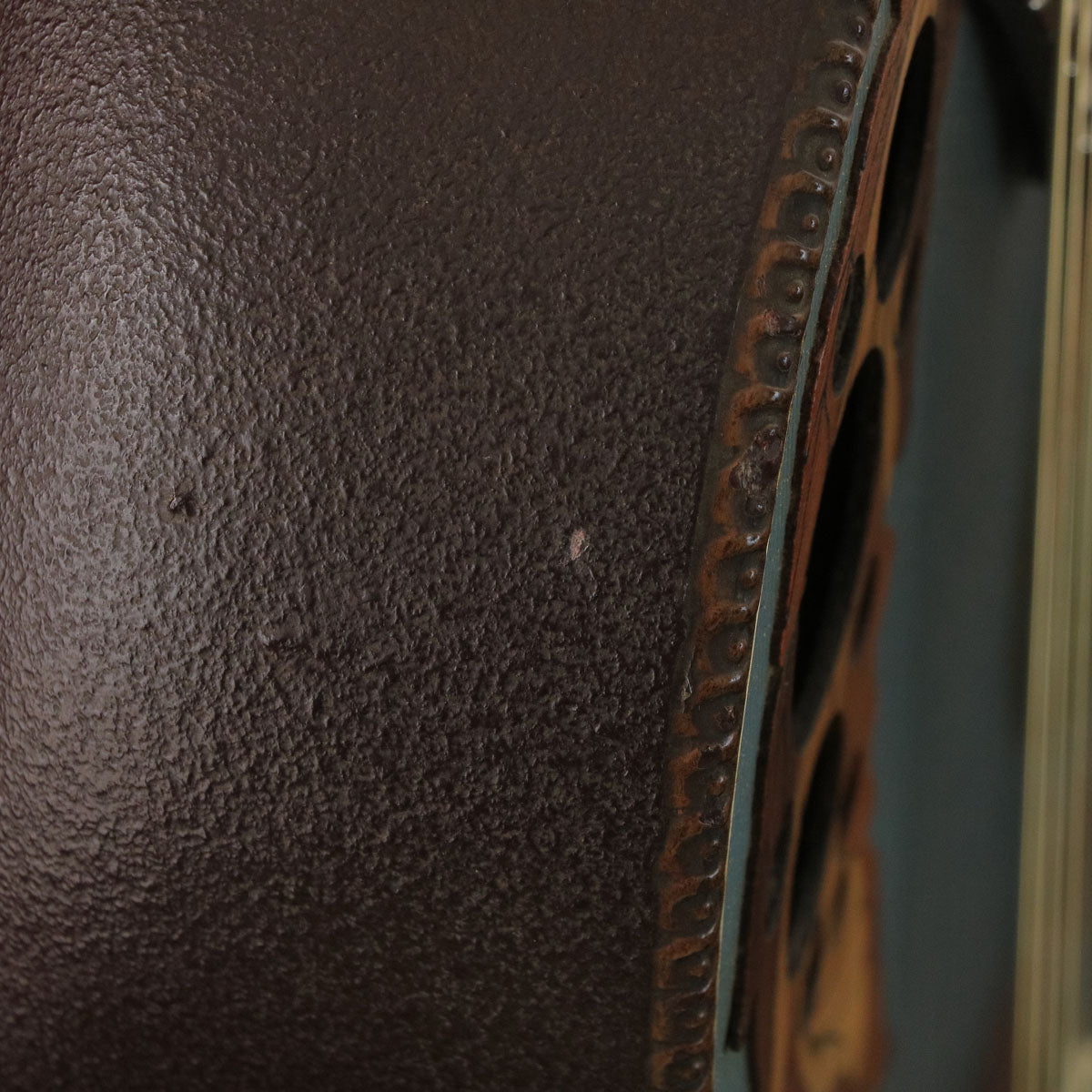 The center of the top is slightly depressed, but there are no signs of peeling of the force wood. There are some scratches and stains on the top and back, dents and weather checks on the back of the neck, and dents on the headstock, as well as chipping and rubbing of the paint on the edges, but no major noticeable damage. The pickguard is painted clear and yellowed, and the plating on the metal parts is rusted, but these are normal signs of use and aging commensurate with the age of the instrument.
