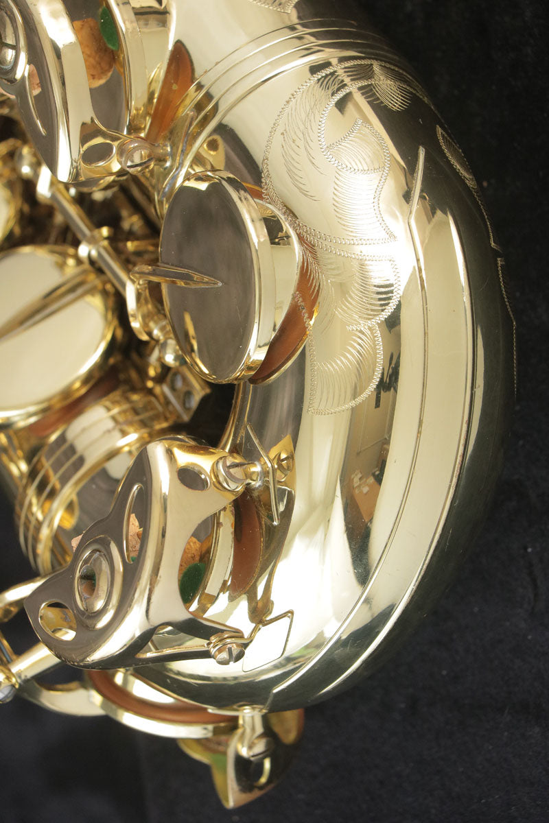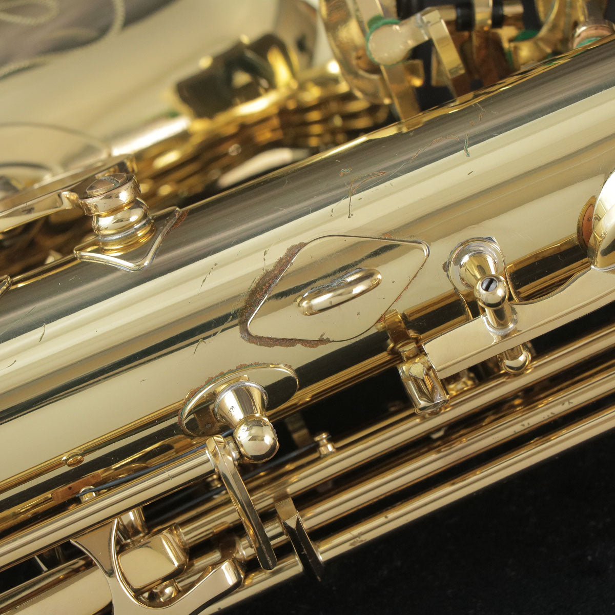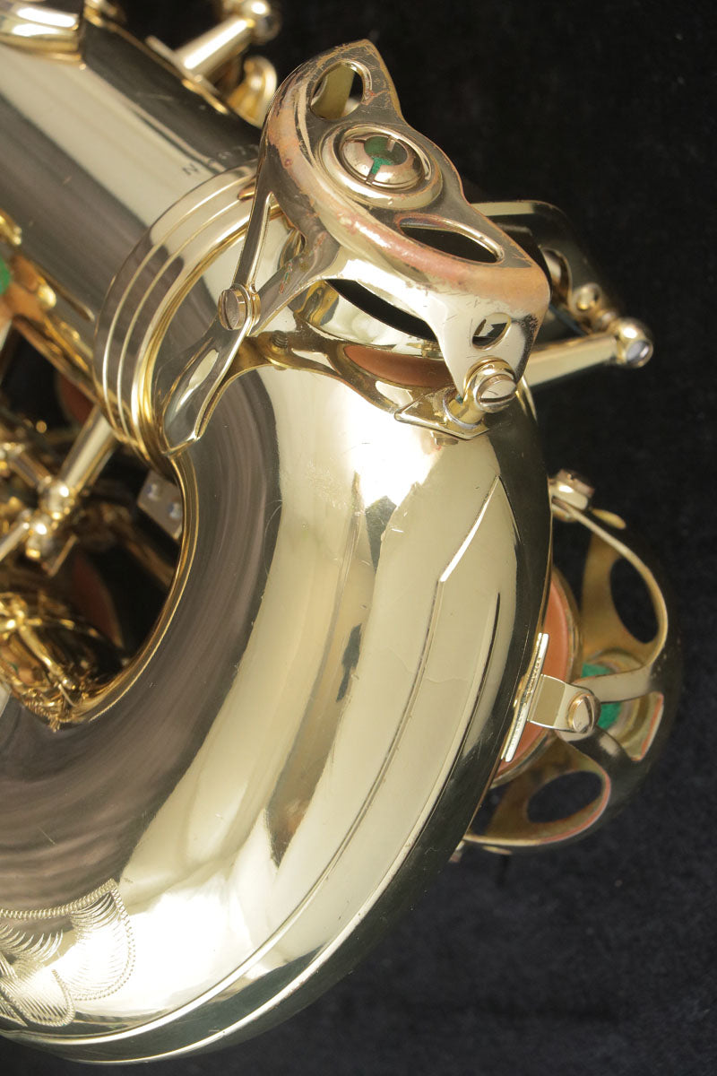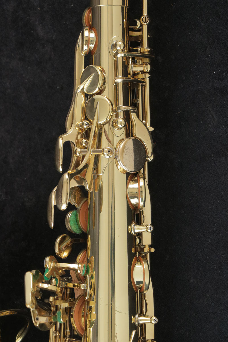 セルマーアルトサックスSERIE3です。2005年頃製造の個体。SA80と異なるキャラクターで高い音程精度、操作性が特徴的でSA80よりも柔らかな音色だと思います。こちらもジャンル問わず人気があり、早いパッセージも得意な印象です。ネックに焼けやラッカー剥げ、キィやキィポスト下やハンダ箇所などに所々のサビ、使用に伴う擦りキズは等の使用感はありますが、目立つ凹みや腐食はなく、使用上は特に問題はございません。全てのタンポを新品交換し、きっちり調整を行っておりますので直ぐに演奏をお楽しみいただけます。
