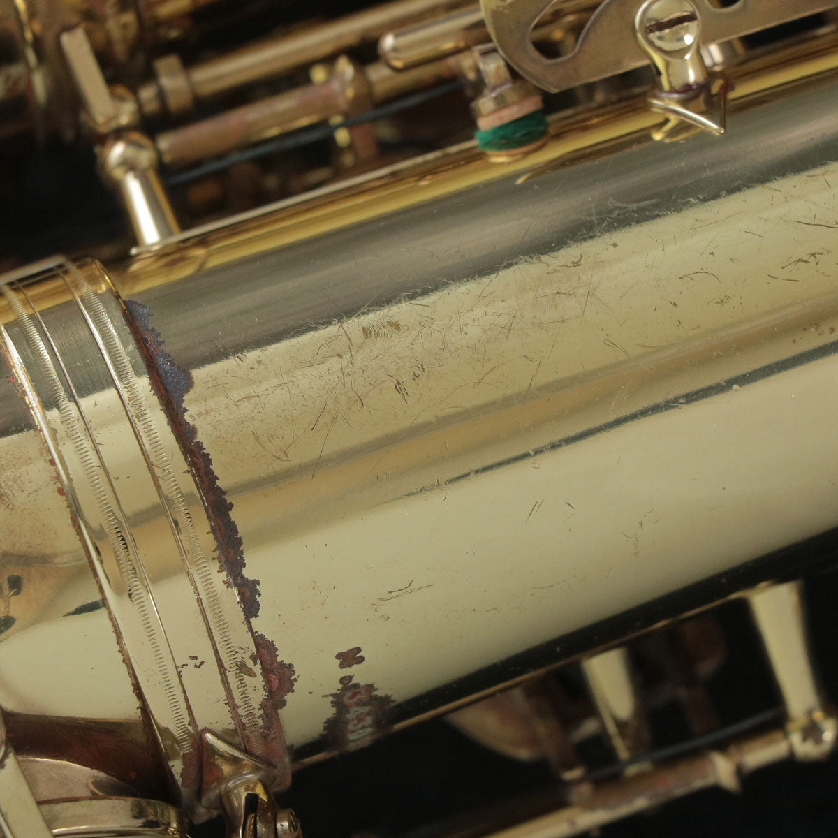U字管-2番管の分解組み立てを含むベル・U字管の凹み修正、2番管・ネックの凹み修正を行っており、モヤモヤとした修正跡や凹凸が残っています。その他、経年劣化や通常使用に伴う傷やラッカー剥がれ、錆、修正跡などの使用感が全体的に見受けられる実用的なコンディションの楽器です。